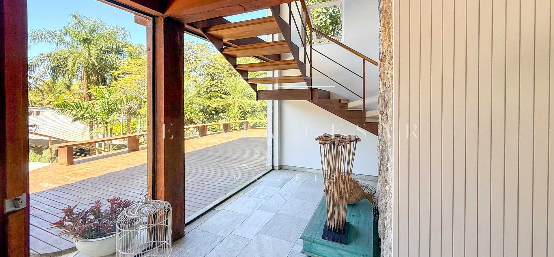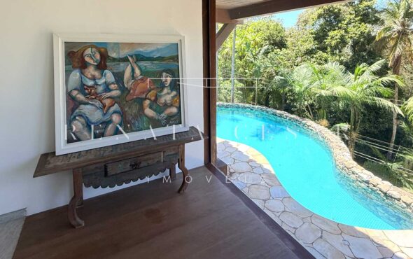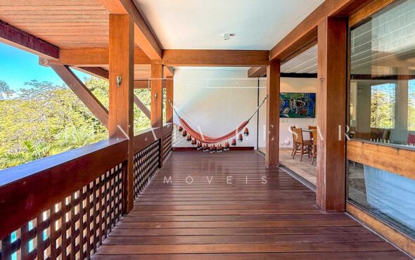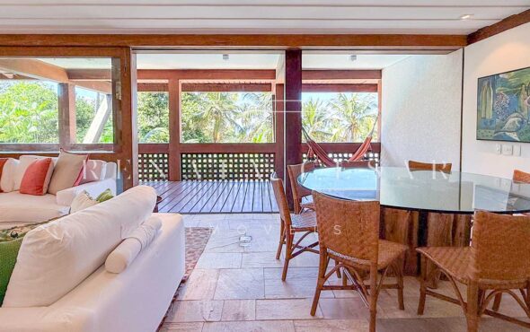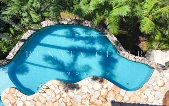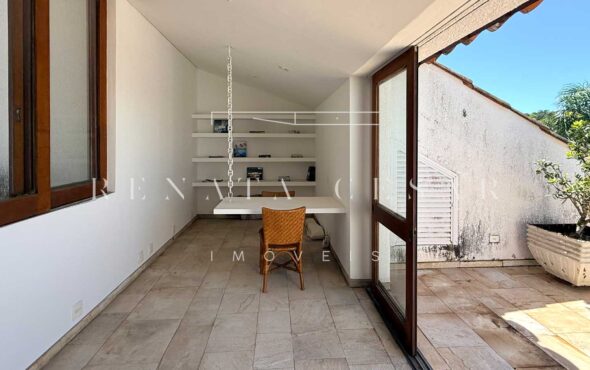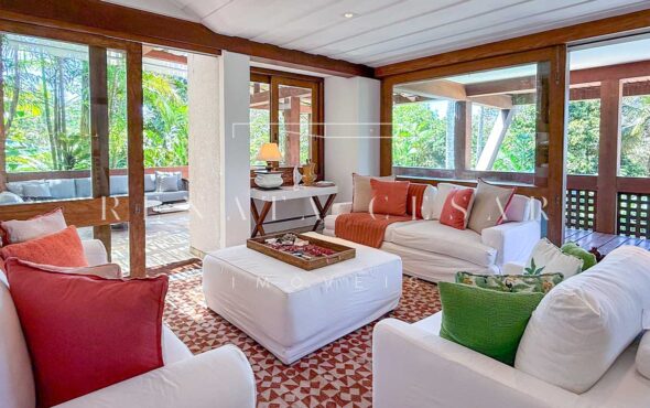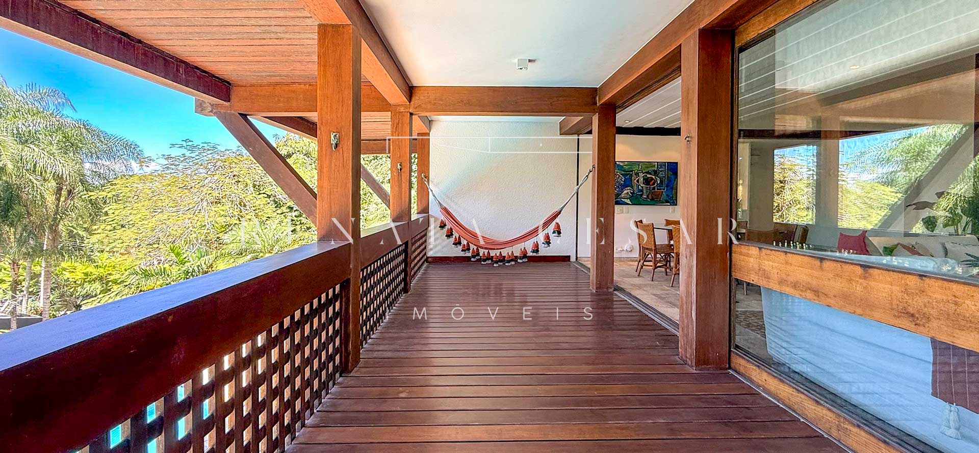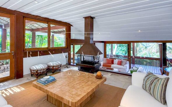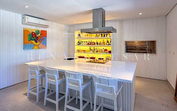 A área social conta com living com duas salas de estar e jantar, integrada a uma varanda em L com sofás, redes e, claro, a vista mar. Há um belo home theater com pé-direito alto, adega, cozinha completa com área de serviço, e ainda uma cozinha gourmet que serve a área externa com piscina. Do escritório no último andar, a vista para a praia é encantadora.