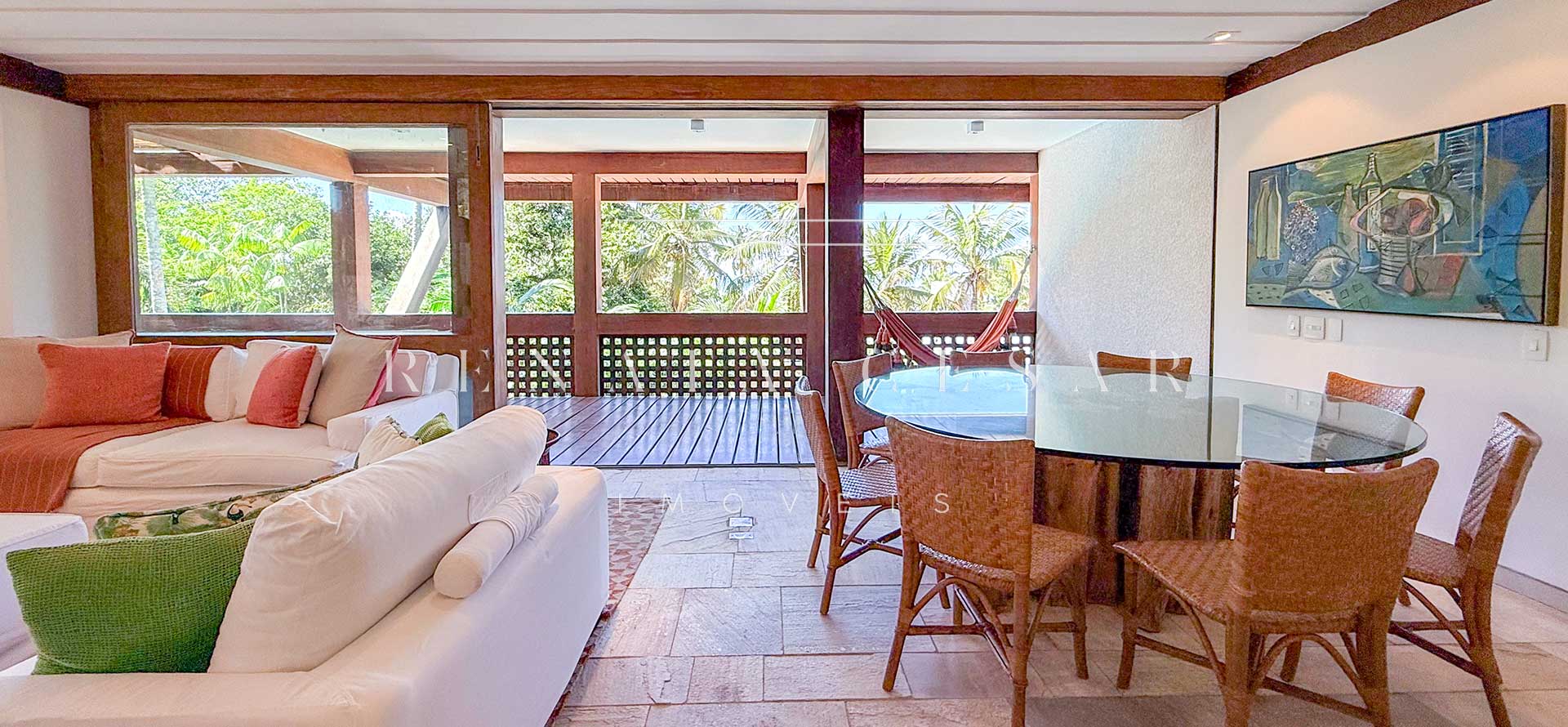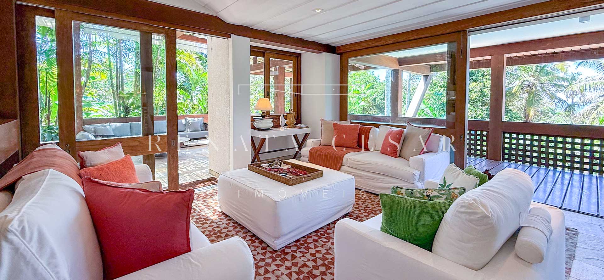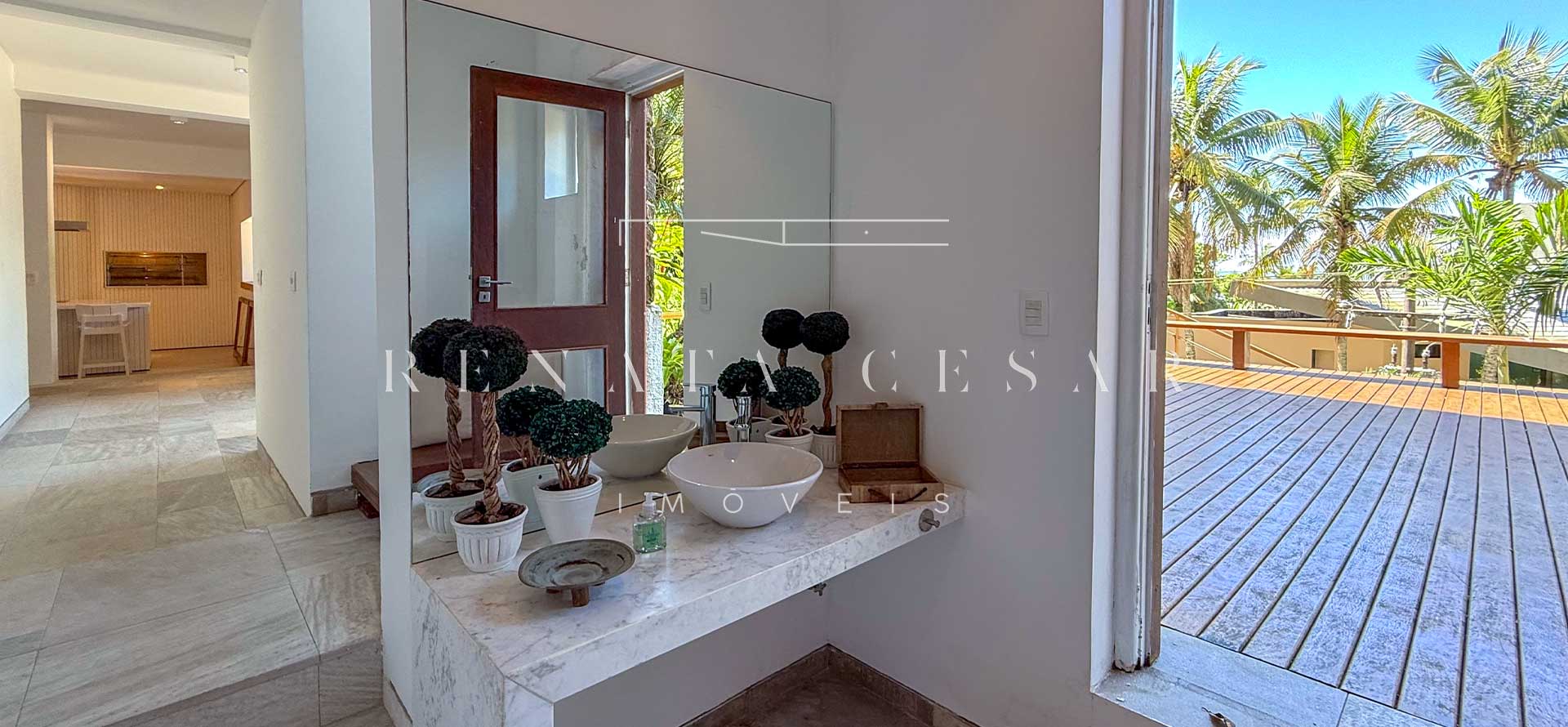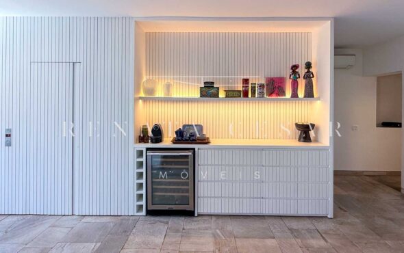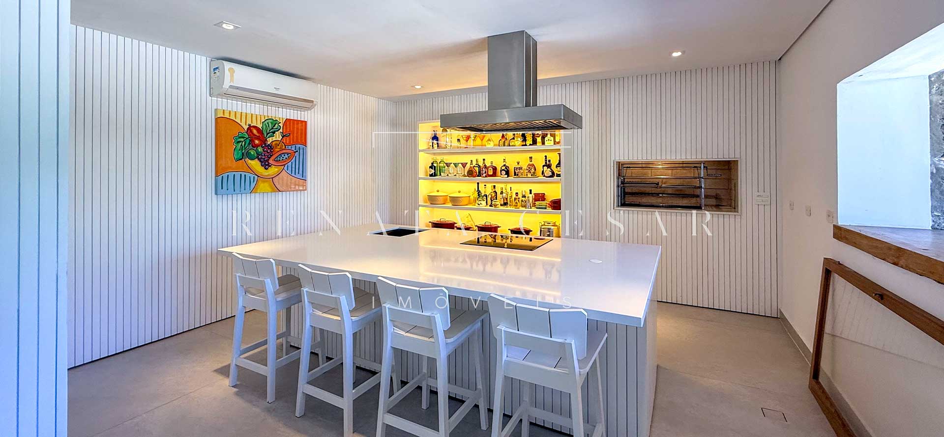 A área social conta com living com duas salas de estar e jantar, integrada a uma varanda em L com sofás, redes e, claro, a vista mar. Há um belo home theater com pé-direito alto, adega, cozinha completa com área de serviço, e ainda uma cozinha gourmet que serve a área externa com piscina. Do escritório no último andar, a vista para a praia é encantadora.