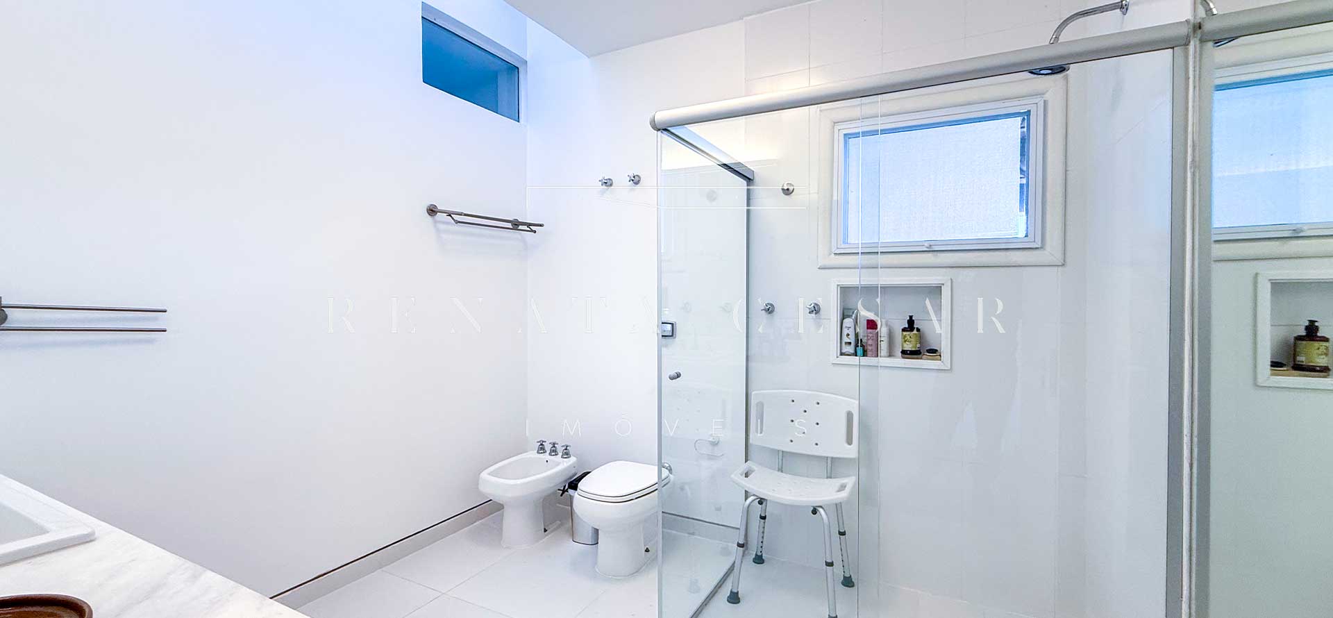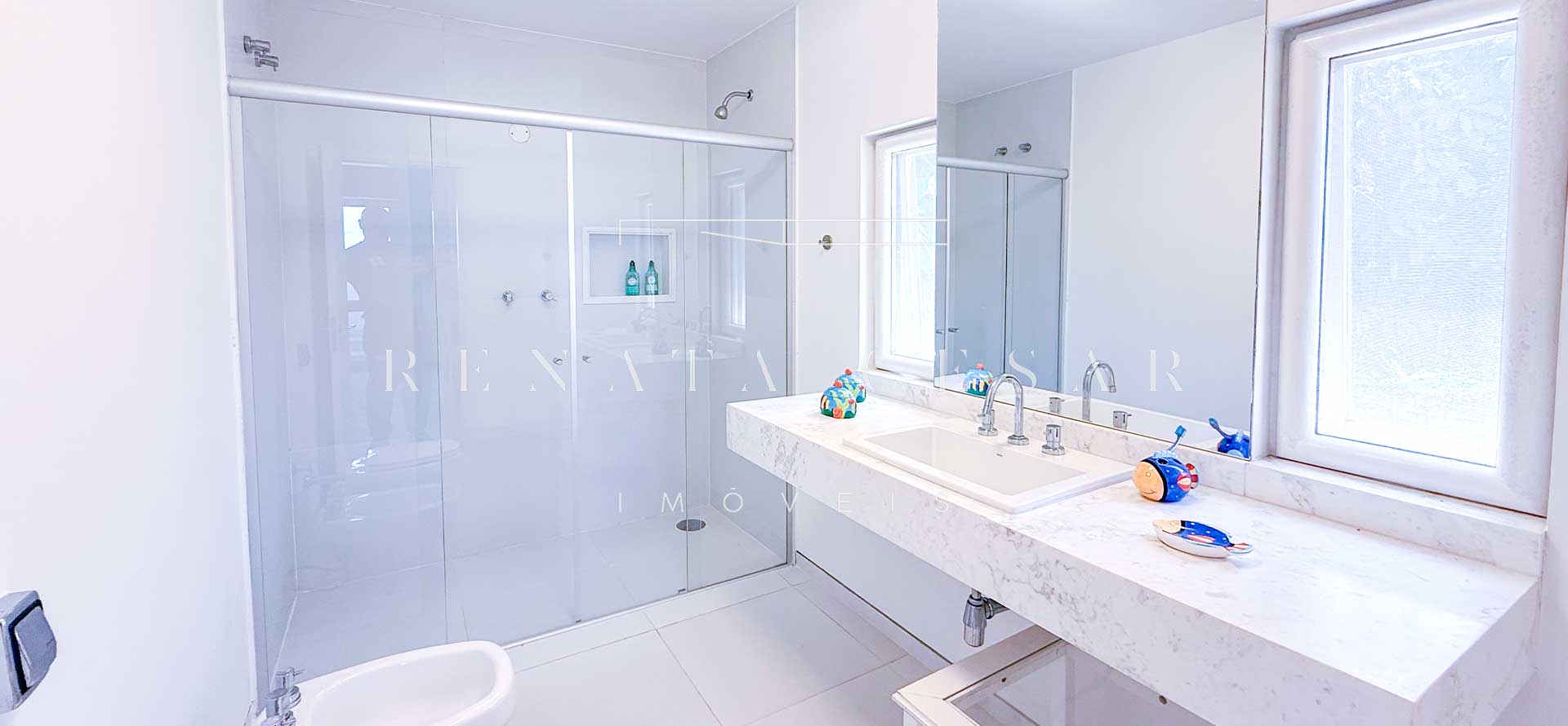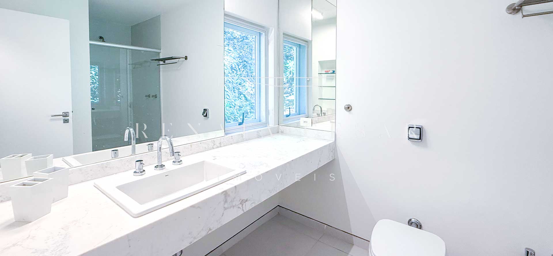 São 06 suítes completas, todas amplas, climatizadas e com janelas generosas, algumas com varanda. A suíte principal é enorme, também com vista-mar, banheiro duplo e uma banheira de hidromassagem maravilhosa para relaxar ao fim do dia.