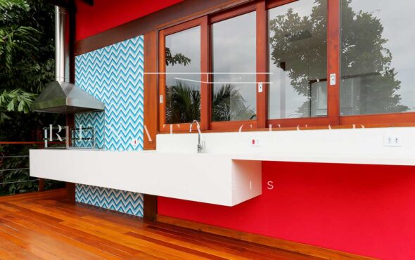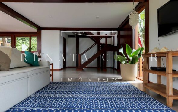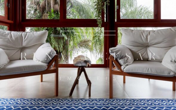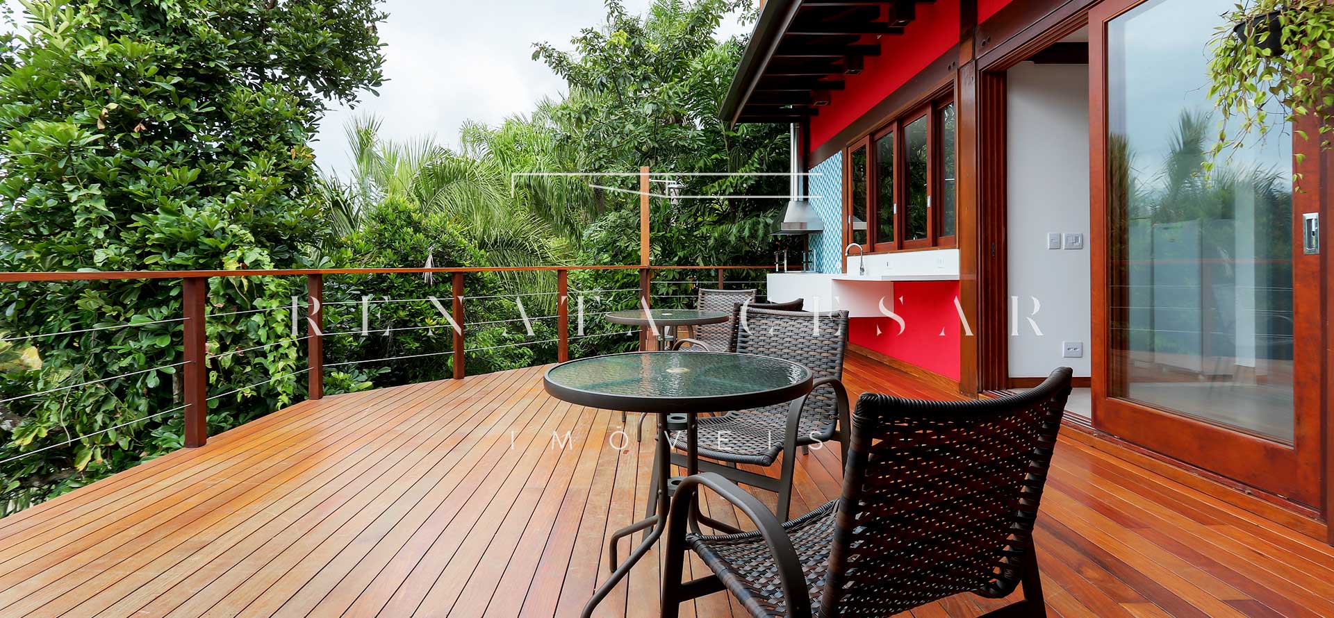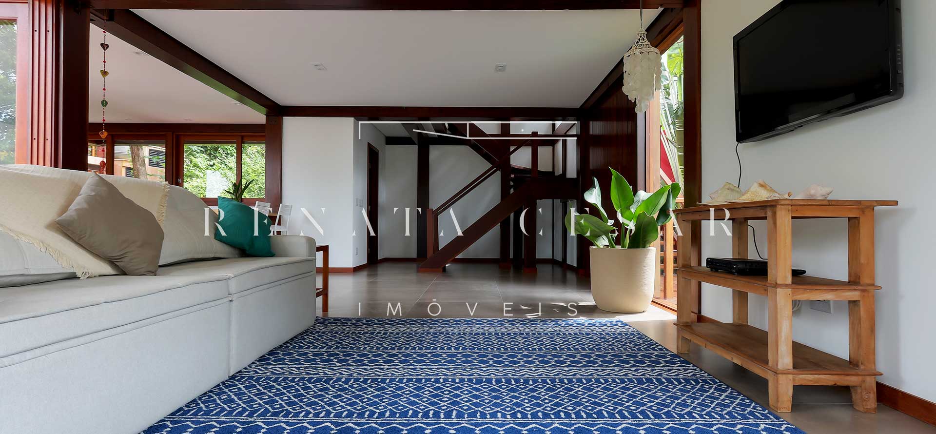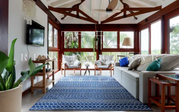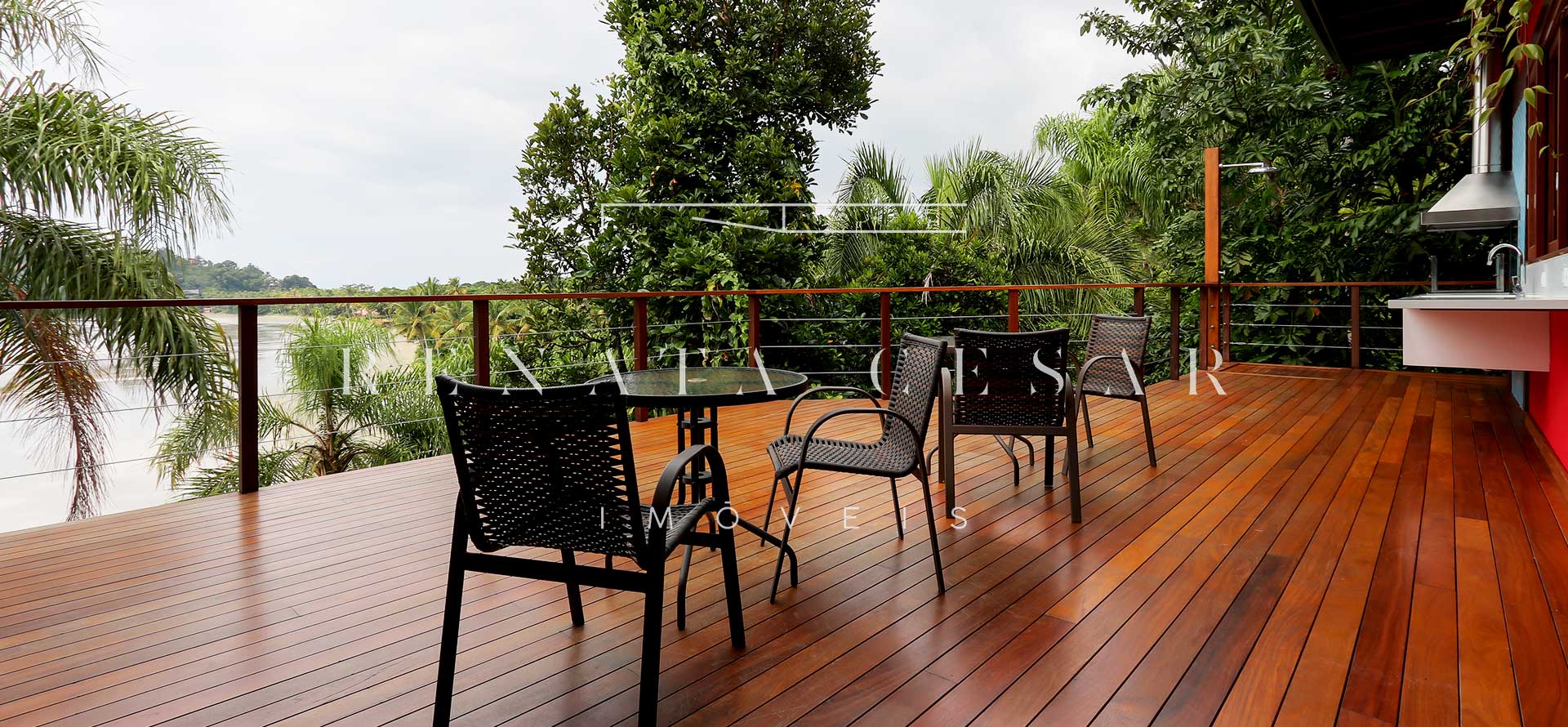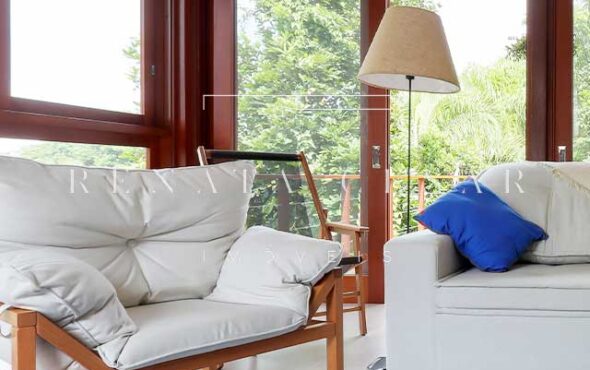 Na área externa, há um terraço generoso com churrasqueira, perfeito para aquelas suas festas e reuniões familiares. Tomar o sol da manhã ali entre as árvores é outra atividade fortemente recomendada. Bateu a vontade de banhar na água? Logo ali, a 100 metros, o mar está à sua disposição, além da cachoeira do Iporanga. Um luxo.