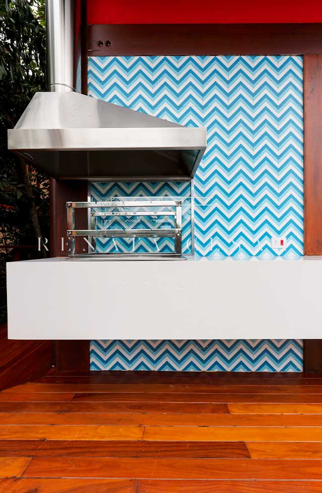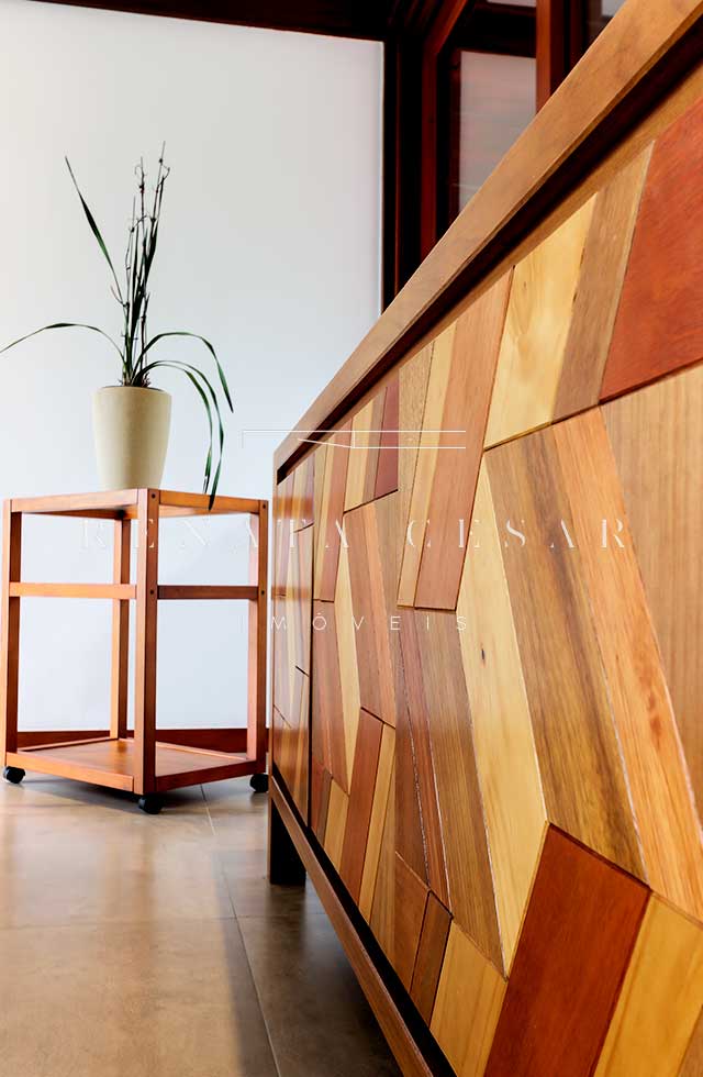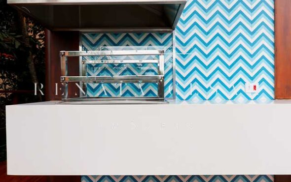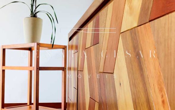 Na área social construída em L, fica o living com sala de estar, sala de jantar e uma cozinha equipada que integra-se ao restante por uma porta de correr. Tudo isso rodeado por paredes envidraçadas que valorizam a luz e ligam o interior ao terraço de madeira.