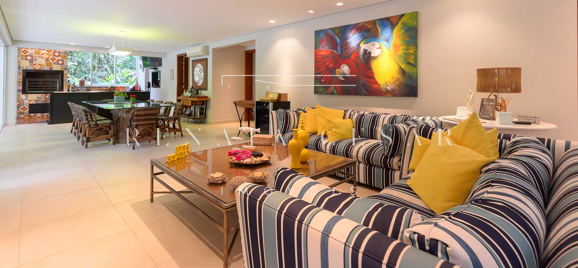 O living integrado à sala de jantar e aberto para o gramado passa uma sensação gostosa de fluidez. Tons claros nos acabamentos e muita luz natural ajudam a ampliar o espaço, que conta com uma decoração alegre cheia de pontos de cor.