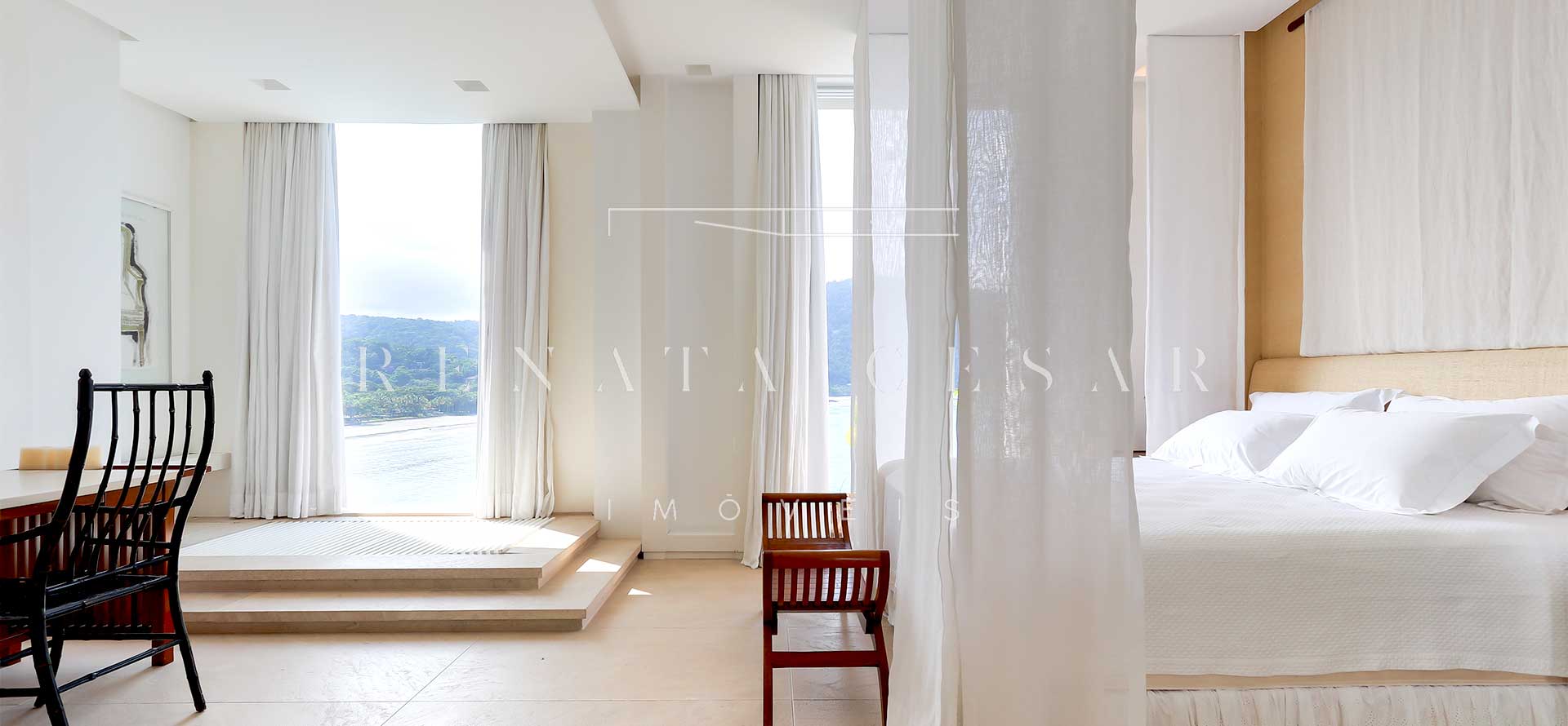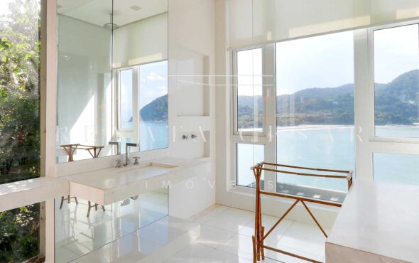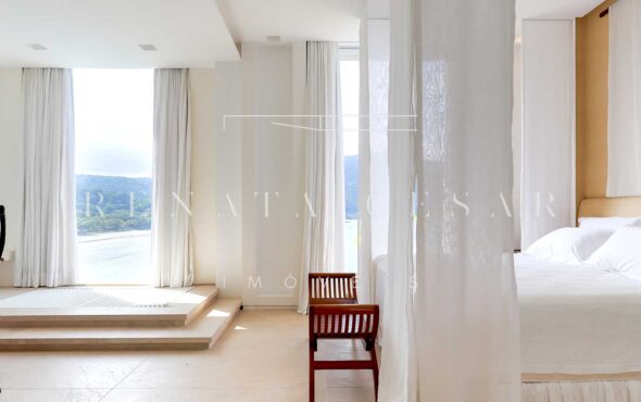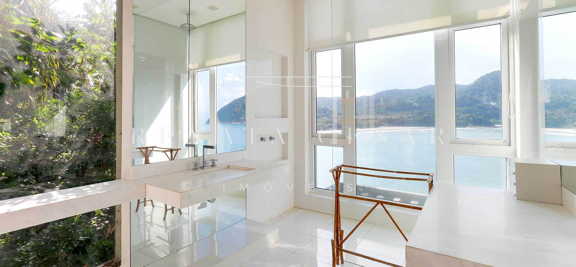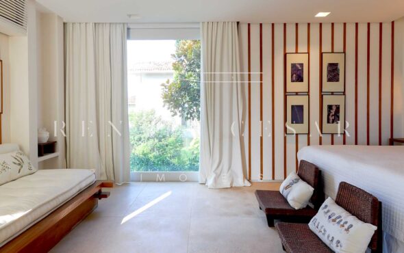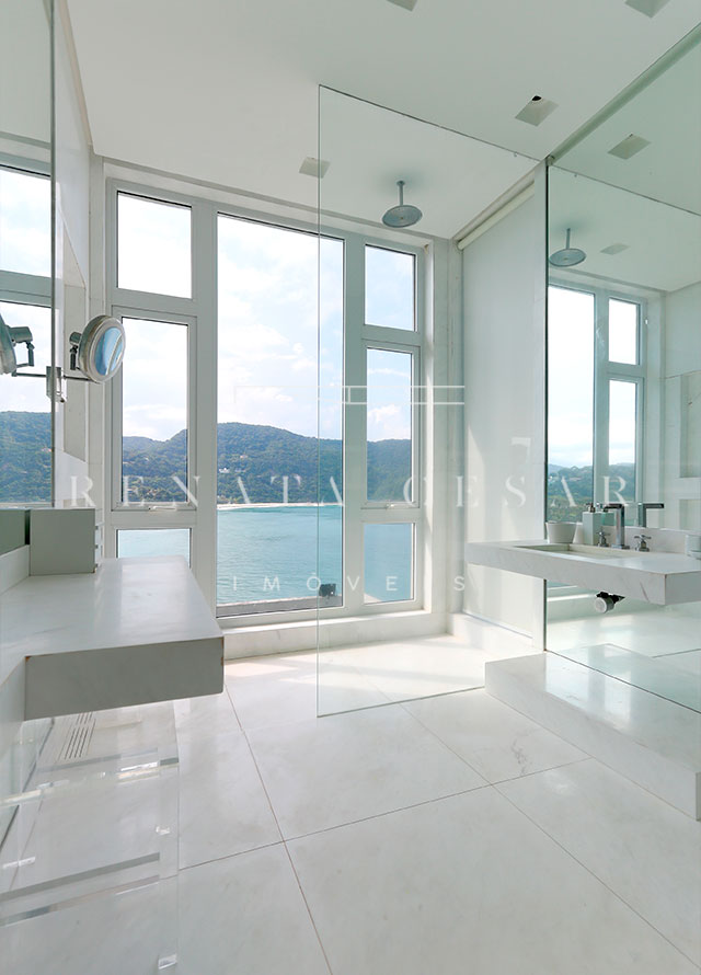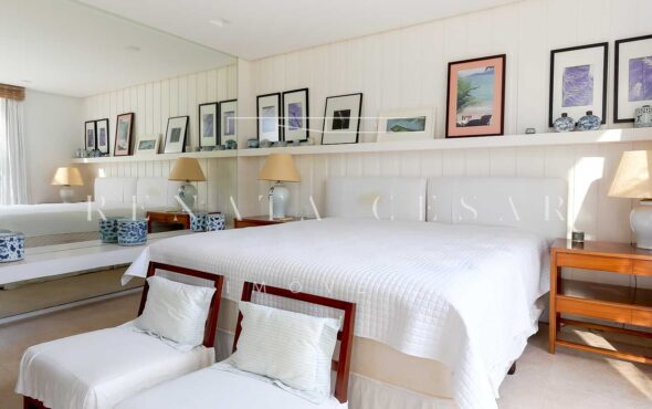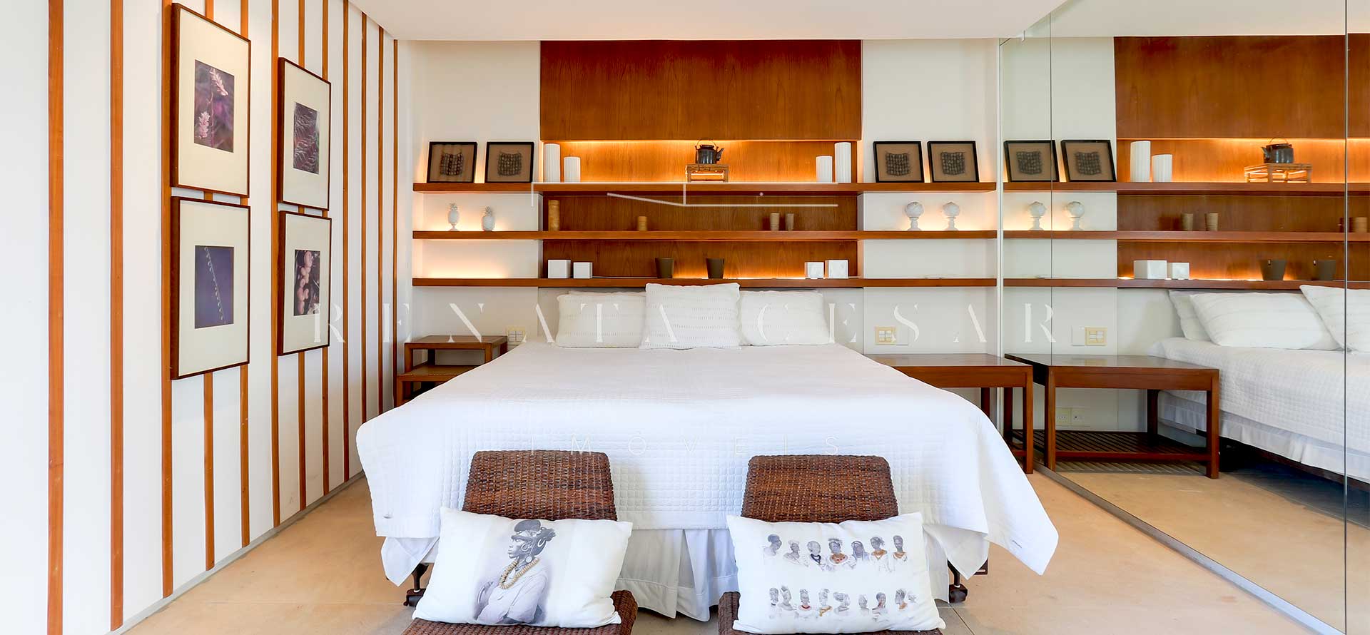 São 08 suítes distribuídas em três pisos da casa (e acessíveis via elevador), a maioria com vista-mar, mas também algumas com vista lateral, para a mata nativa do Condomínio. Tudo com ar-condicionado, muita privacidade e um design elegante e aconchegante ao mesmo tempo. A suíte principal conta com jacuzzi, deck de madeira, um terraço próprio com vista para o oceano e um banheiro único: superamplo e com paredes envidraçadas que permitem um contato todo especial com o exterior.