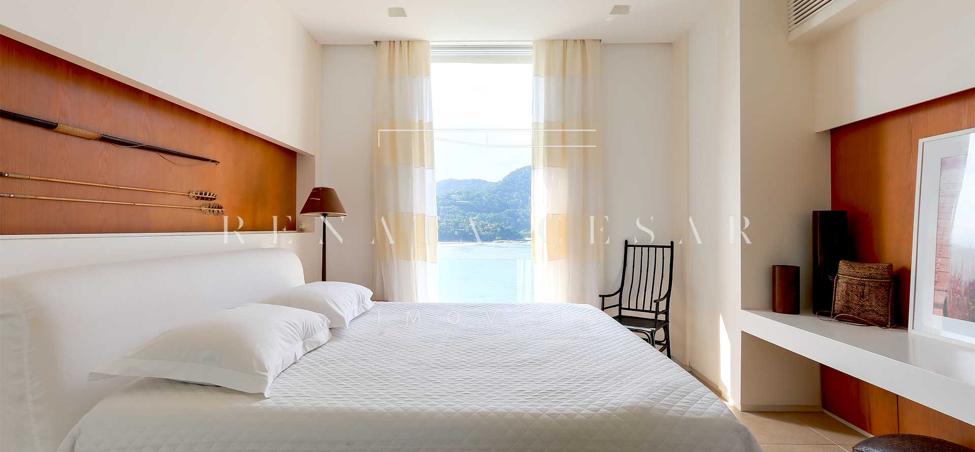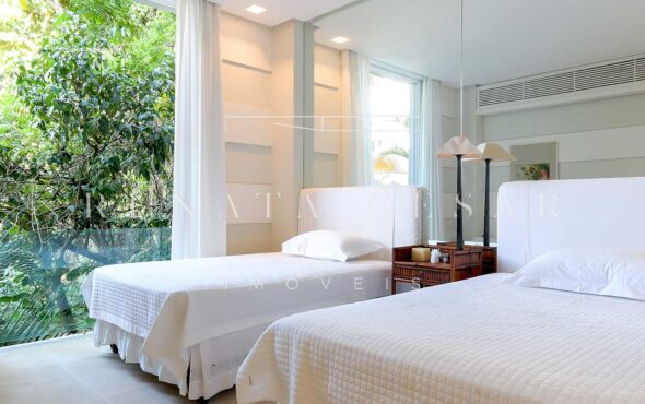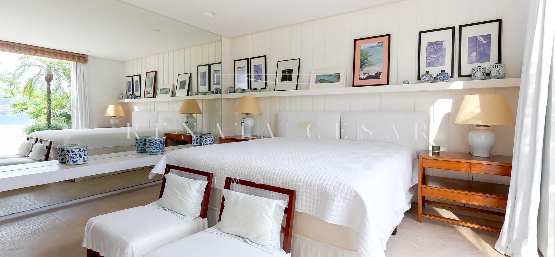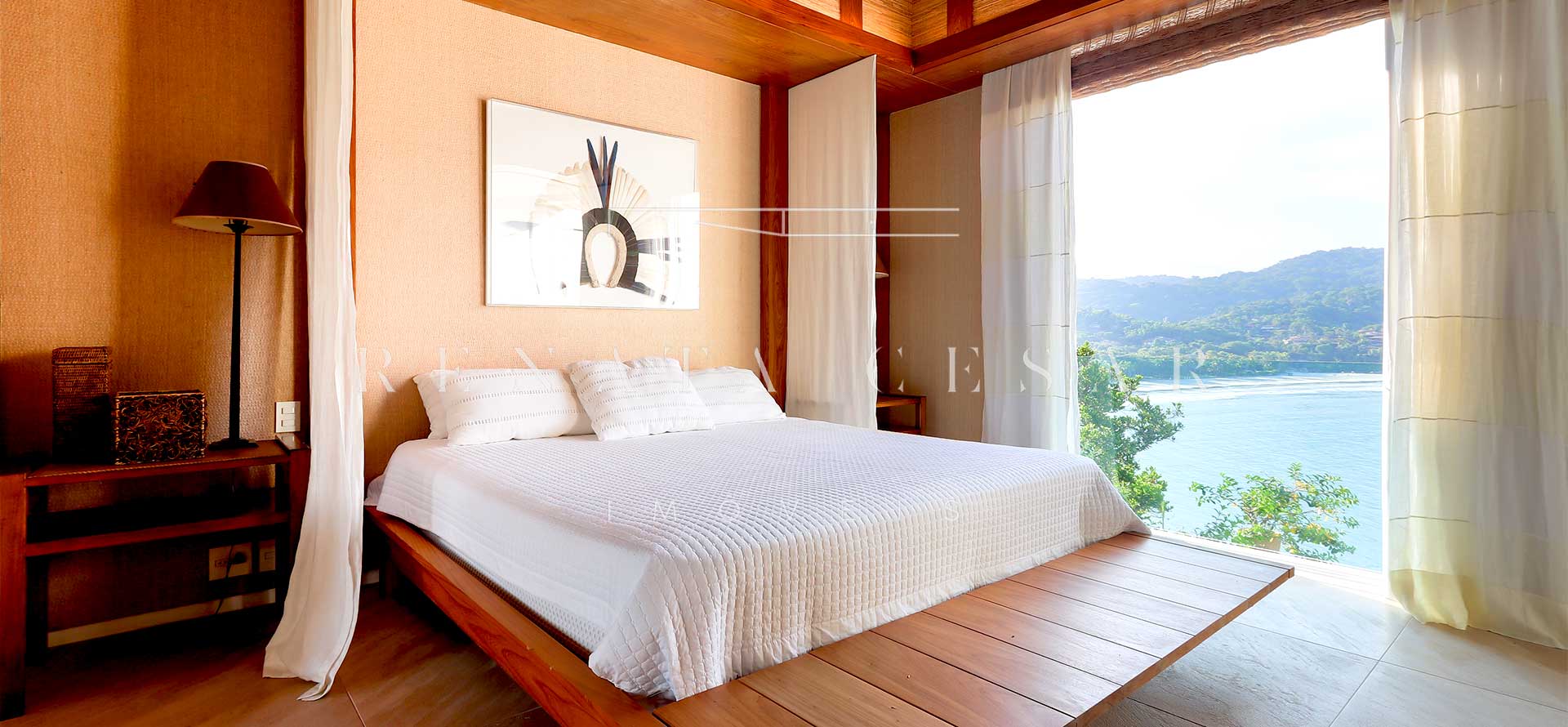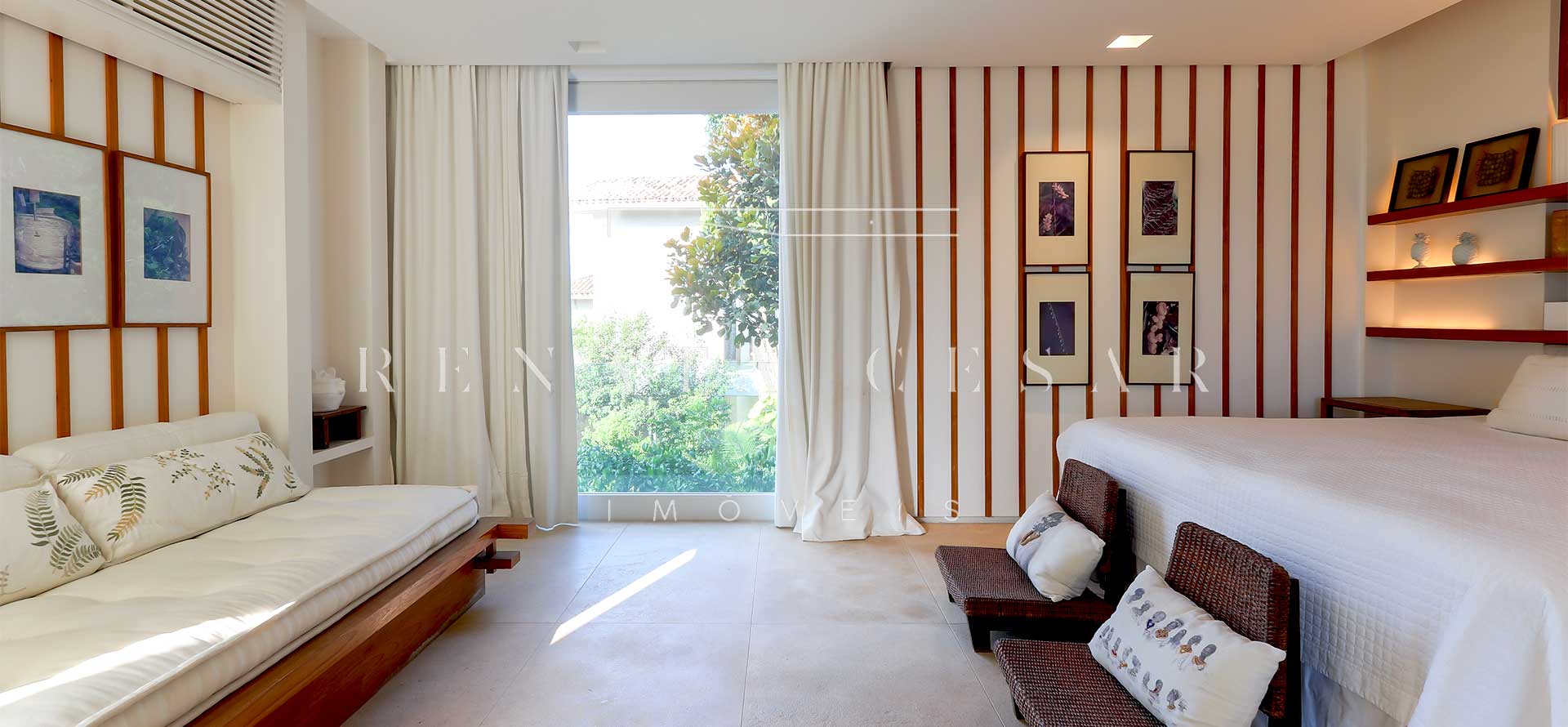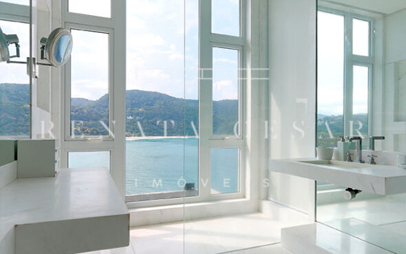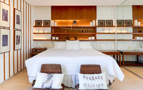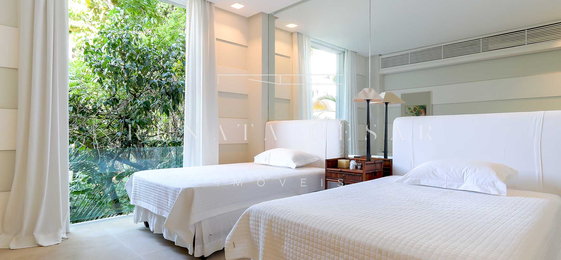 São 08 suítes distribuídas em três pisos da casa (e acessíveis via elevador), a maioria com vista-mar, mas também algumas com vista lateral, para a mata nativa do Condomínio. Tudo com ar-condicionado, muita privacidade e um design elegante e aconchegante ao mesmo tempo. A suíte principal conta com jacuzzi, deck de madeira, um terraço próprio com vista para o oceano e um banheiro único: superamplo e com paredes envidraçadas que permitem um contato todo especial com o exterior.