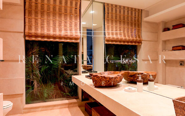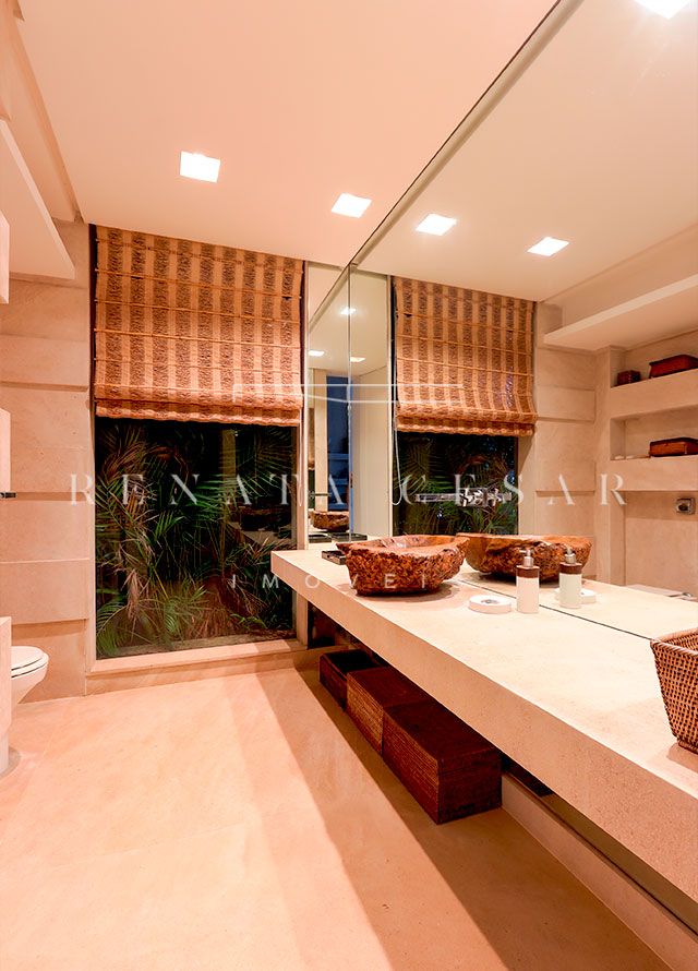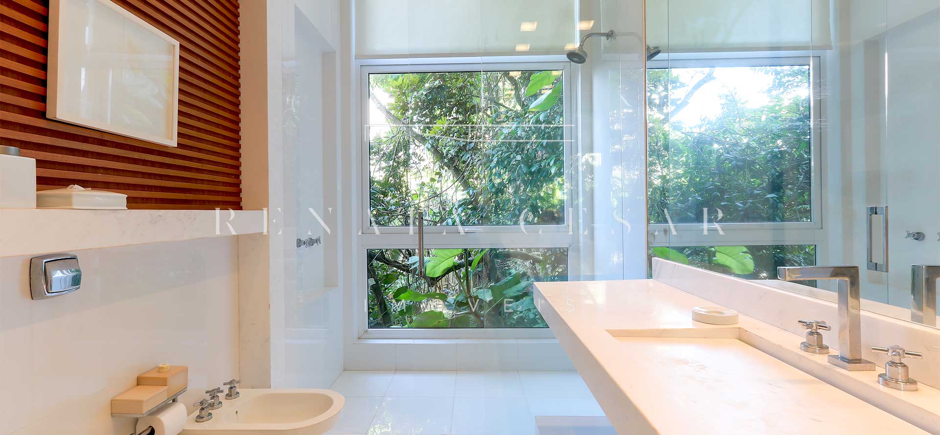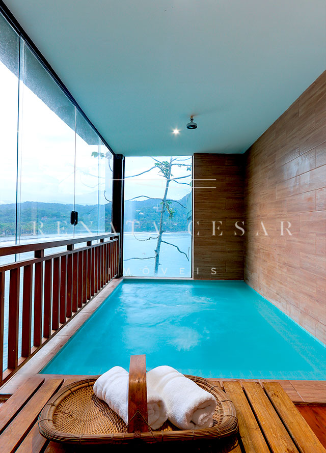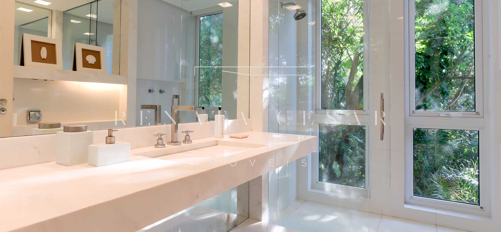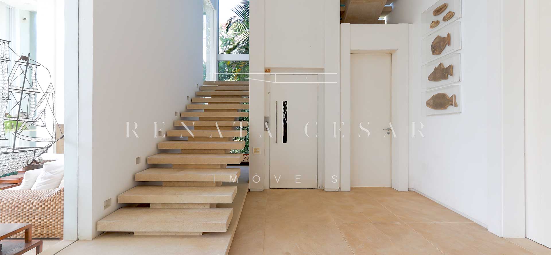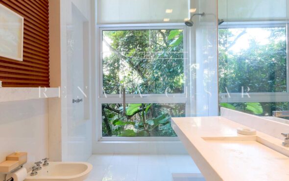 São 08 suítes distribuídas em três pisos da casa (e acessíveis via elevador), a maioria com vista-mar, mas também algumas com vista lateral, para a mata nativa do Condomínio. Tudo com ar-condicionado, muita privacidade e um design elegante e aconchegante ao mesmo tempo. A suíte principal conta com jacuzzi, deck de madeira, um terraço próprio com vista para o oceano e um banheiro único: superamplo e com paredes envidraçadas que permitem um contato todo especial com o exterior.