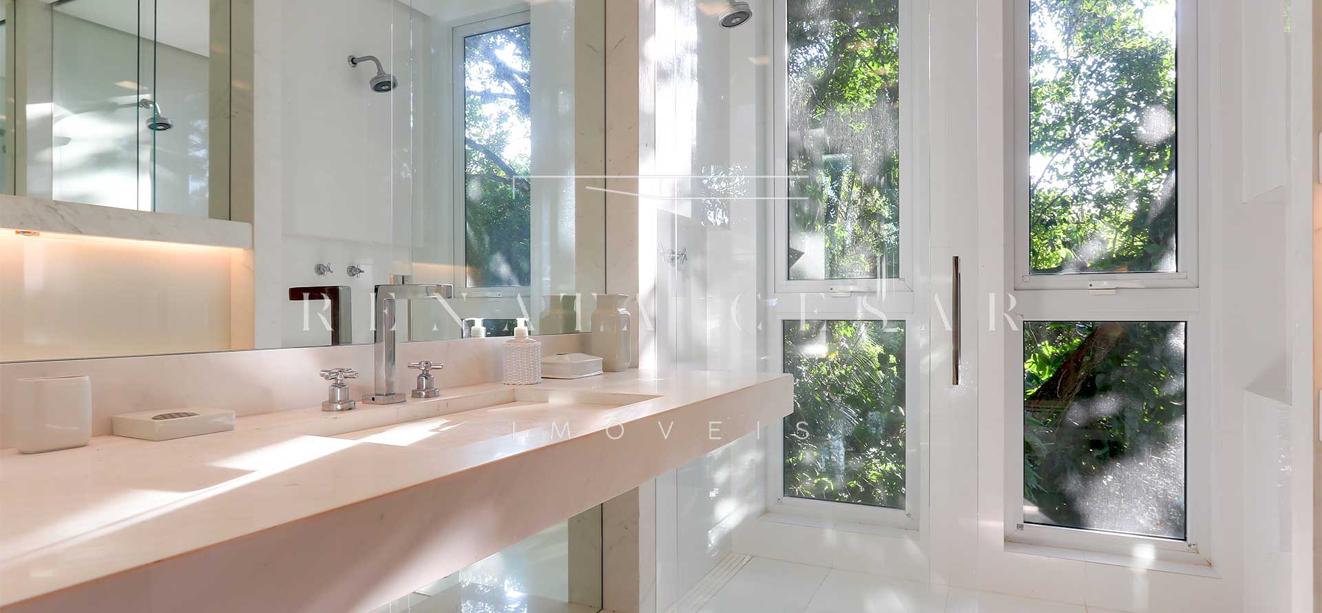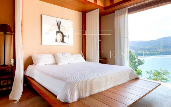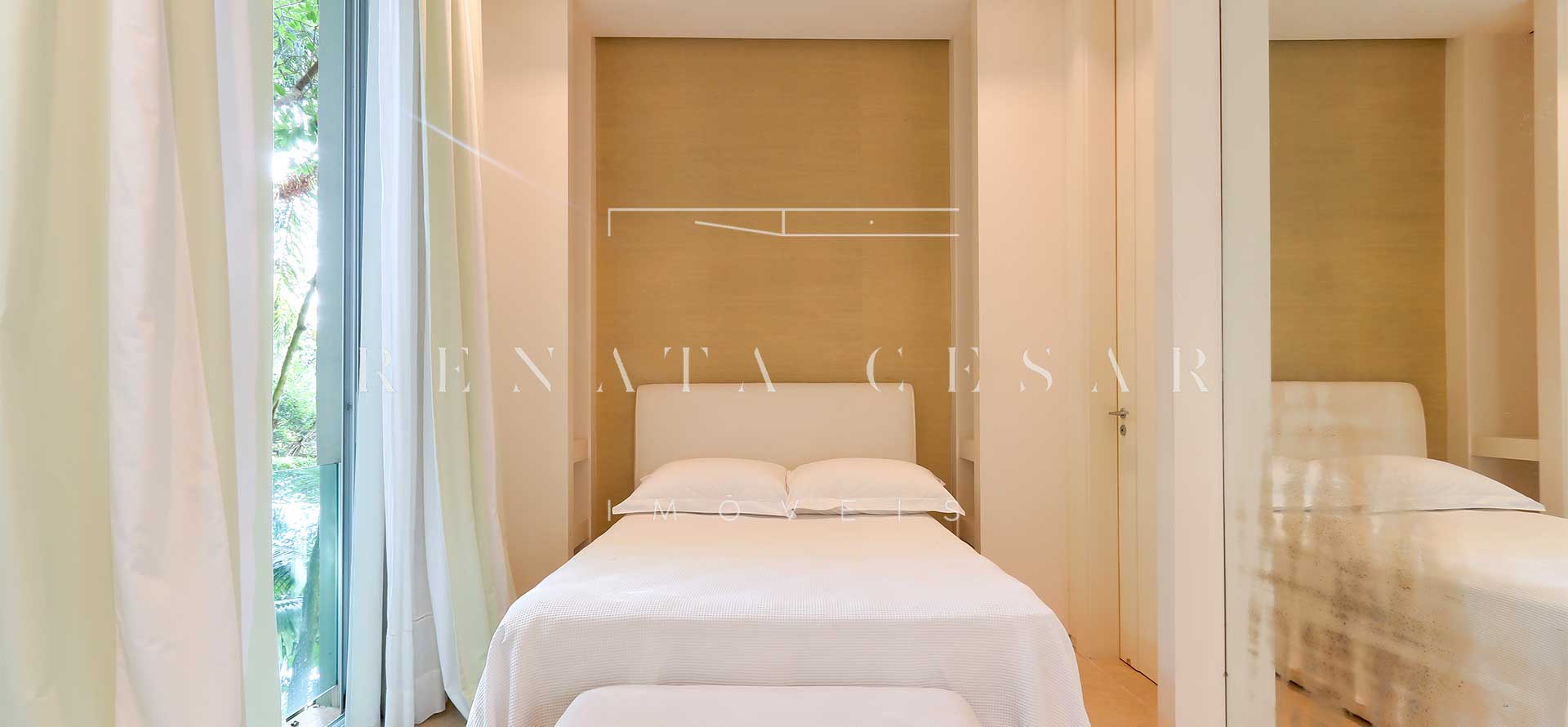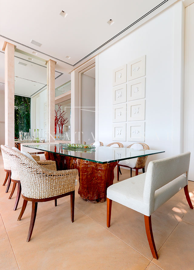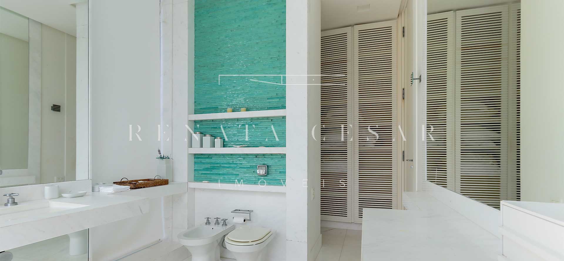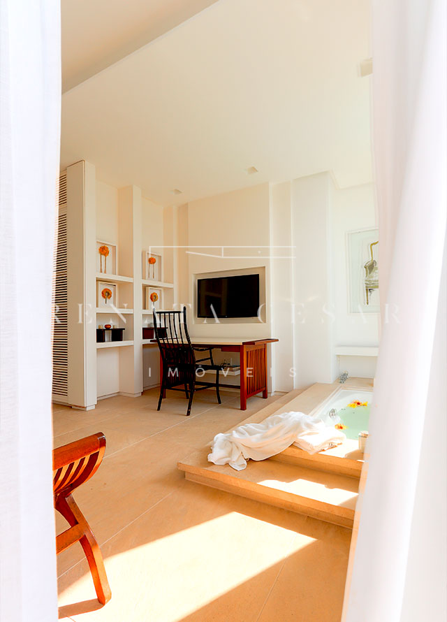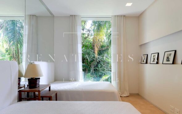 São 08 suítes distribuídas em três pisos da casa (e acessíveis via elevador), a maioria com vista-mar, mas também algumas com vista lateral, para a mata nativa do Condomínio. Tudo com ar-condicionado, muita privacidade e um design elegante e aconchegante ao mesmo tempo. A suíte principal conta com jacuzzi, deck de madeira, um terraço próprio com vista para o oceano e um banheiro único: superamplo e com paredes envidraçadas que permitem um contato todo especial com o exterior.