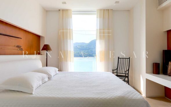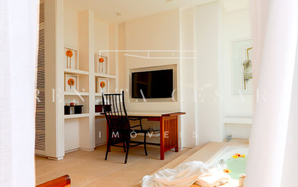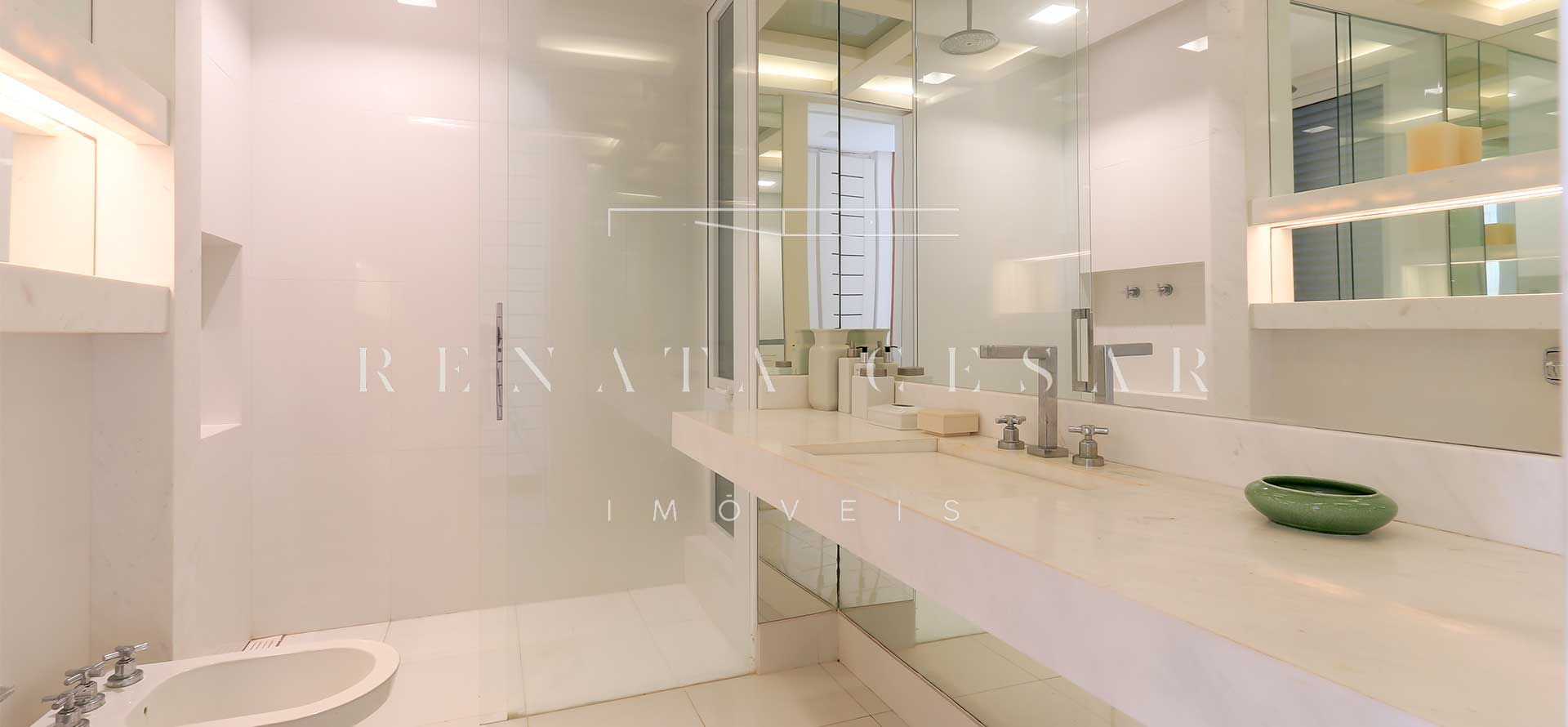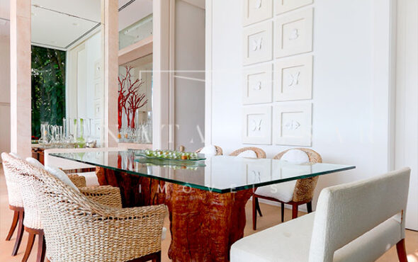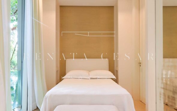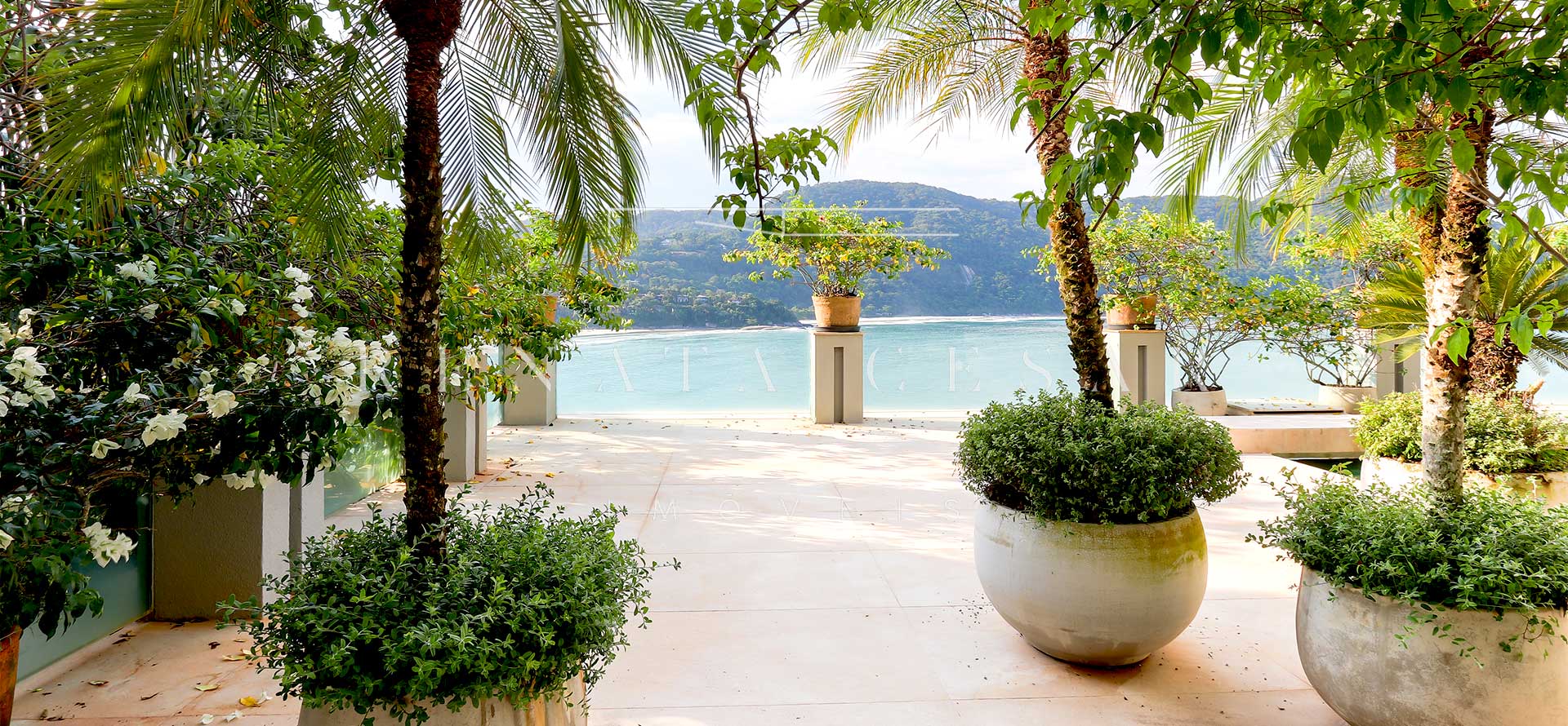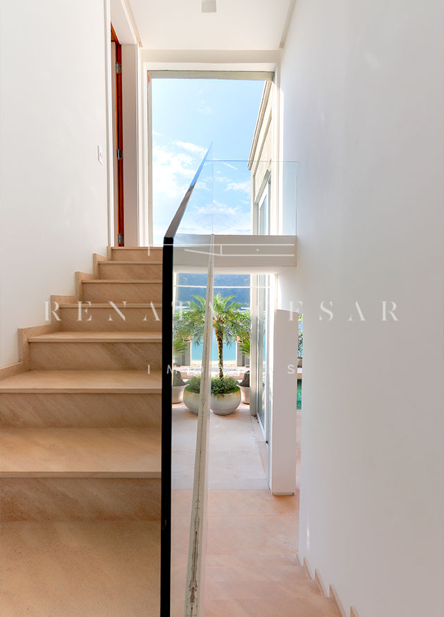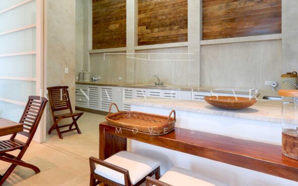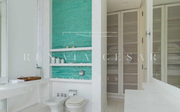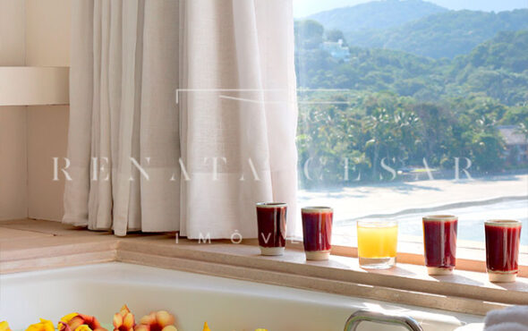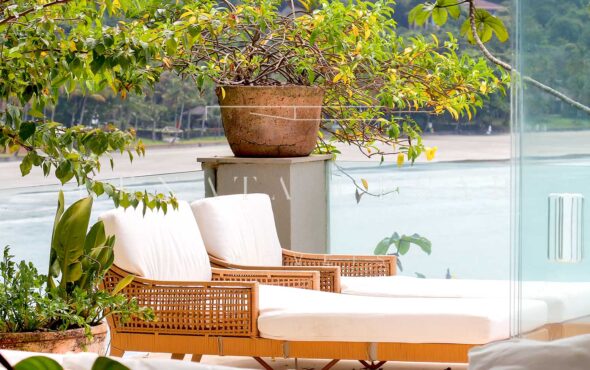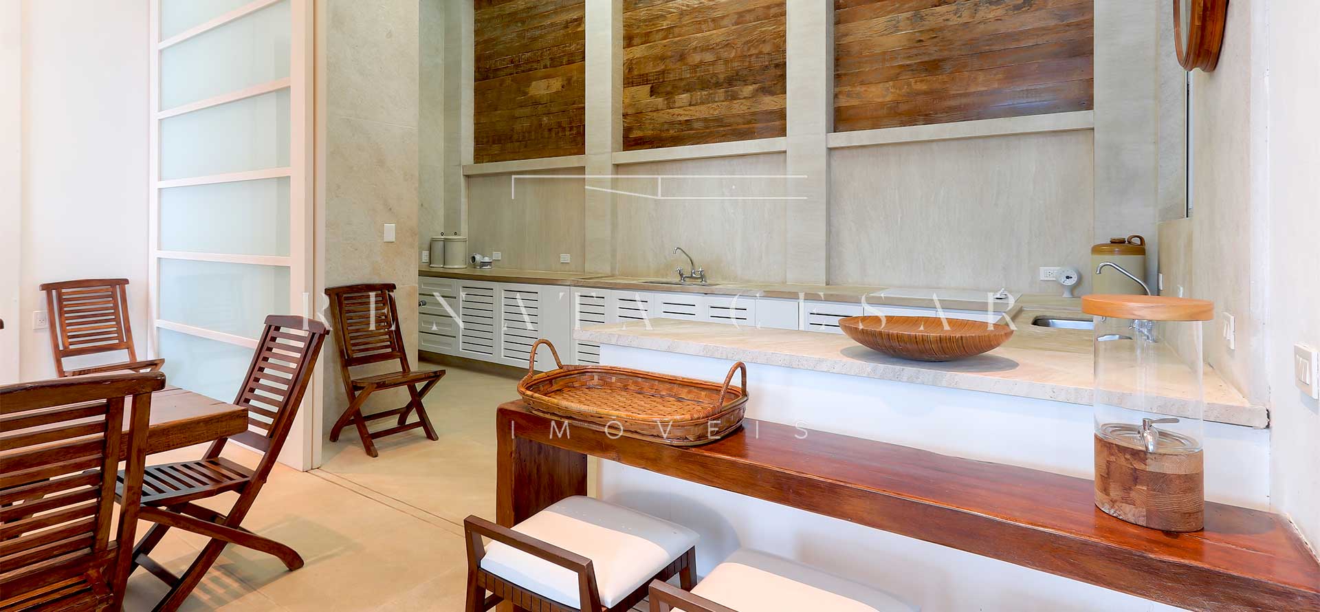 São 08 suítes distribuídas em três pisos da casa (e acessíveis via elevador), a maioria com vista-mar, mas também algumas com vista lateral, para a mata nativa do Condomínio. Tudo com ar-condicionado, muita privacidade e um design elegante e aconchegante ao mesmo tempo. A suíte principal conta com jacuzzi, deck de madeira, um terraço próprio com vista para o oceano e um banheiro único: superamplo e com paredes envidraçadas que permitem um contato todo especial com o exterior.