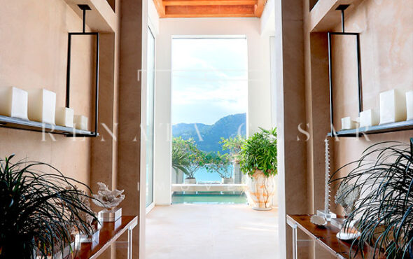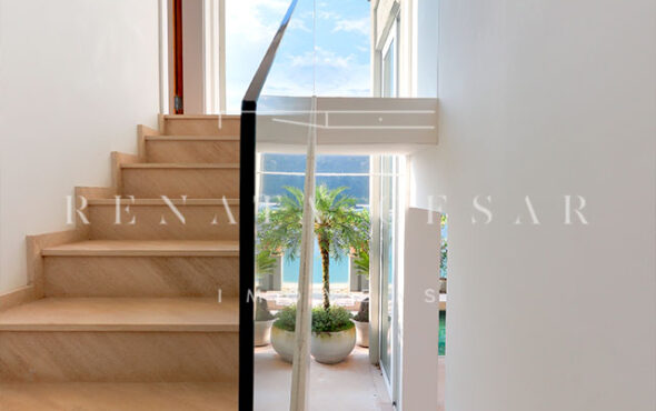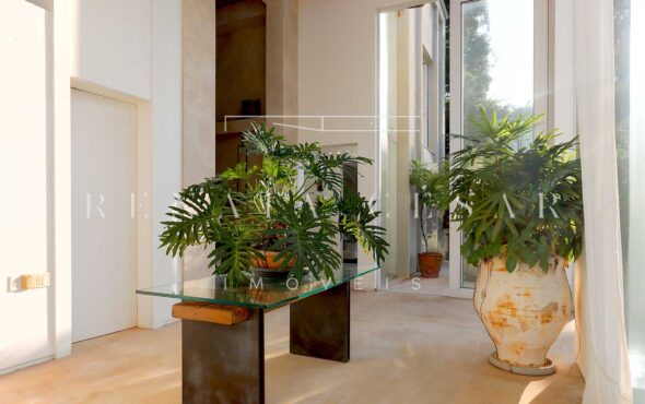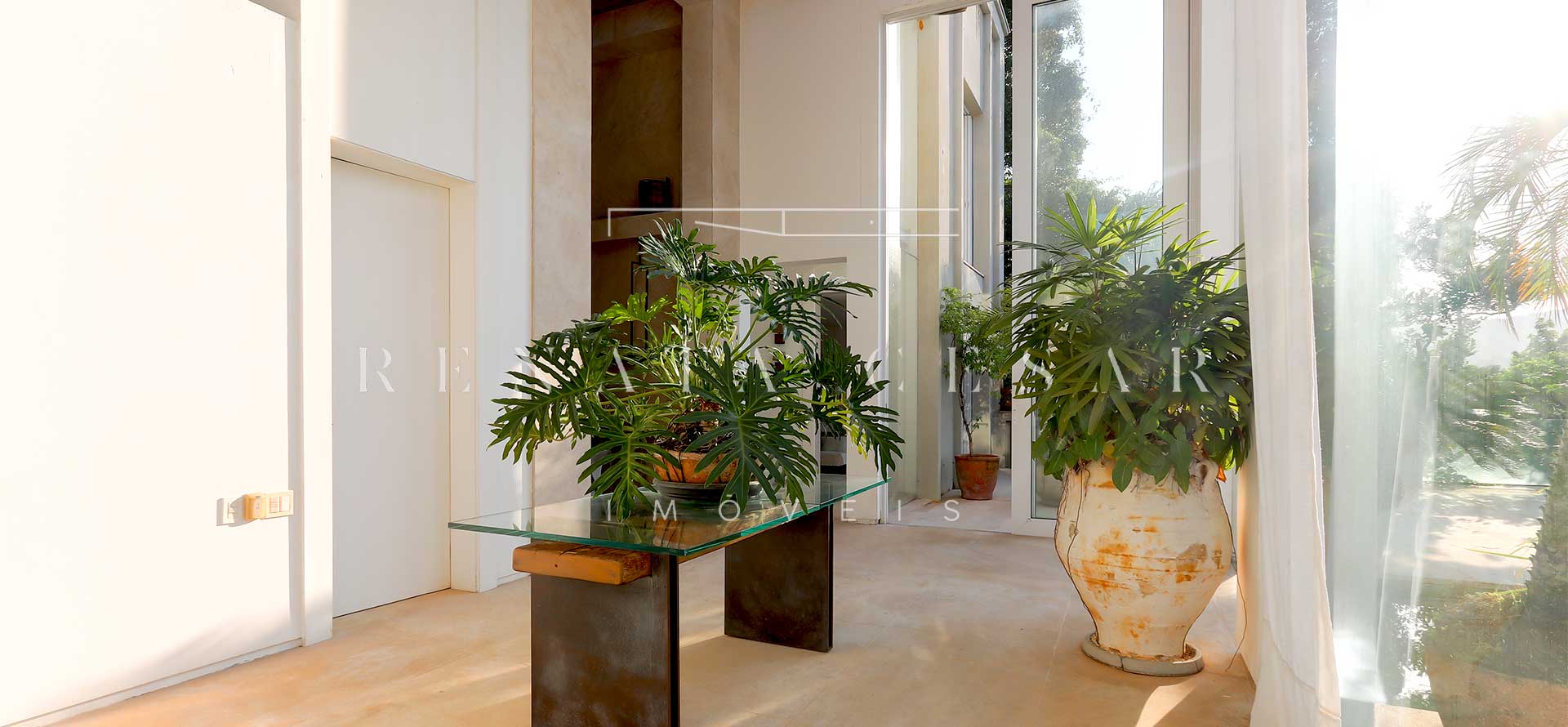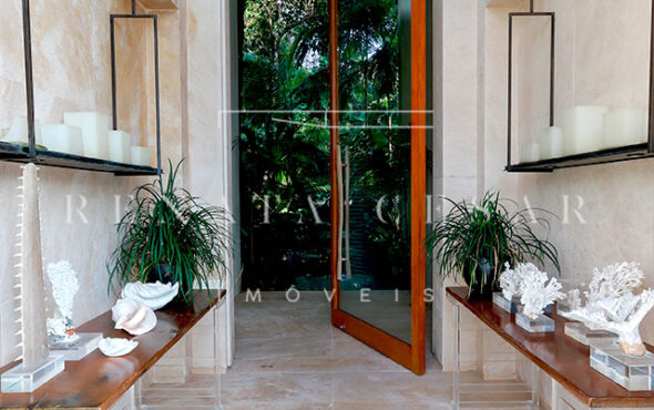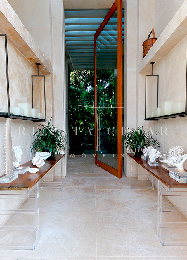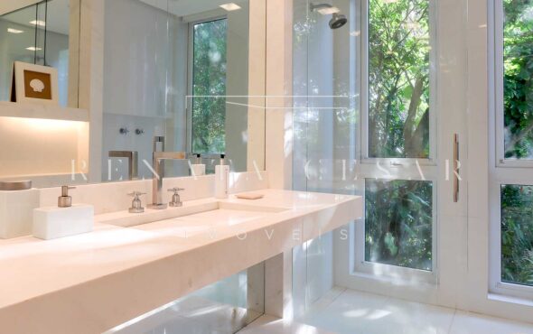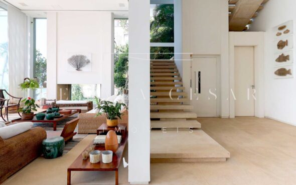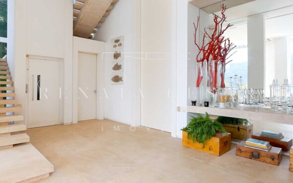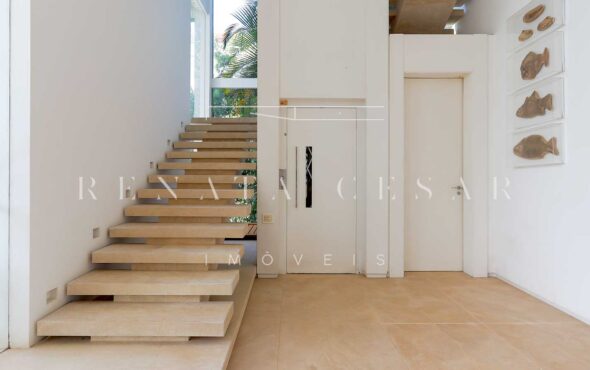 Entrando na casa, já no nível da rua, somos saudados por um hall incrível com pé-direito altíssimo, porta pivotante de madeira e vidro, e um espaço externo com espelho d’água e paisagismo que encanta pela sua harmonia com a arquitetura. Aliás, todos os ambientes da casa são privilegiados com um pé-direito muito alto, e acabamentos claros que, em combinação com as paredes envidraçadas, fazem a luz natural brilhar o dia inteiro.
