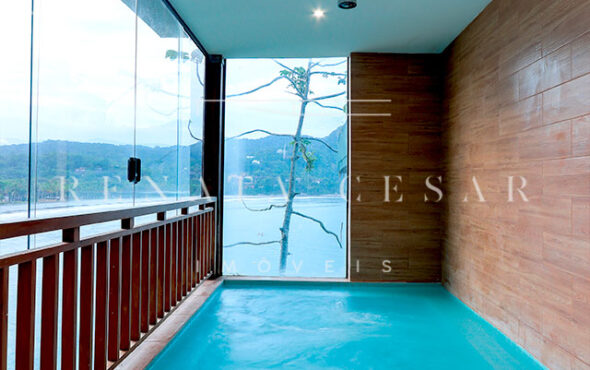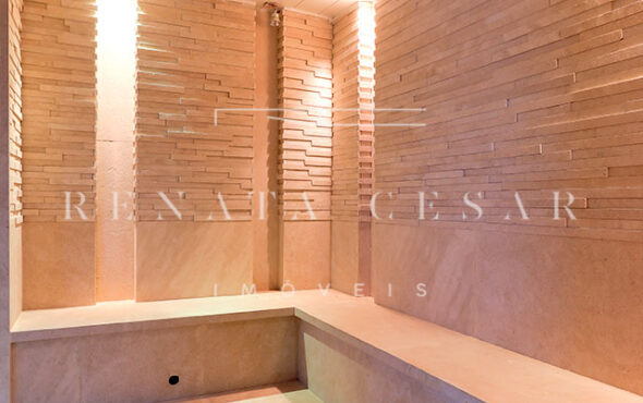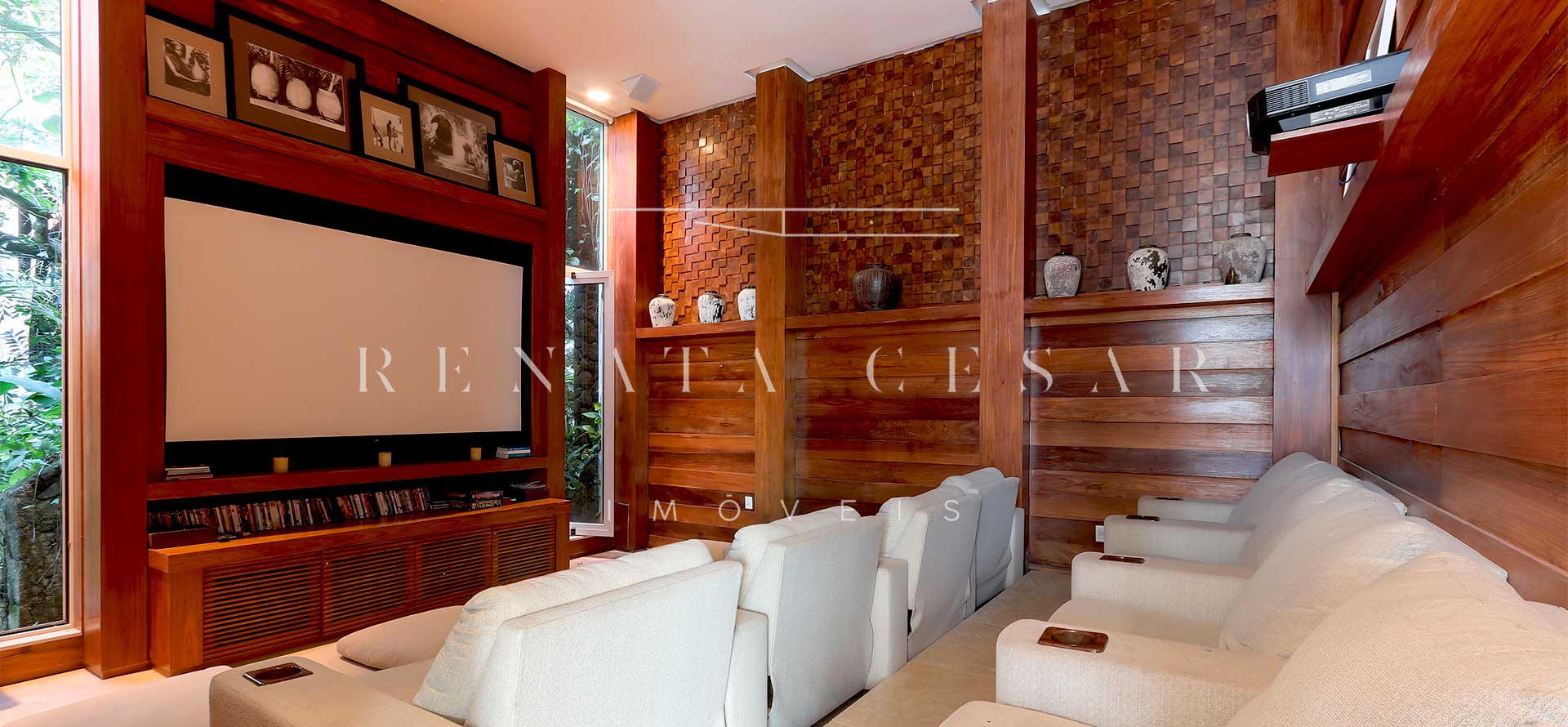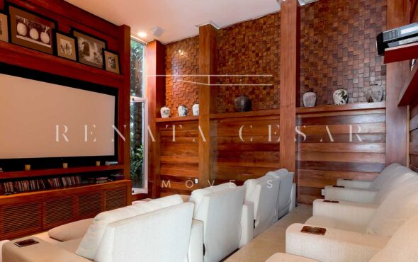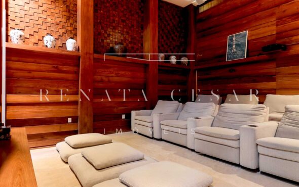 O andar social é todo integrado com sala de estar ampla com lareira, um cinema completo, cozinha totalmente equipada e claro, a área externa com espaço gourmet e piscina de borda infinita, de onde a vista é de cair o queixo.