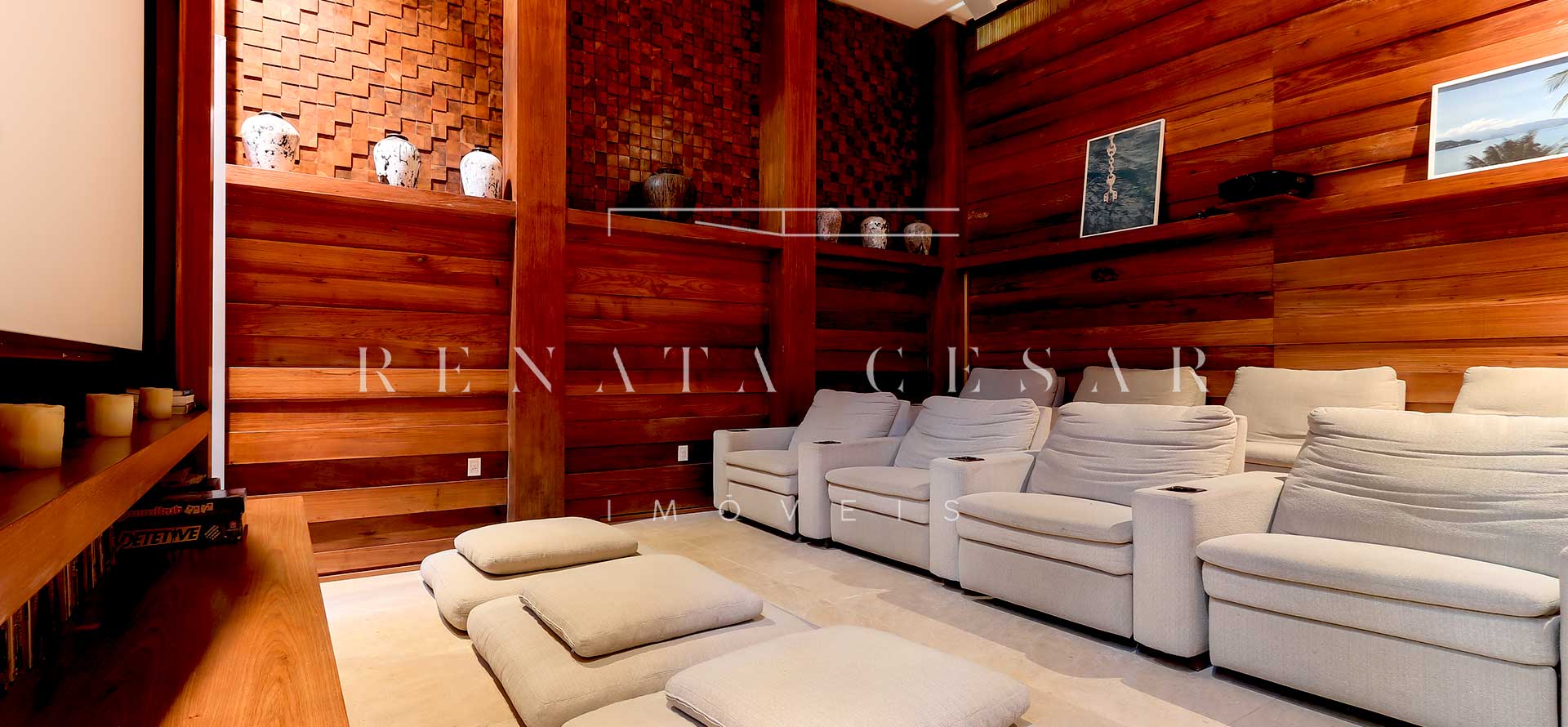 Ver foto na galeriaO andar social é todo integrado com sala de estar ampla com lareira, um cinema completo, cozinha totalmente equipada e claro, a área externa com espaço gourmet e piscina de borda infinita, de onde a vista é de cair o queixo.