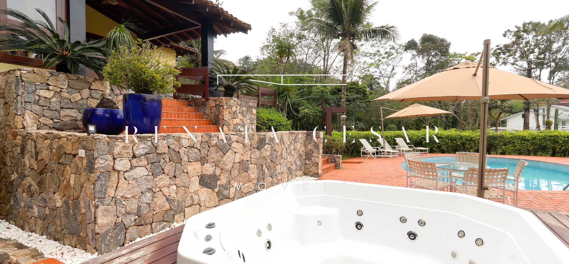 A área externa é a joia da casa, por ser ampla, com piscina, jacuzzi, banheiro externo e sauna, e ainda ter muitos espaços para reunir e se divertir. Você pode organizar um almoço ou jantar na área gourmet, relaxar sob a sombra nos ombrelones ou, se preferir, dar poucos passos em direção à praia: tanto a Praia das Conchas como de São Pedro estão a menos de 5 minutos a pé da residência.