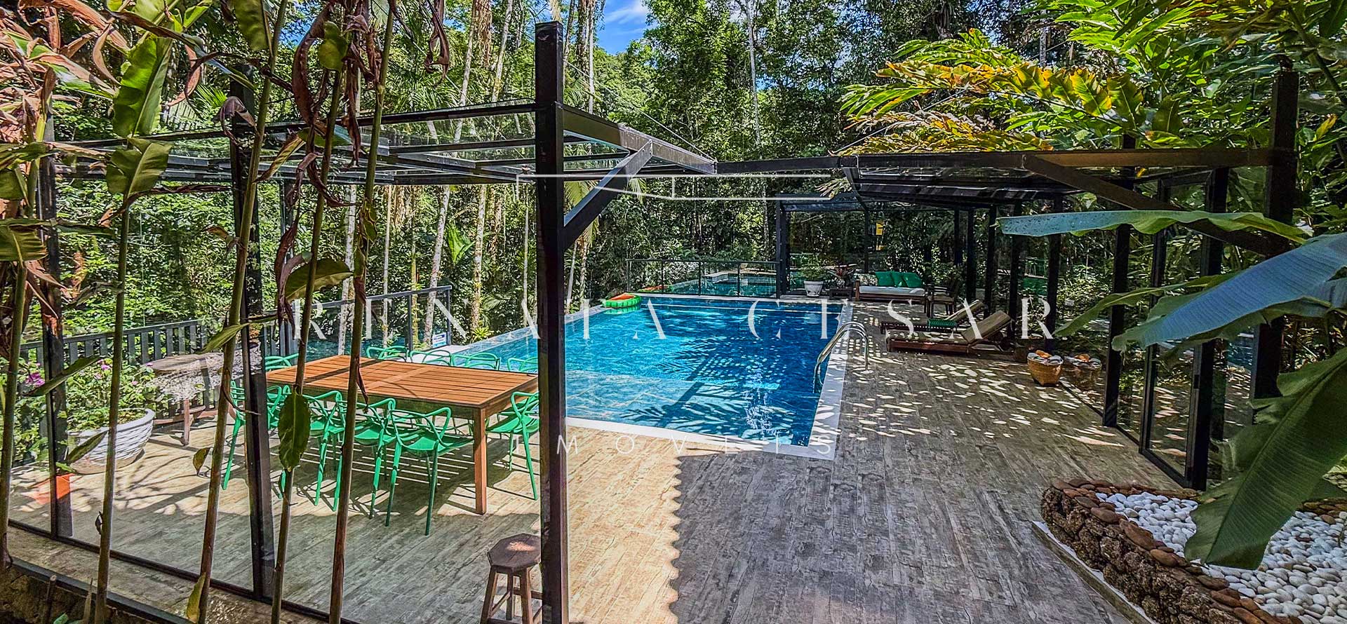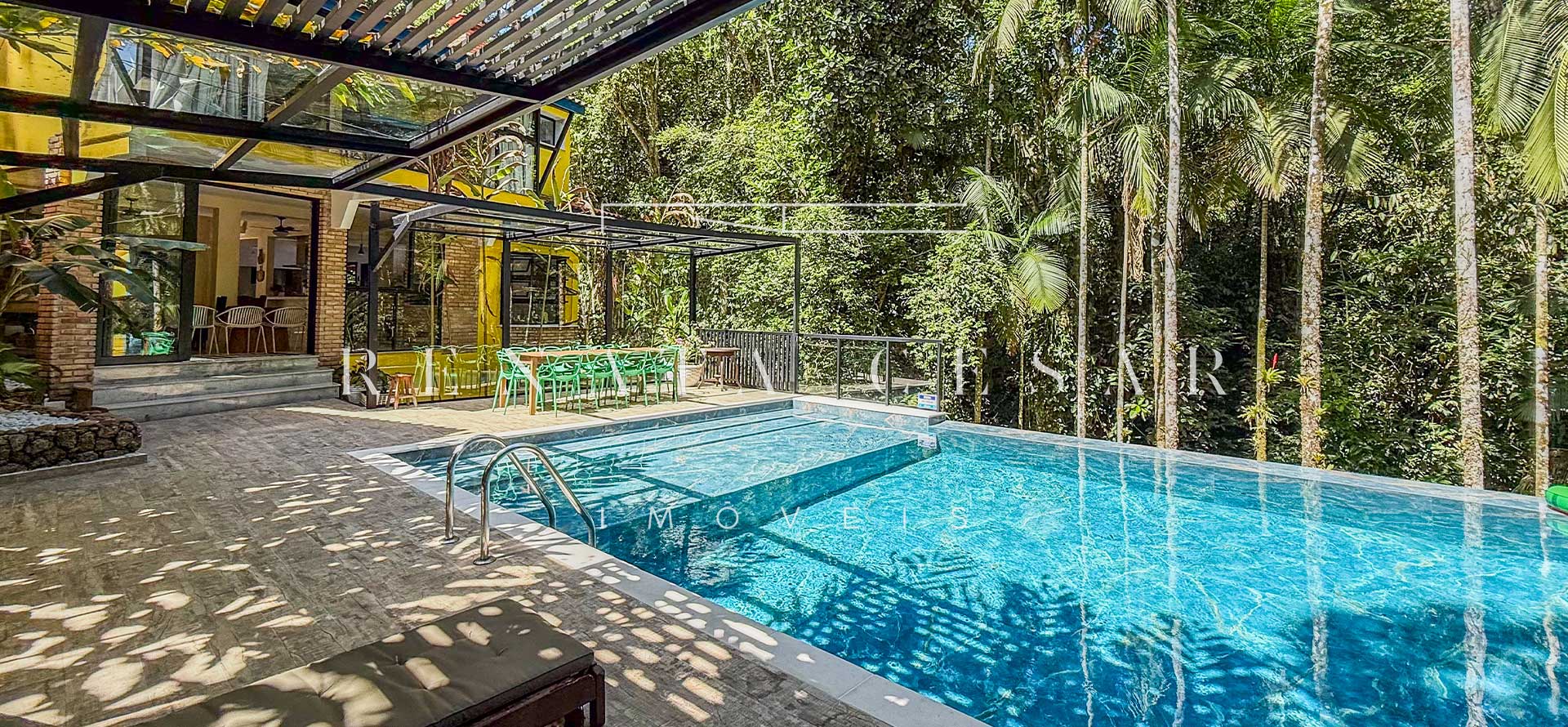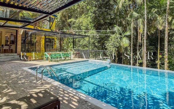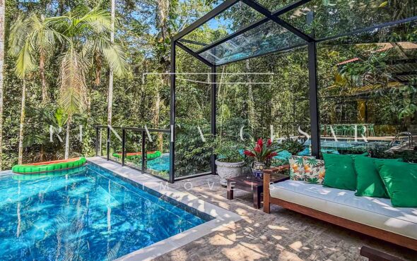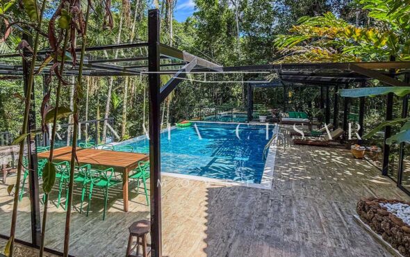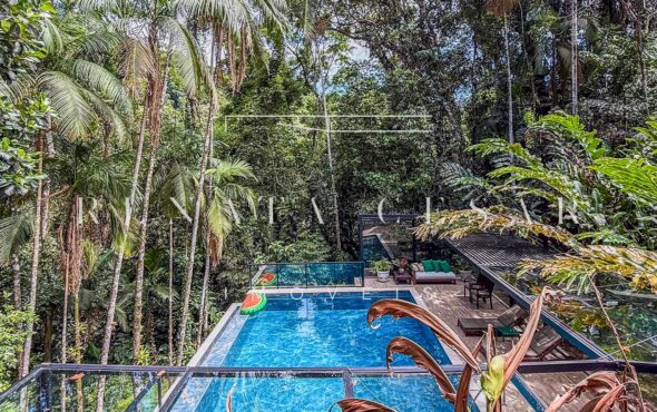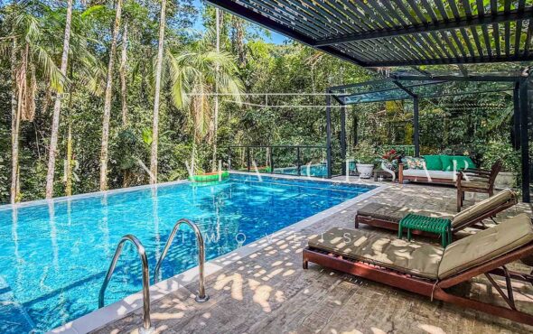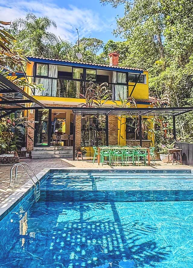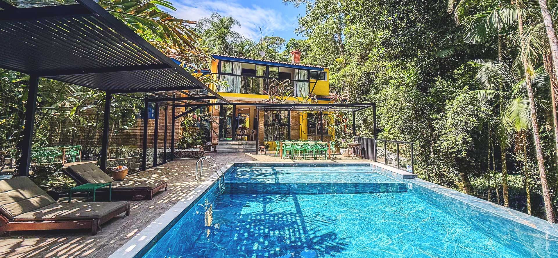 Na área externa, uma grande piscina com prainha abraçada pela mata, onde os dias de sol te esperam. Espreguiçadeiras, sofás e áreas para refeições ficam no entorno, criando diferentes ambientes.