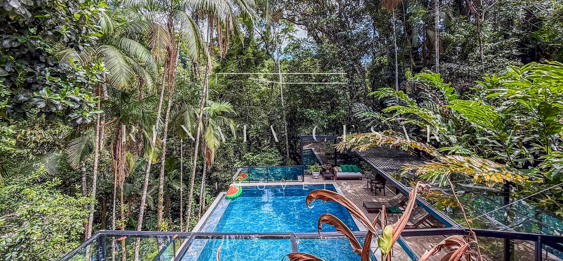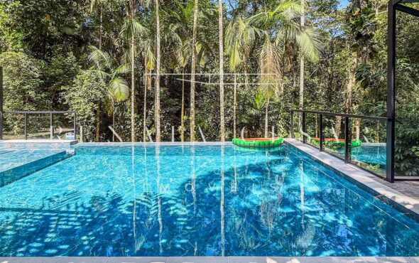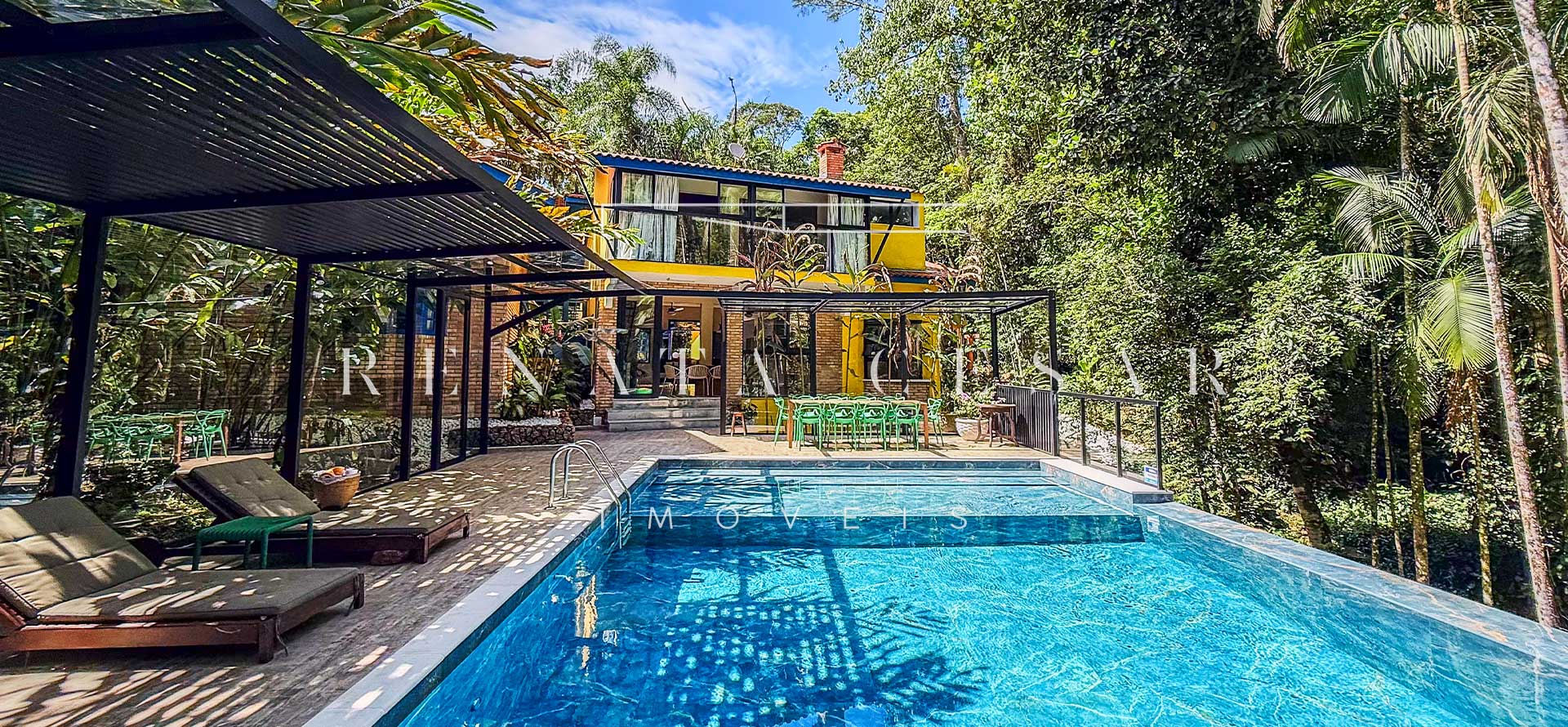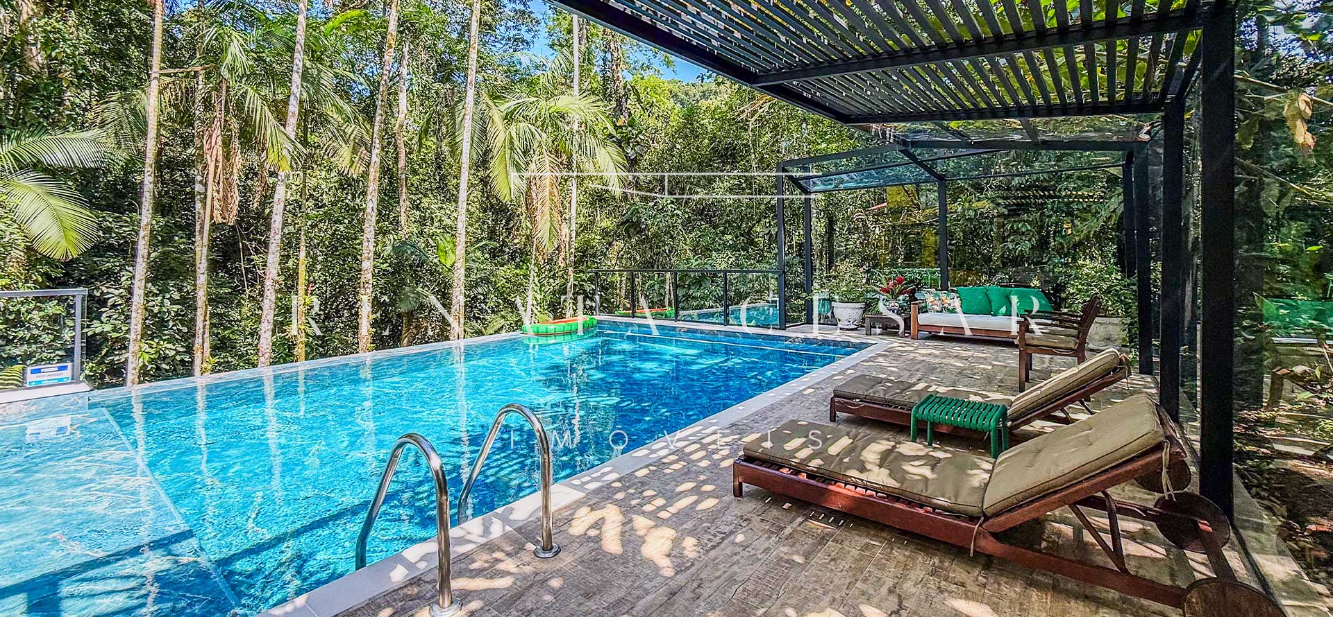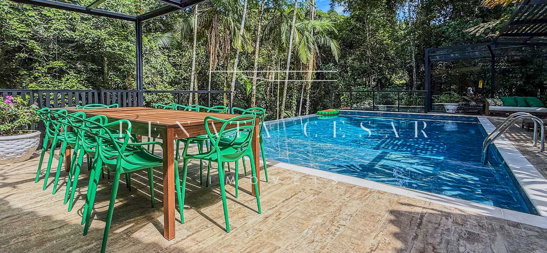 Na área externa, uma grande piscina com prainha abraçada pela mata, onde os dias de sol te esperam. Espreguiçadeiras, sofás e áreas para refeições ficam no entorno, criando diferentes ambientes.