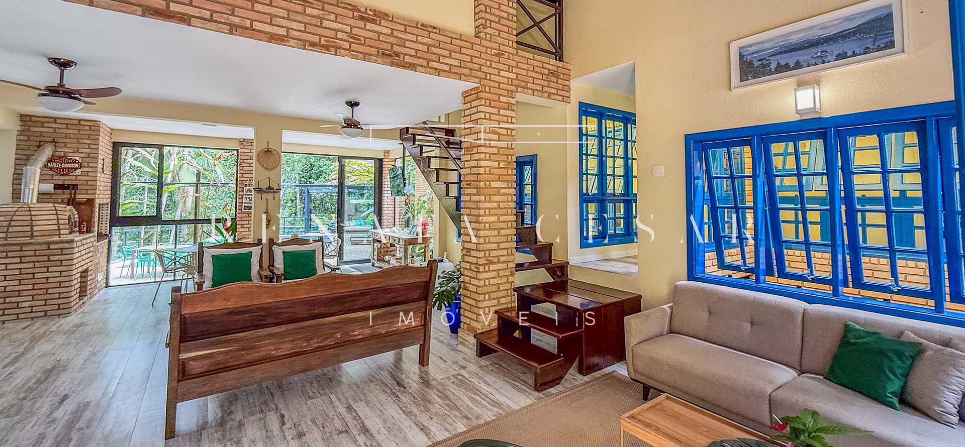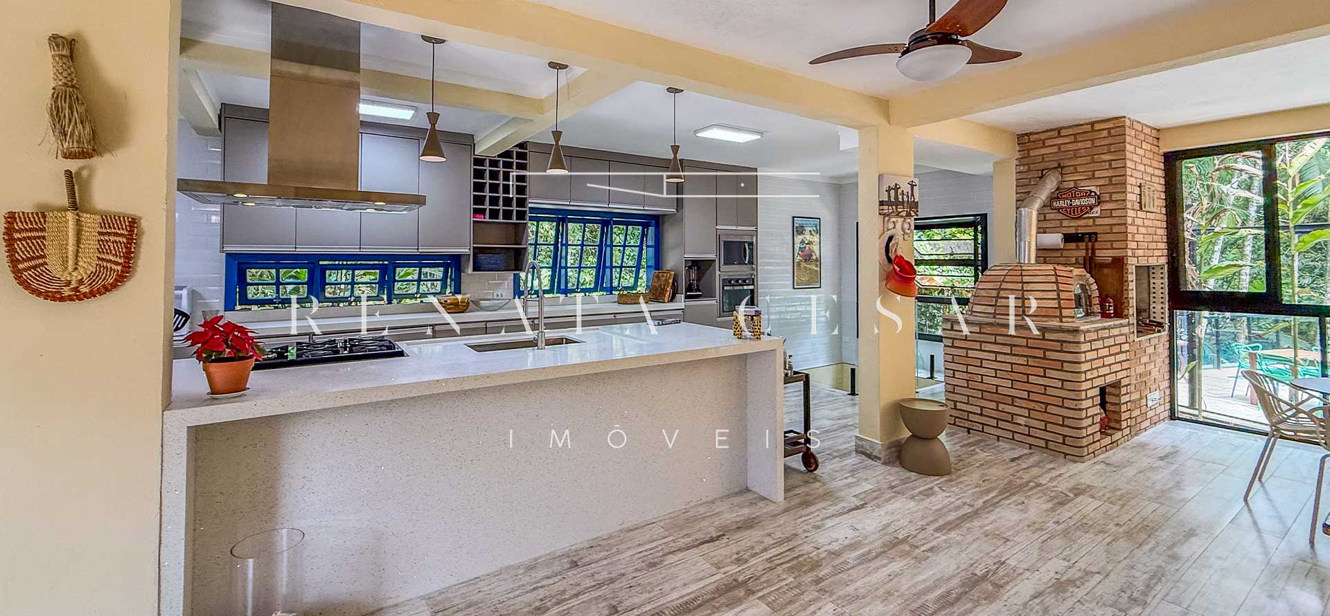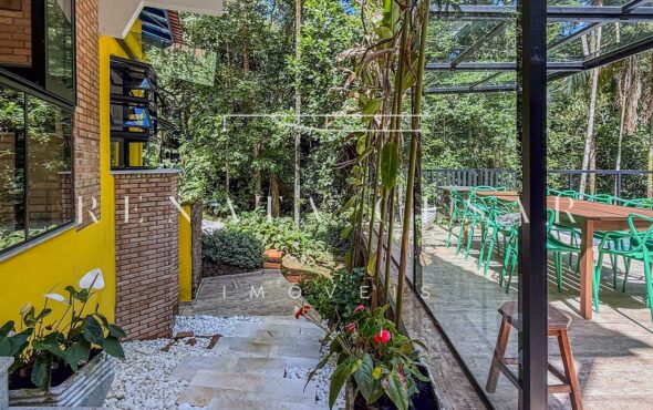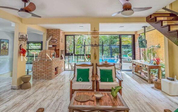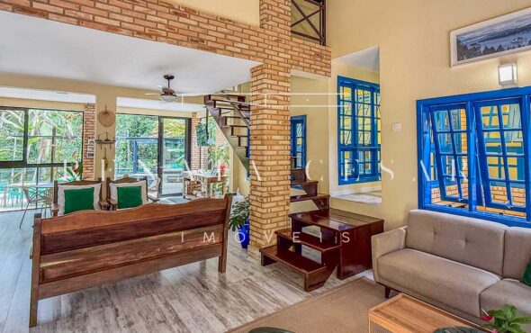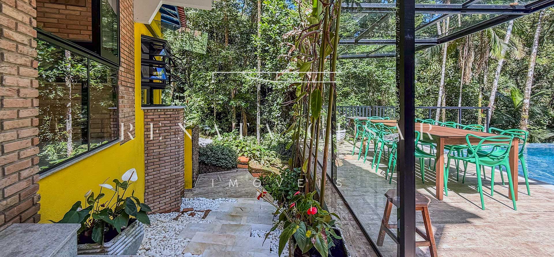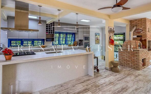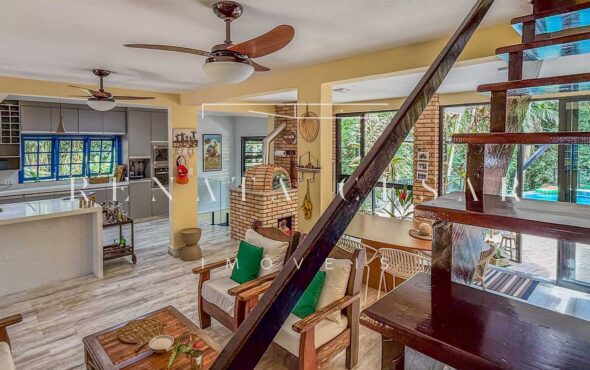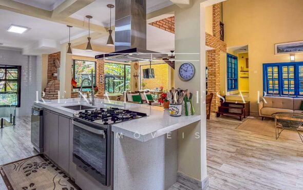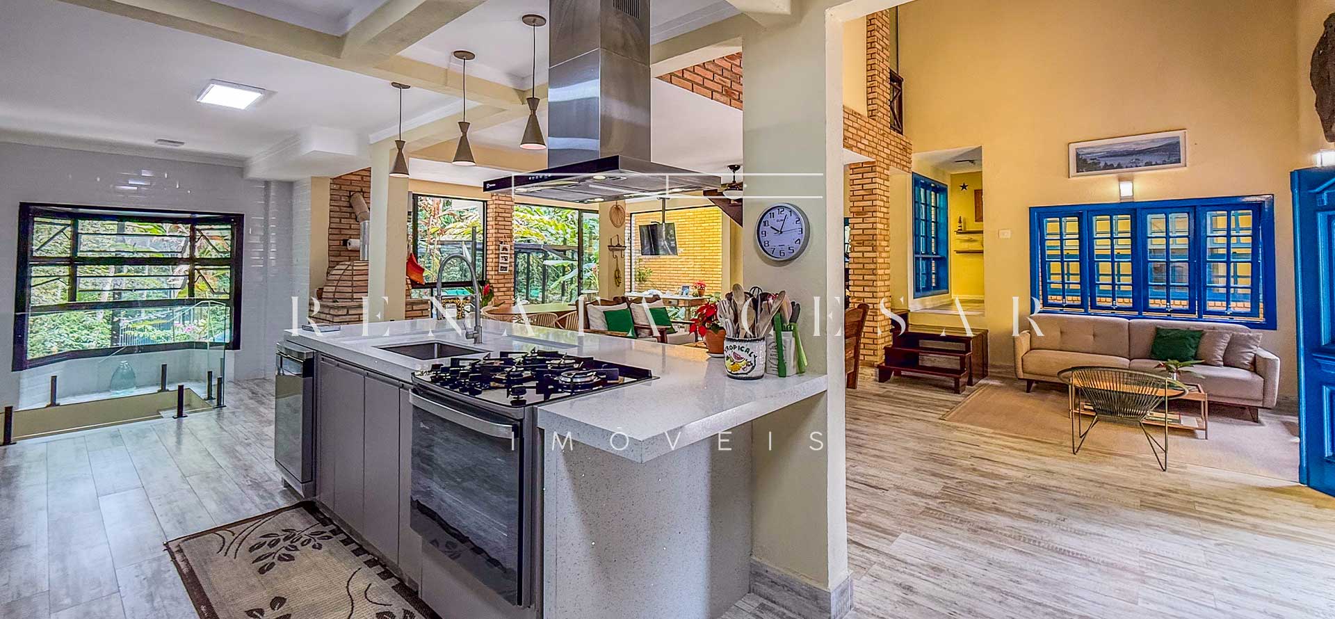 A casa está mergulhada na mata e só tem vizinhos em um dos lados do terreno, usufruindo de ótima privacidade. O living integra sala de estar e jantar com uma cozinha completa com ilha e ainda o espaço gourmet com churrasqueira e forno de pizza. Há muitos espaços para reunir, fazer refeições e relaxar com uma deliciosa vista verde dos janelões.