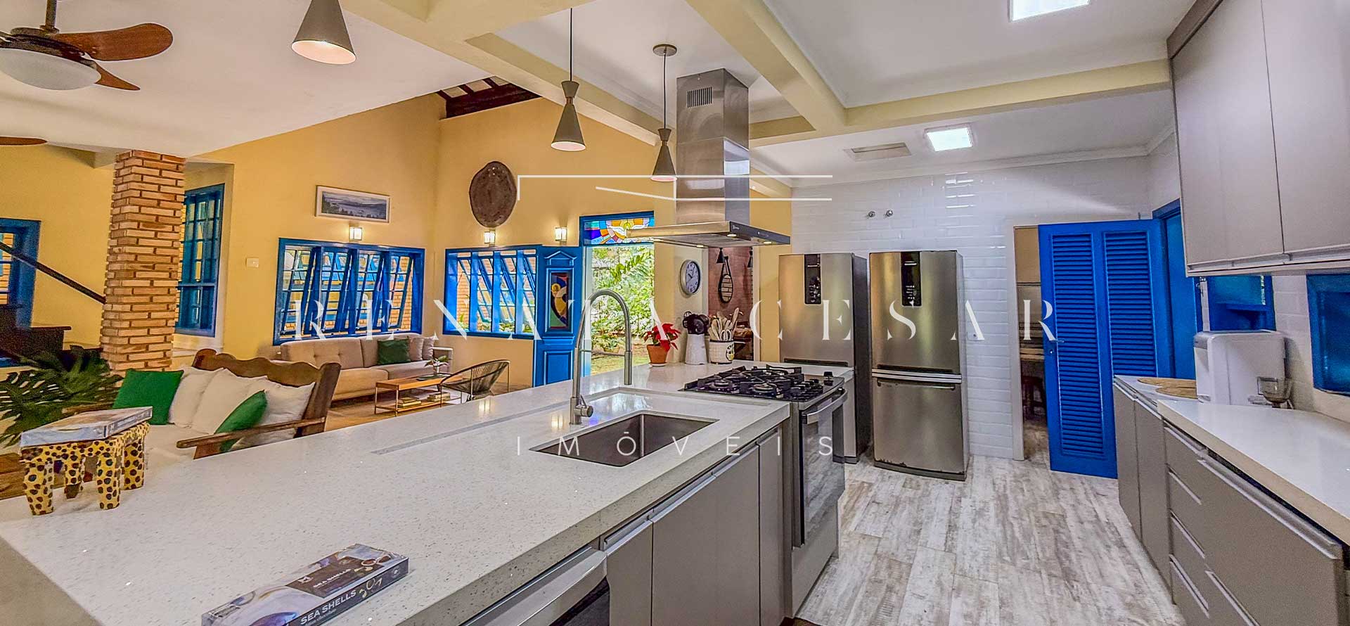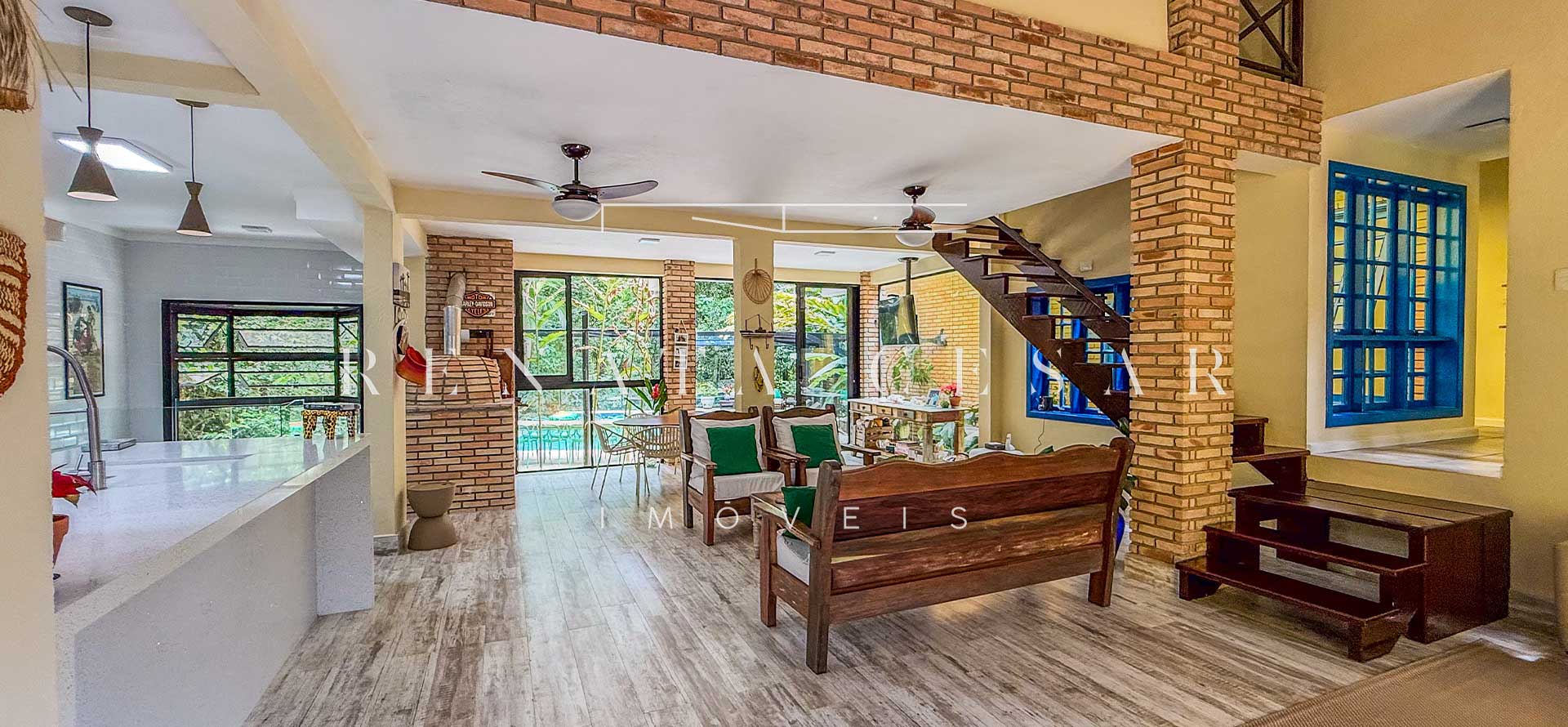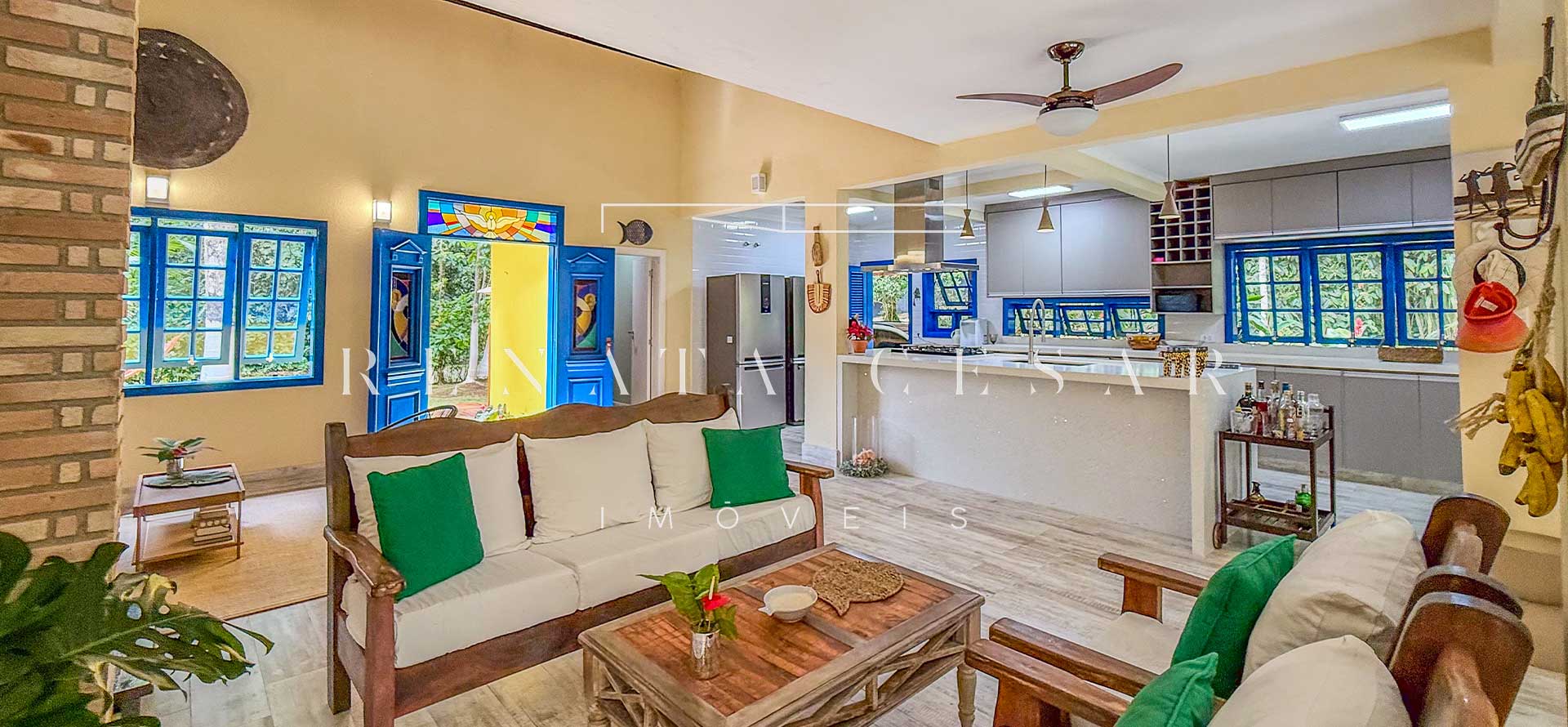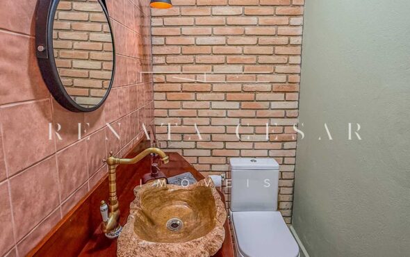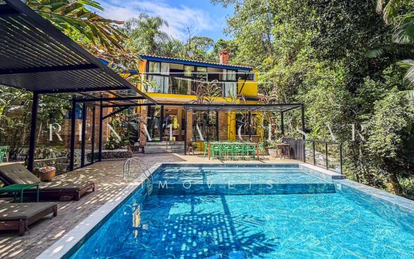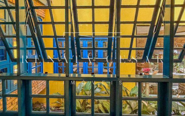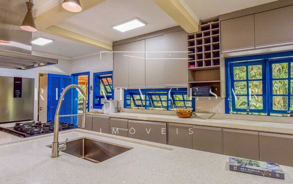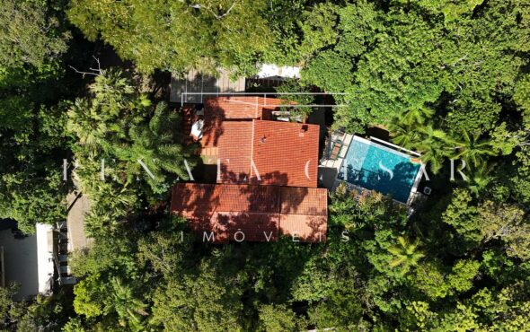 A casa está mergulhada na mata e só tem vizinhos em um dos lados do terreno, usufruindo de ótima privacidade. O living integra sala de estar e jantar com uma cozinha completa com ilha e ainda o espaço gourmet com churrasqueira e forno de pizza. Há muitos espaços para reunir, fazer refeições e relaxar com uma deliciosa vista verde dos janelões.