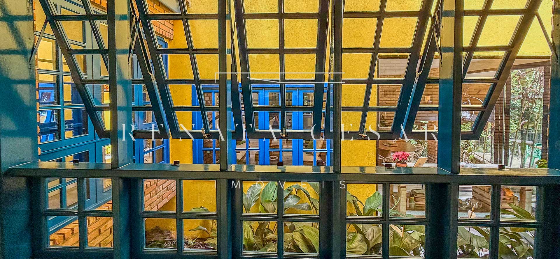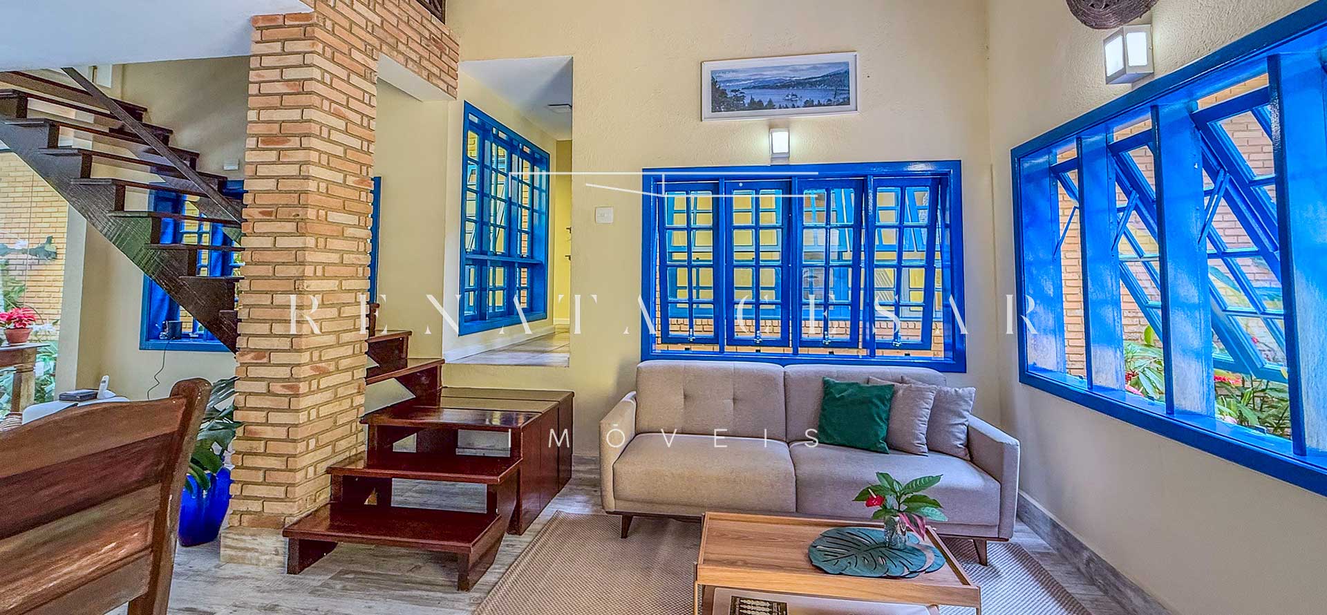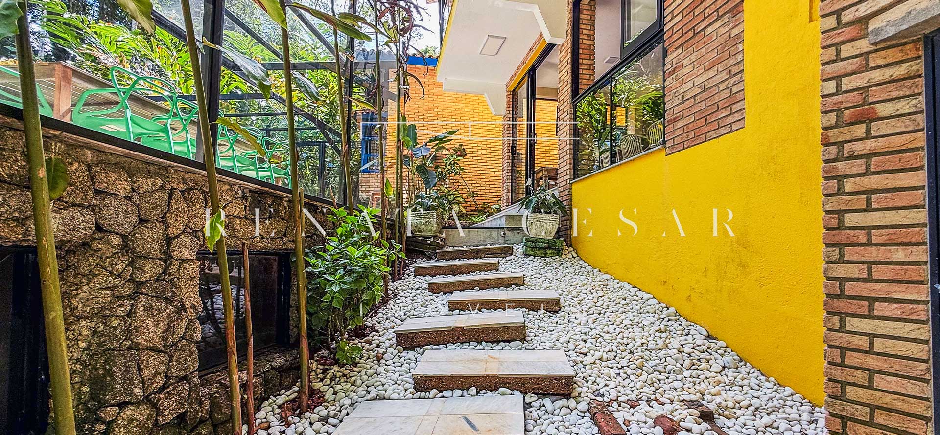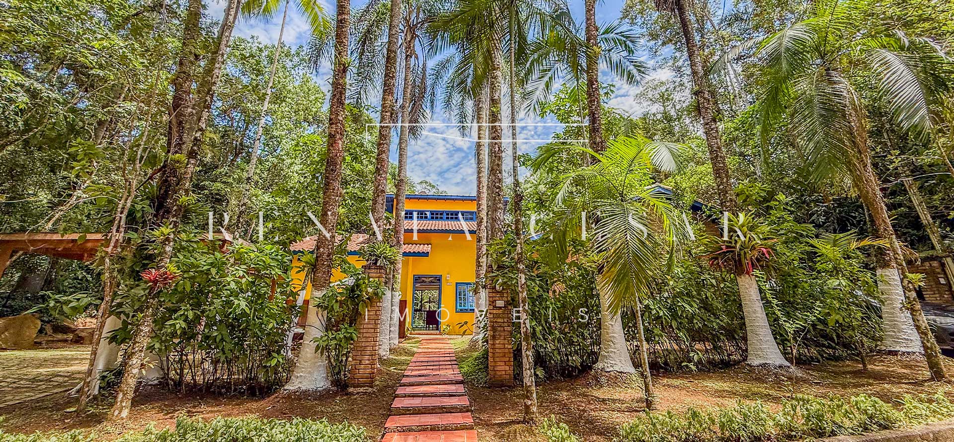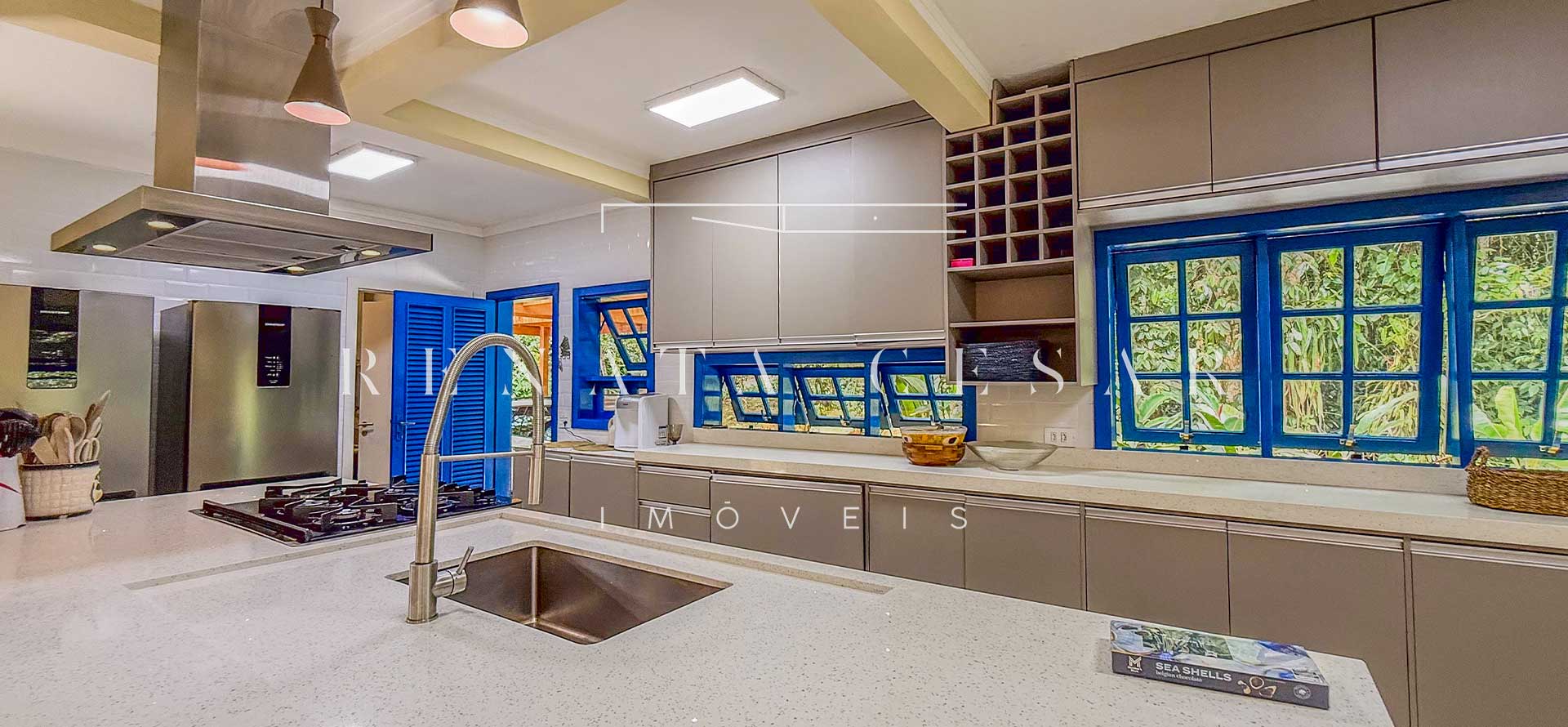A casa está mergulhada na mata e só tem vizinhos em um dos lados do terreno, usufruindo de ótima privacidade. O living integra sala de estar e jantar com uma cozinha completa com ilha e ainda o espaço gourmet com churrasqueira e forno de pizza. Há muitos espaços para reunir, fazer refeições e relaxar com uma deliciosa vista verde dos janelões.