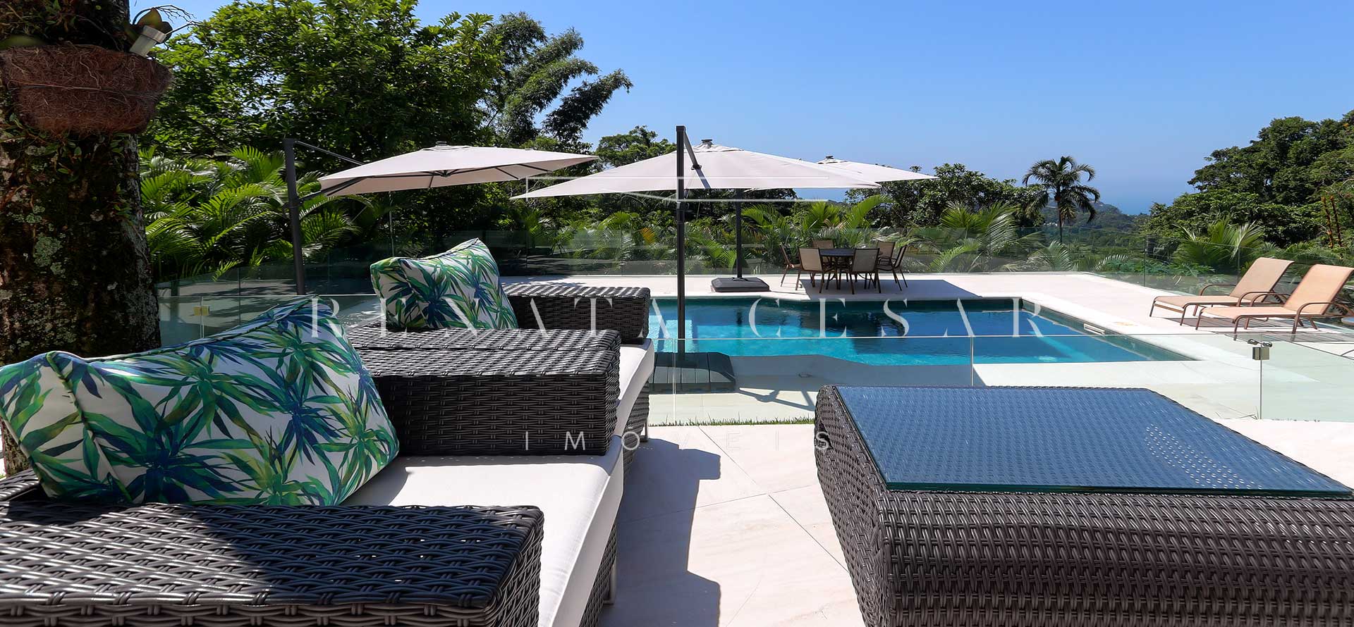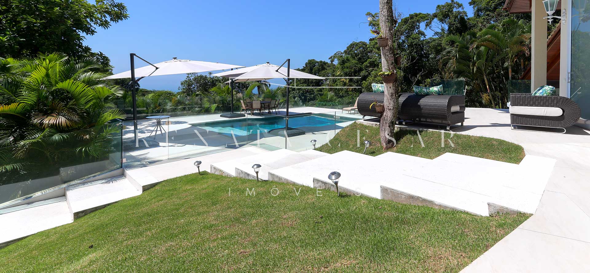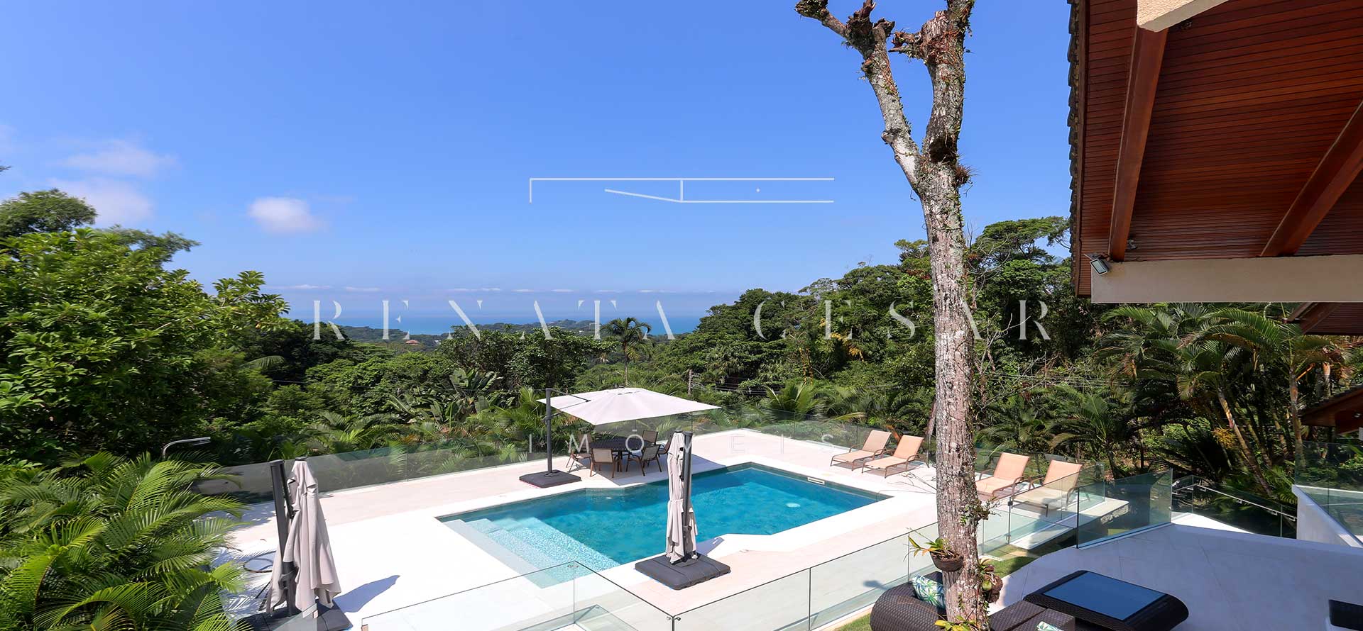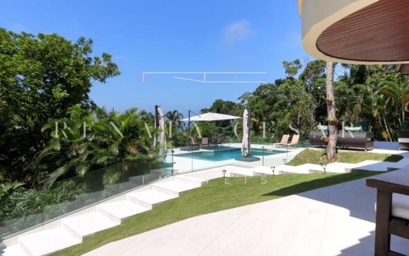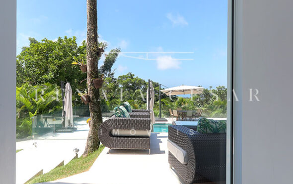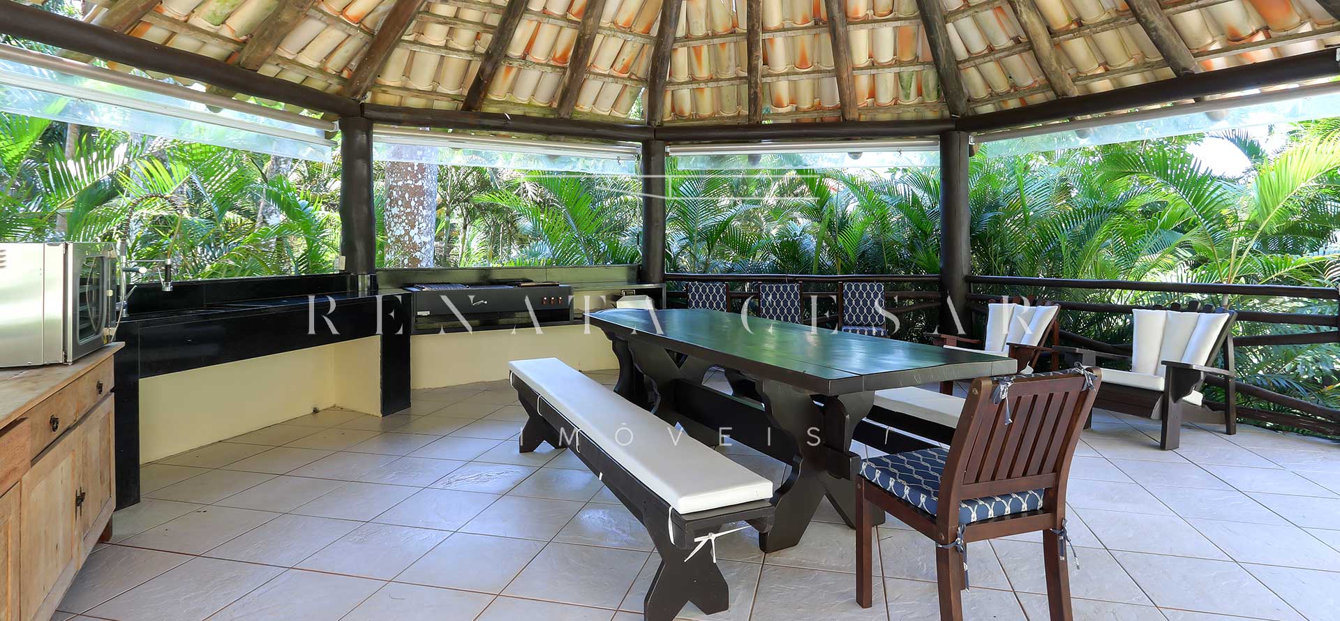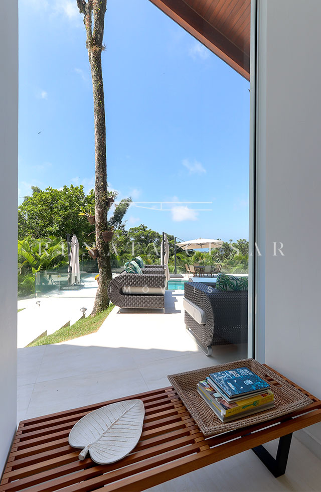 Não falta espaço e sol nesta área externa, que conta com piscina, espaço gourmet e uma mesa grande para refeições. A vista do mar no horizonte e a mata garante uma atmosfera belíssima, e a praia fica a cerca de 1,8 km de distância.