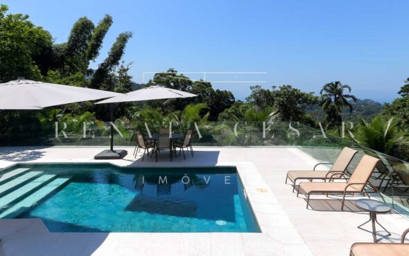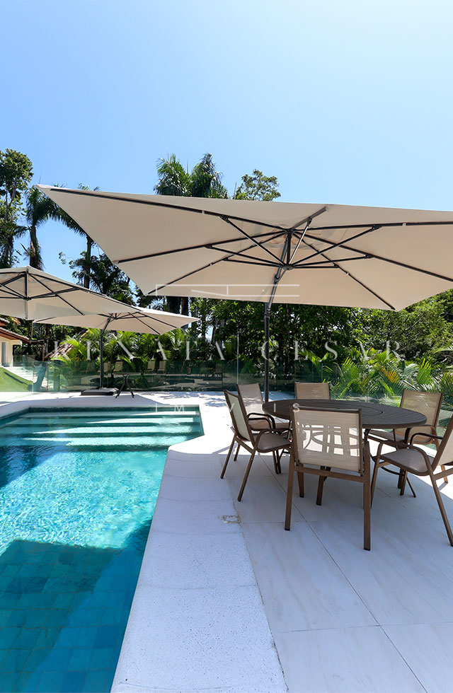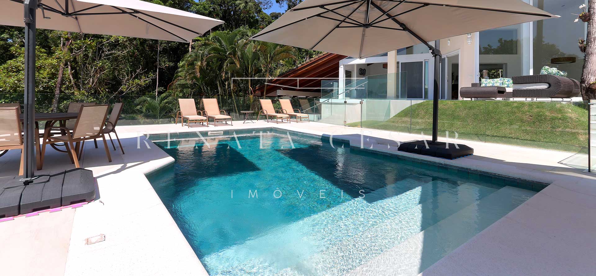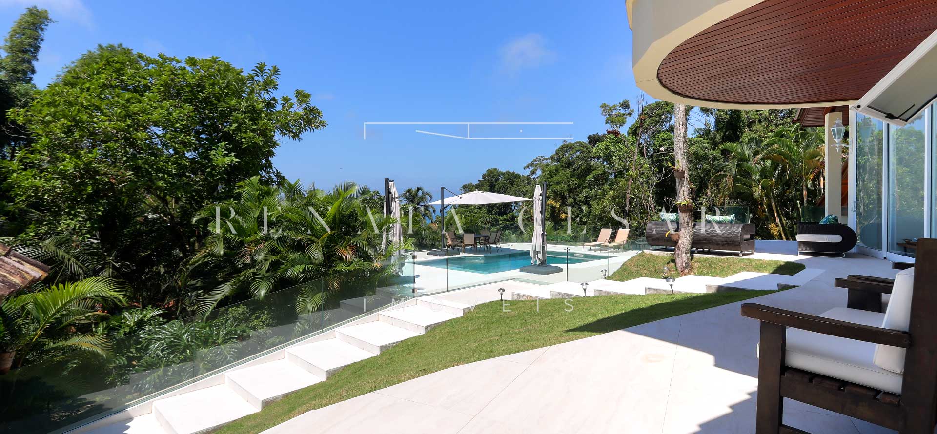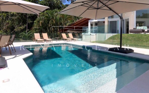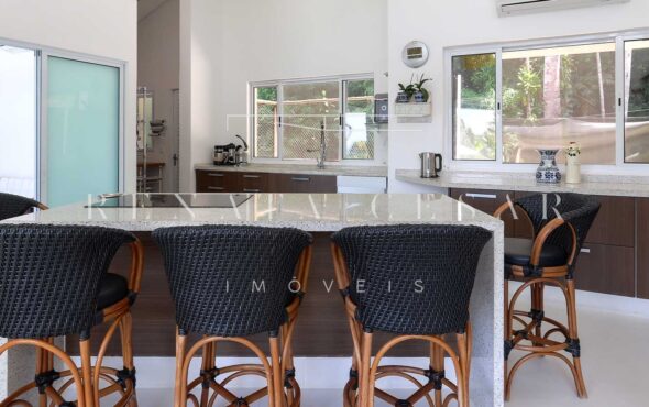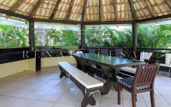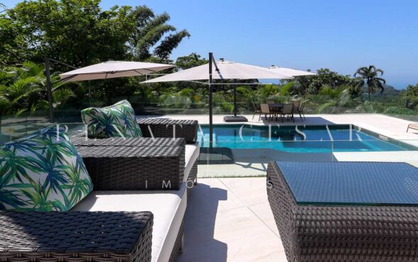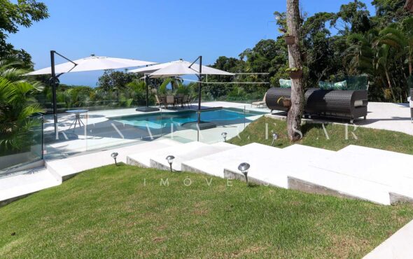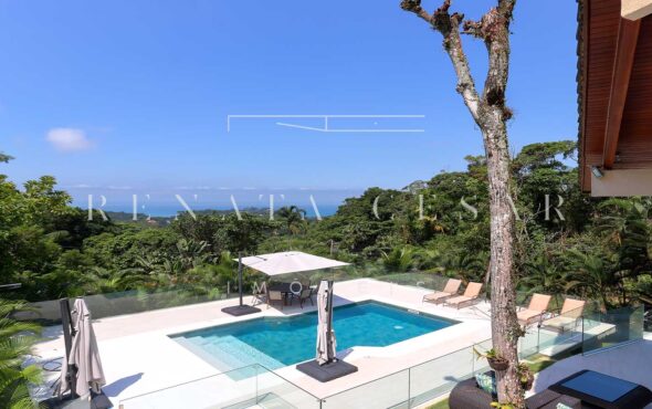 Não falta espaço e sol nesta área externa, que conta com piscina, espaço gourmet e uma mesa grande para refeições. A vista do mar no horizonte e a mata garante uma atmosfera belíssima, e a praia fica a cerca de 1,8 km de distância.