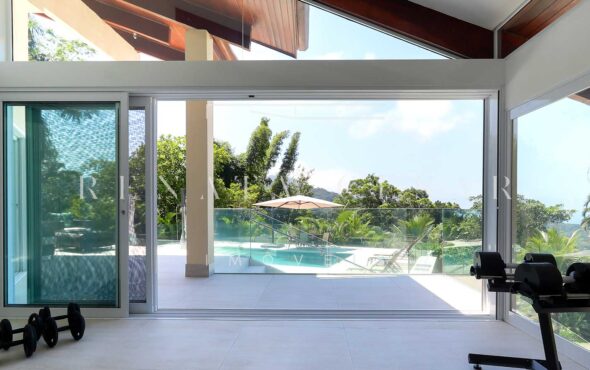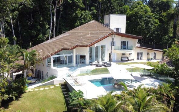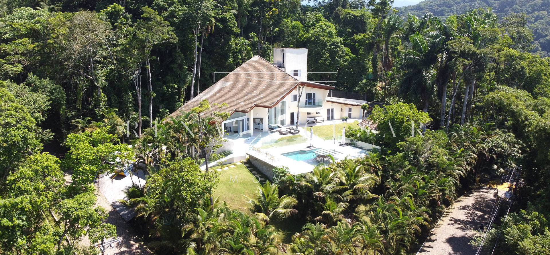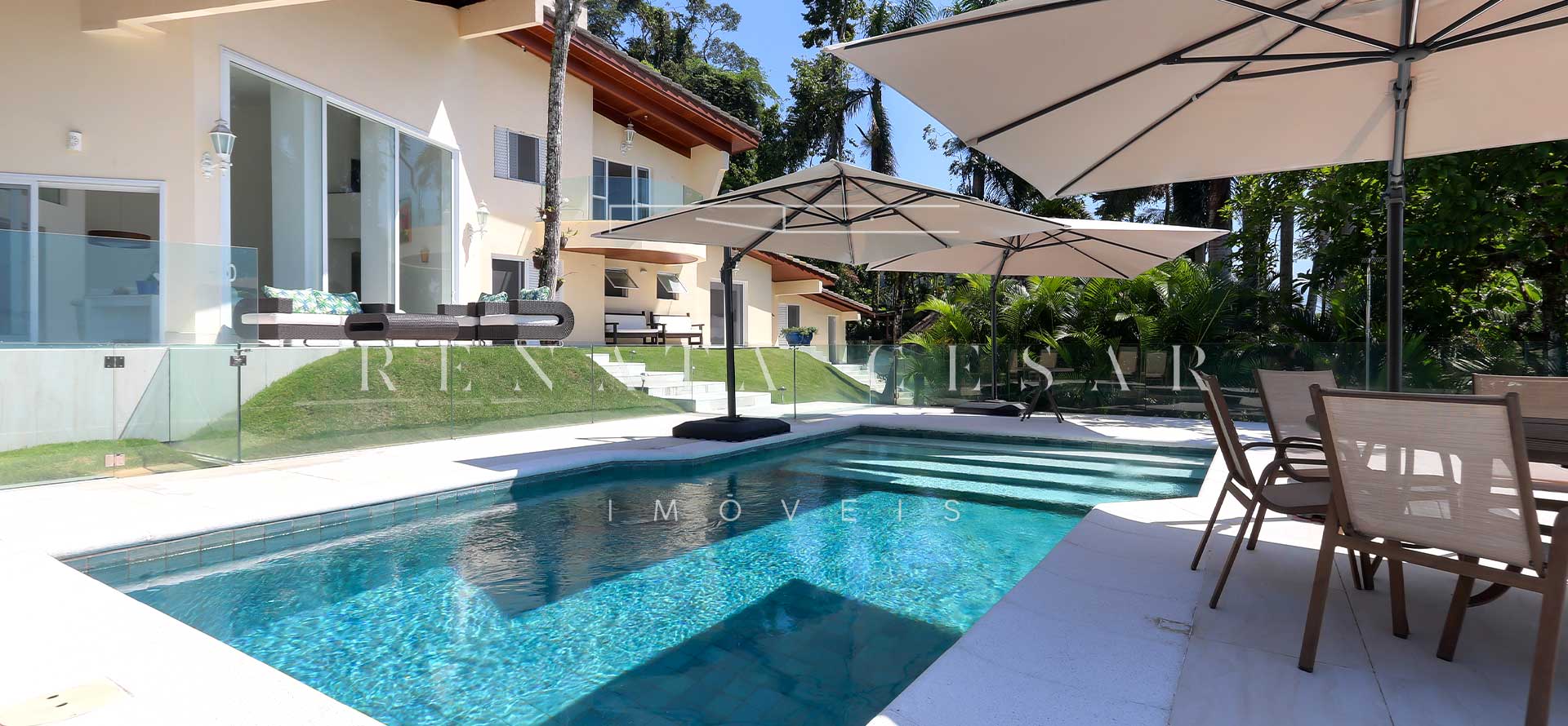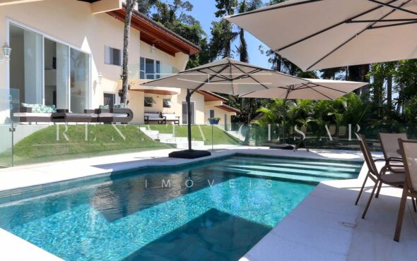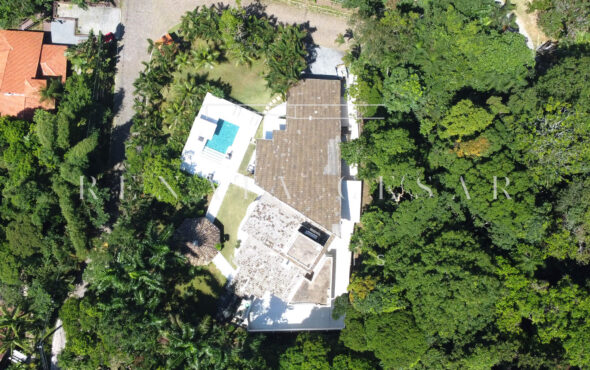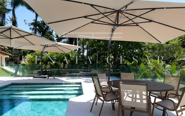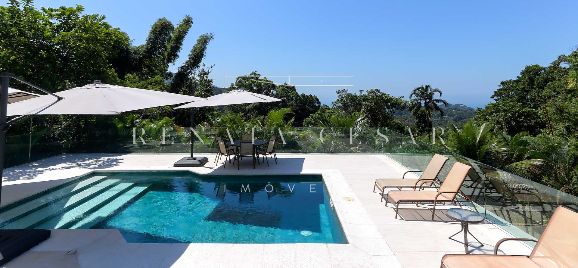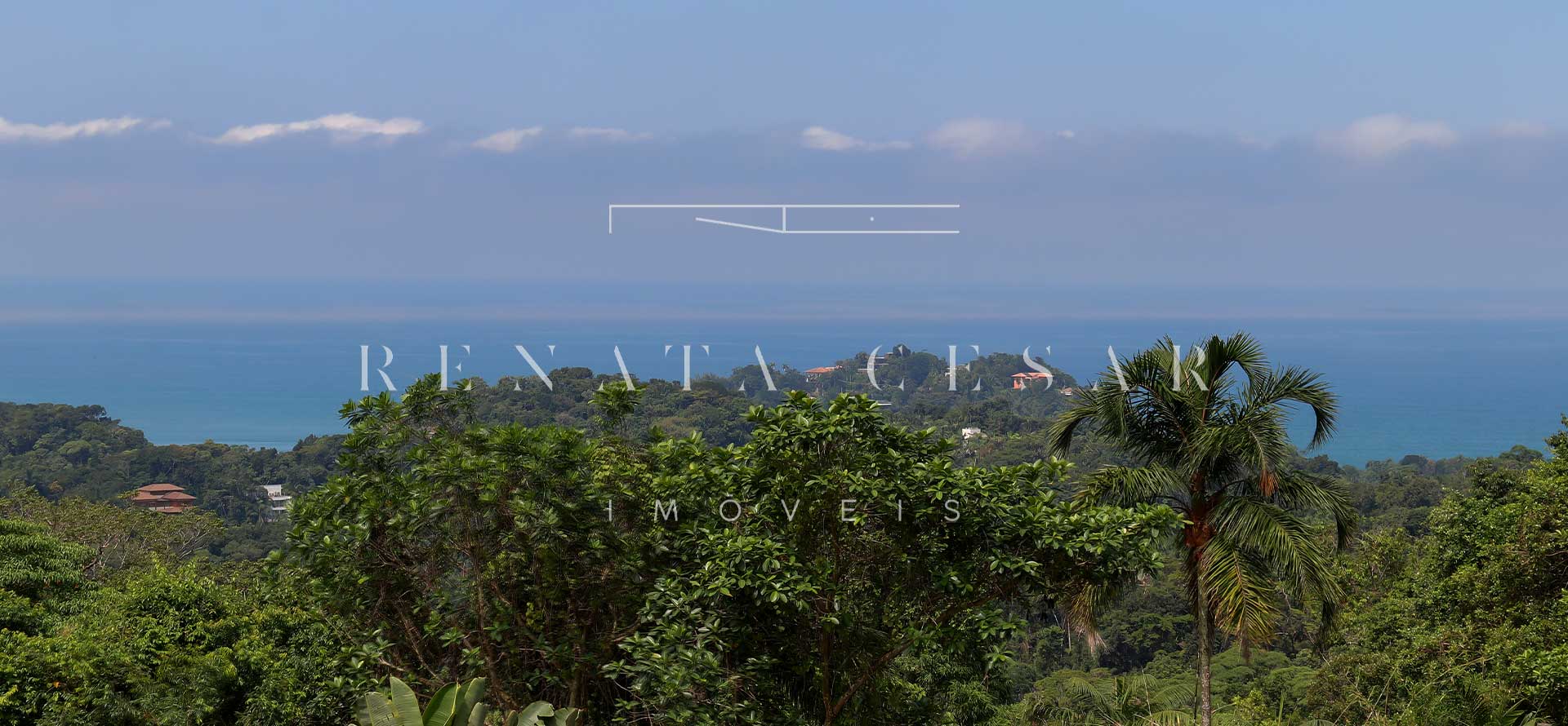 Não falta espaço e sol nesta área externa, que conta com piscina, espaço gourmet e uma mesa grande para refeições. A vista do mar no horizonte e a mata garante uma atmosfera belíssima, e a praia fica a cerca de 1,8 km de distância.