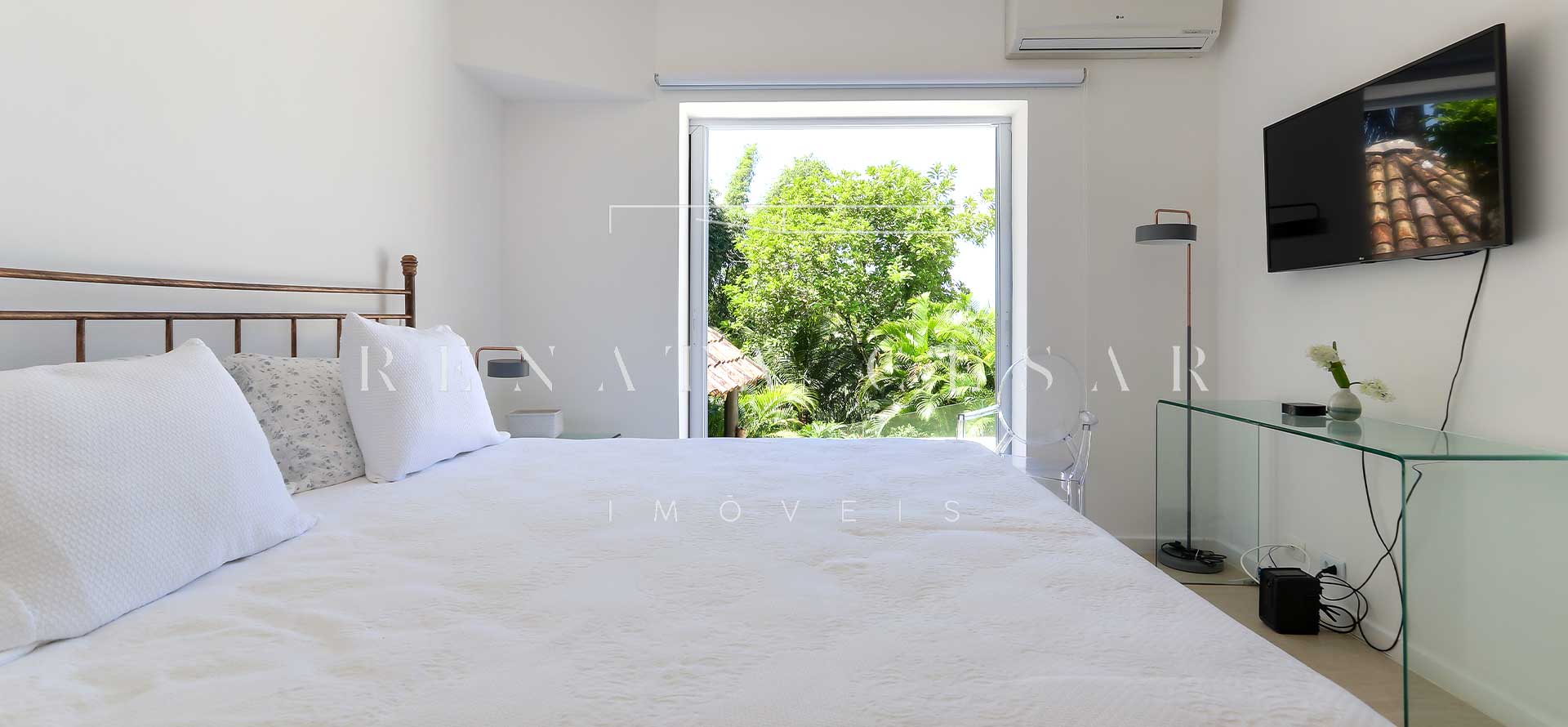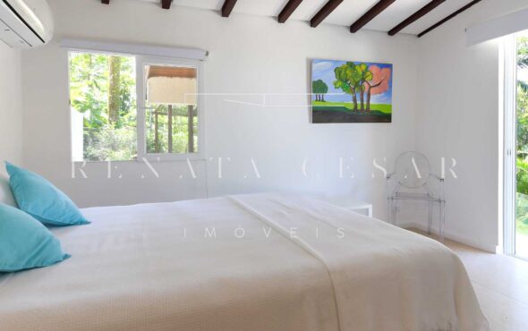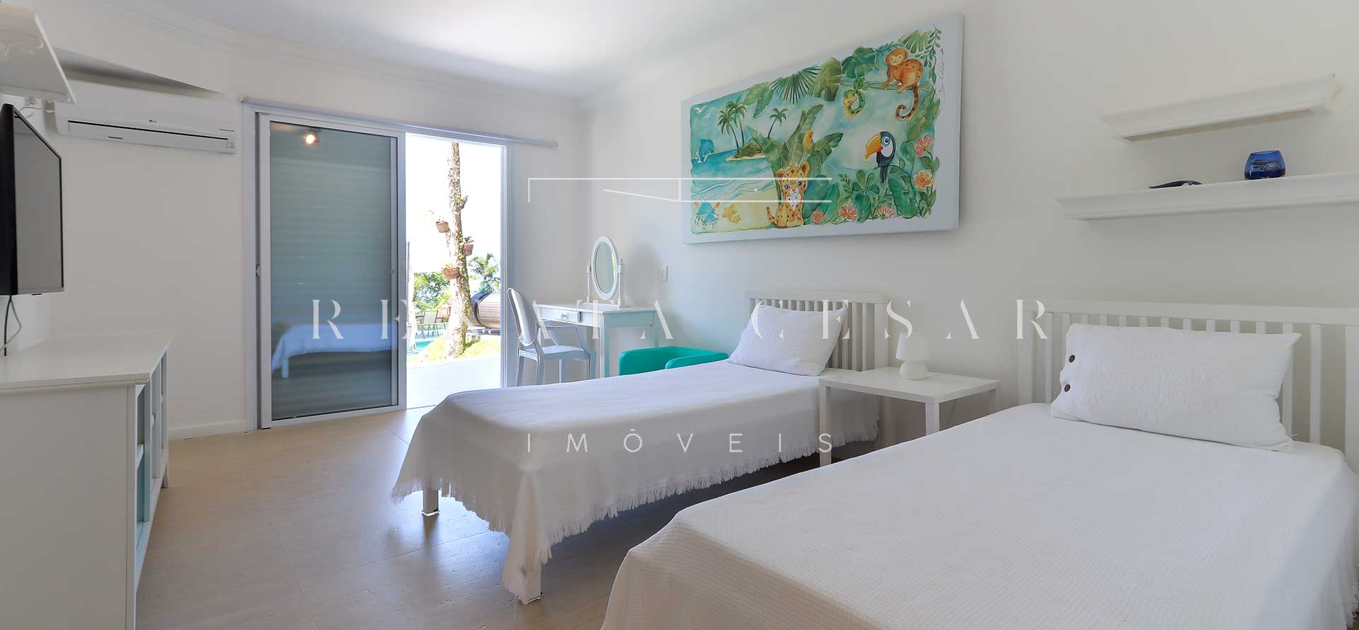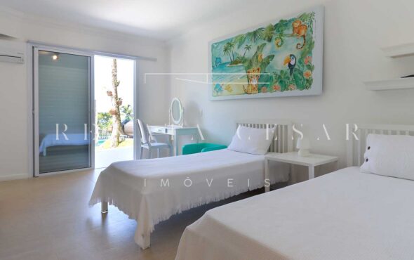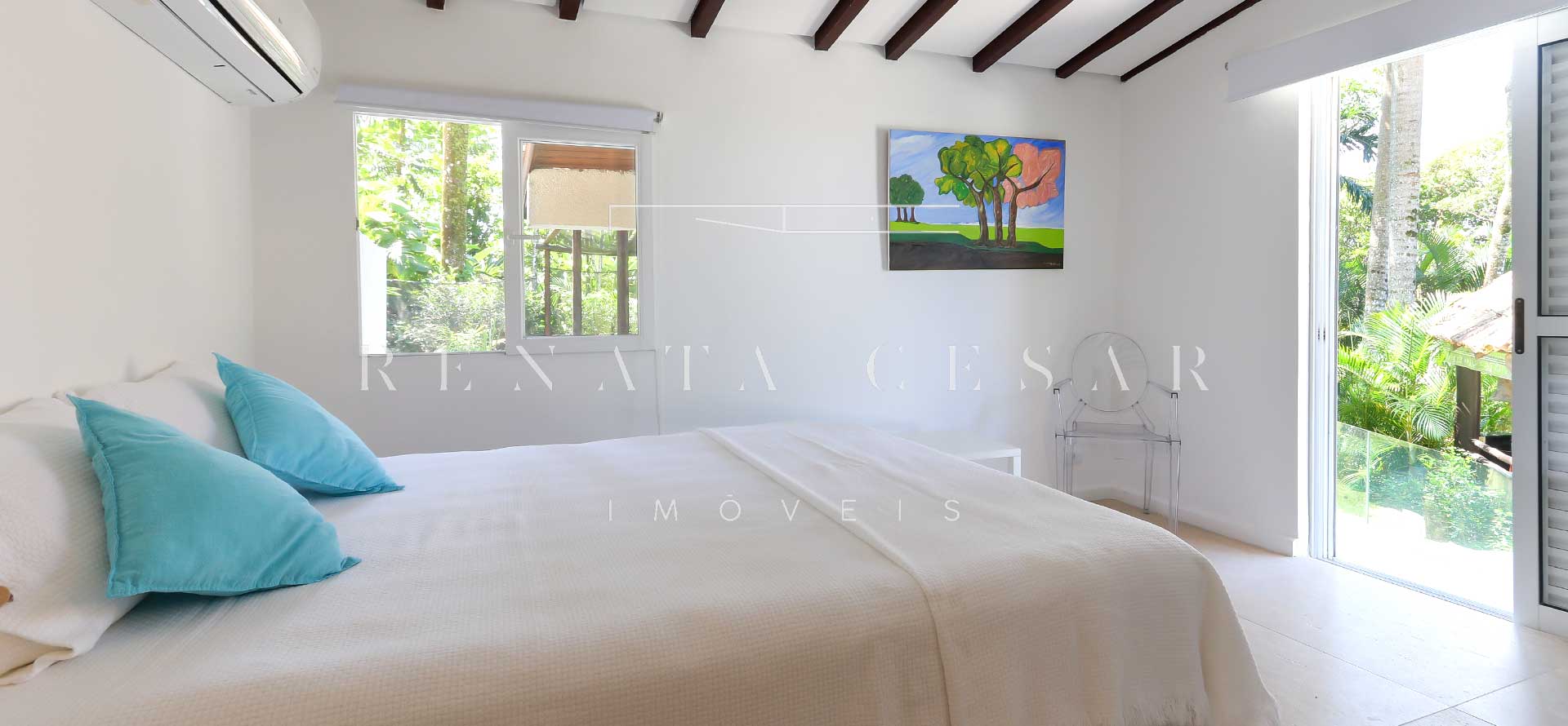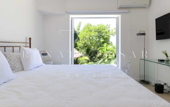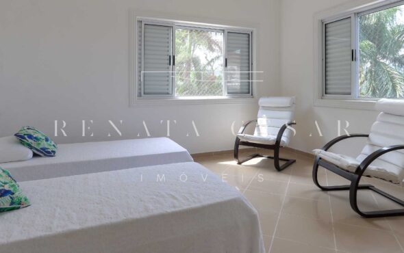A casa conta com 06 dormitórios, sendo 05 suítes, quase todas no piso térreo, no parte lateral do piso social. São quartos aconchegantes, clean, e três deles com uma vista gostosa para a área da piscina. Subindo mais um piso, encontra-se a suíte principal, que tem armários planejados, um canto para escritório e um terraço com vista-mar. Há ainda um quarto mais privativo no piso superior da casa, também com uma vista maravilhosa para o oceano.