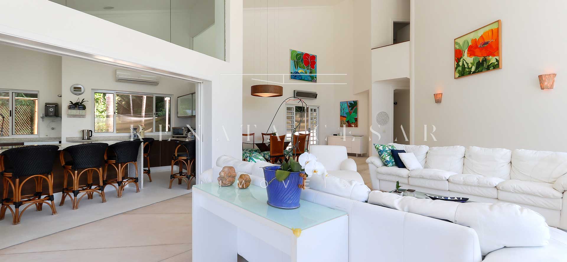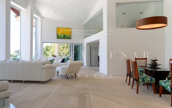 A área social da casa tem um pé-direito muito alto e um design clean e elegante. Sala de estar, jantar e cozinha com ilha dividem um mesmo ambiente amplo e cheio de luz natural.