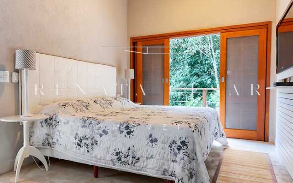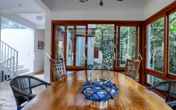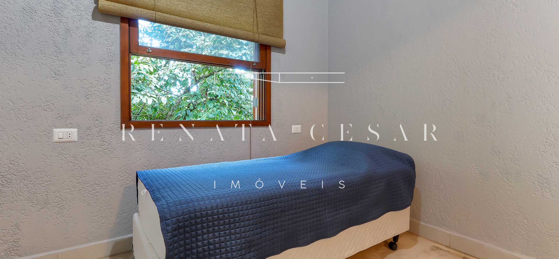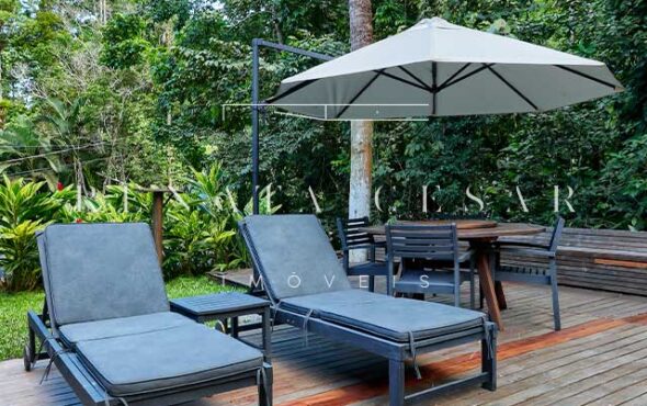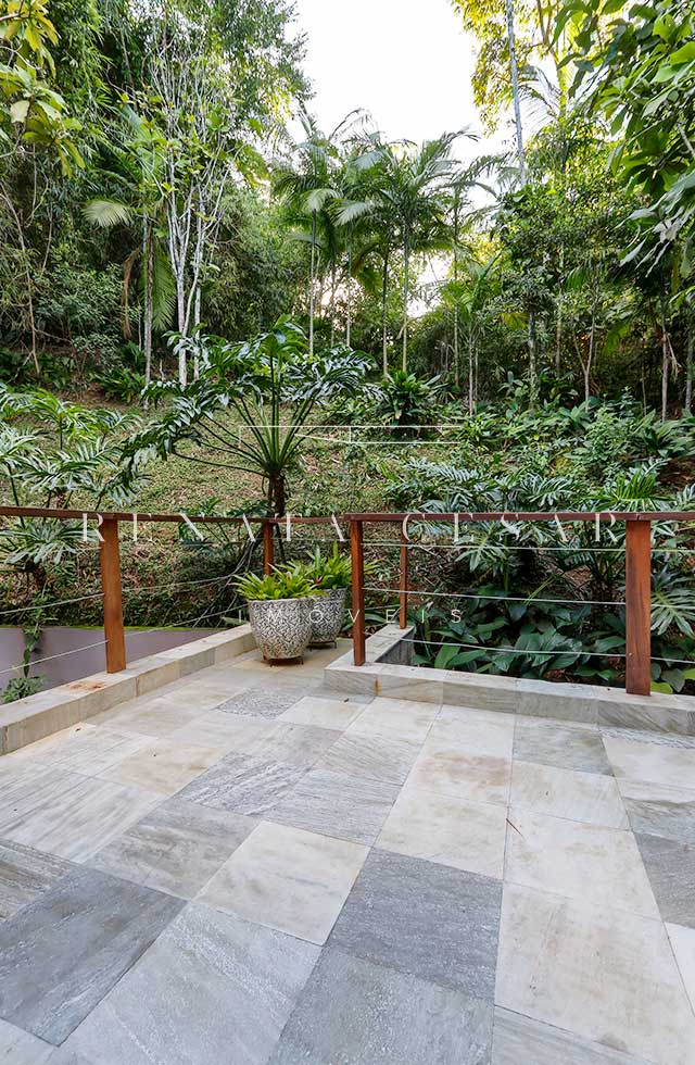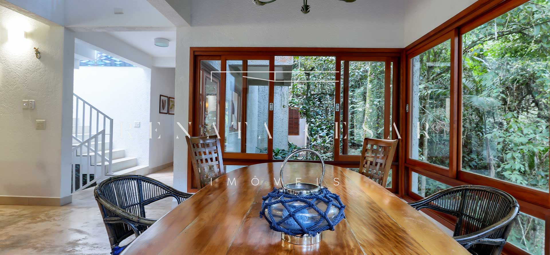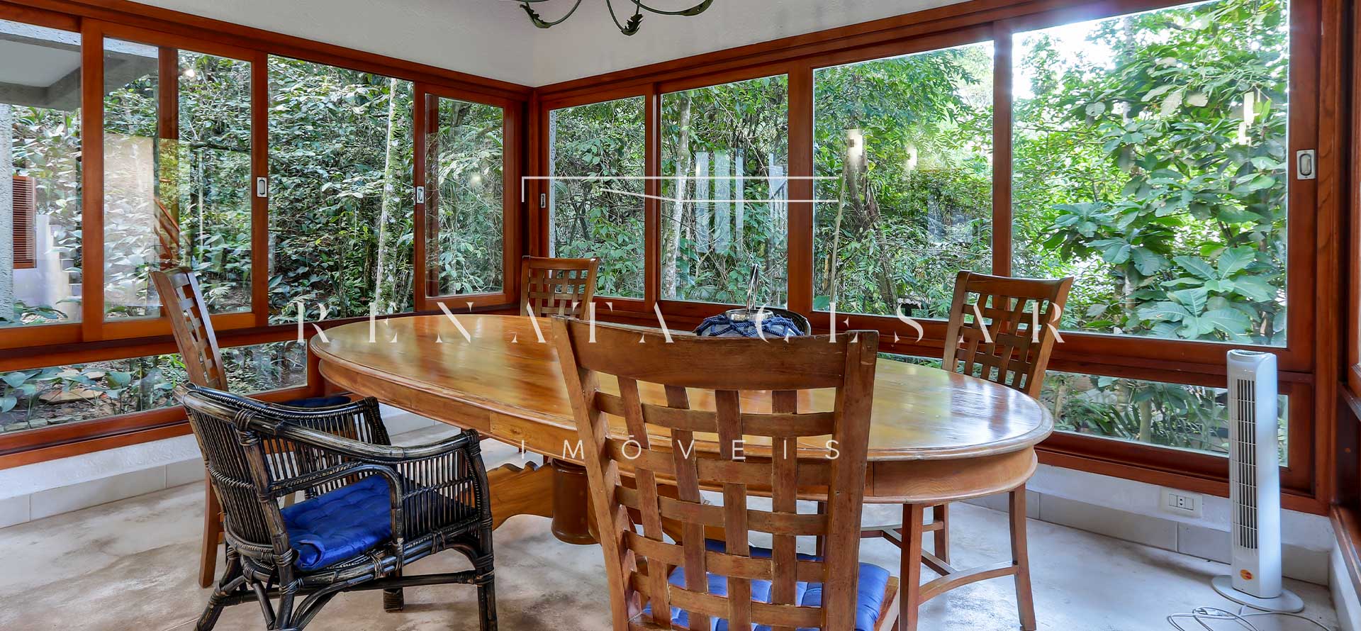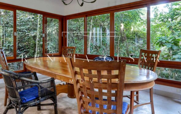 Todos os ambientes estão muito bem servidos com janelões e, por consequência, servidos de Mata Atlântica também. Imagina suas refeições em família como se estivessem flutuando sobre o verde? E acordar com o som do vento nas árvores? E sair na varanda da suíte onde não há nenhum cinza à vista: só o lindo azul da piscina e as belas árvores?