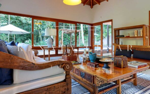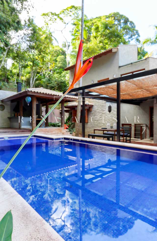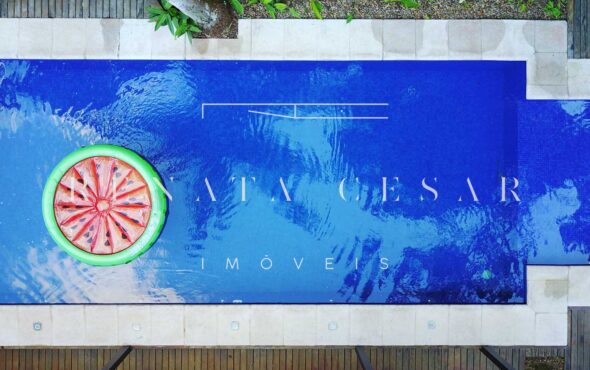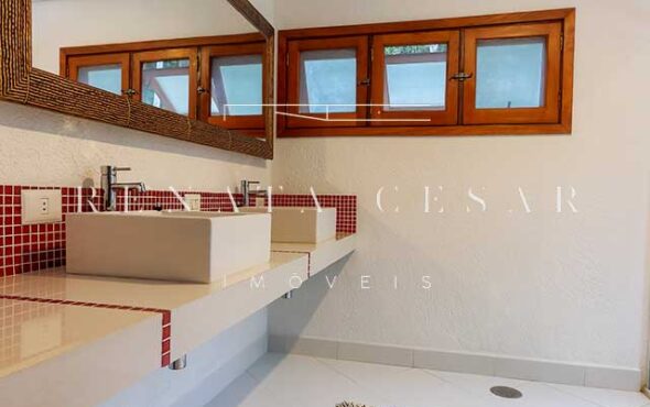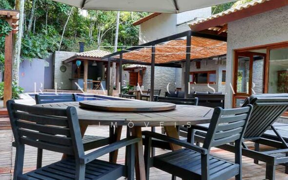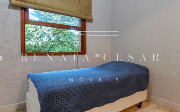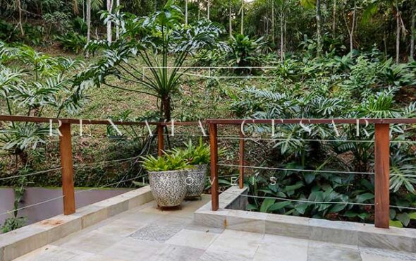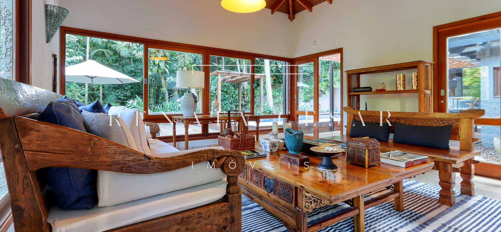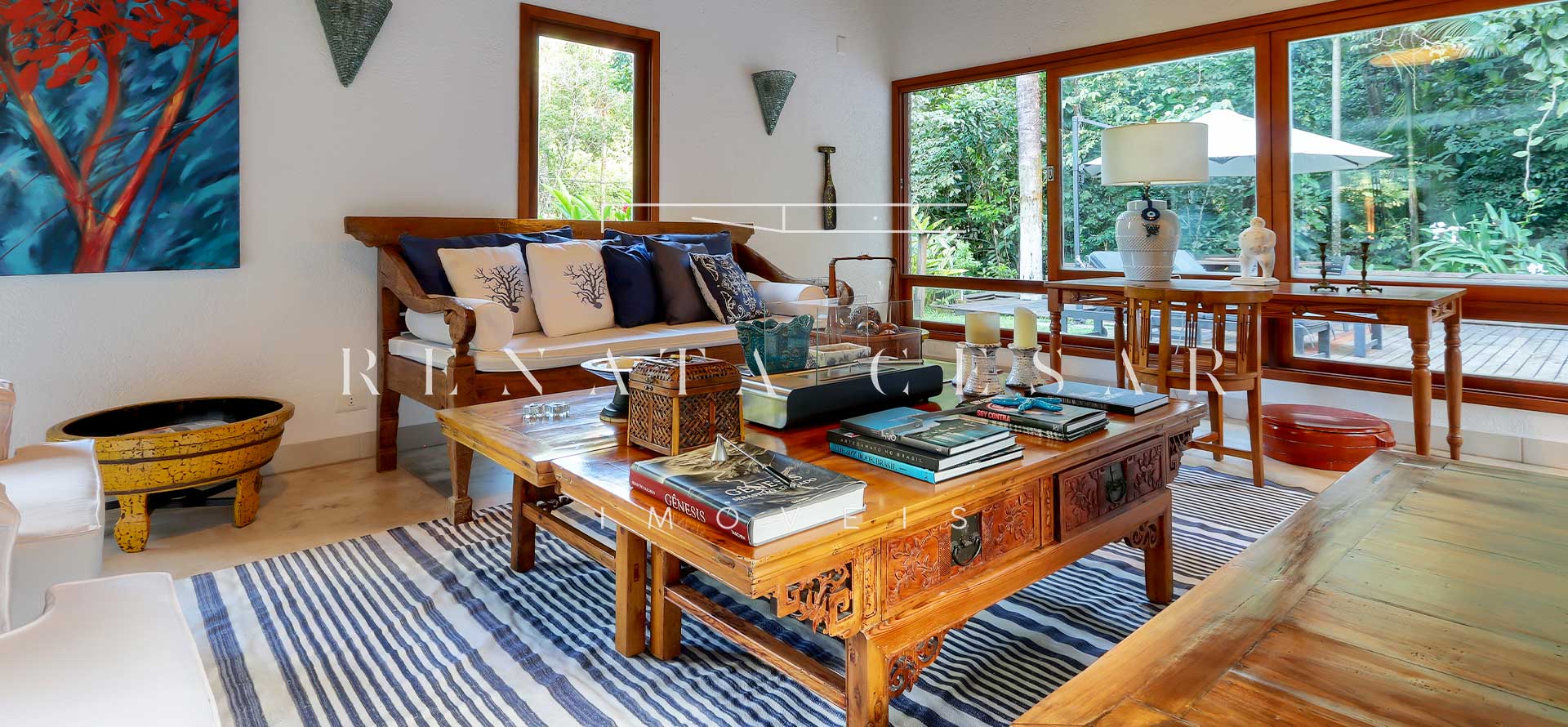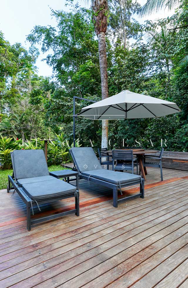 Todos os ambientes estão muito bem servidos com janelões e, por consequência, servidos de Mata Atlântica também. Imagina suas refeições em família como se estivessem flutuando sobre o verde? E acordar com o som do vento nas árvores? E sair na varanda da suíte onde não há nenhum cinza à vista: só o lindo azul da piscina e as belas árvores?