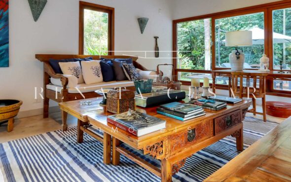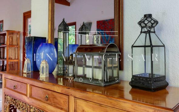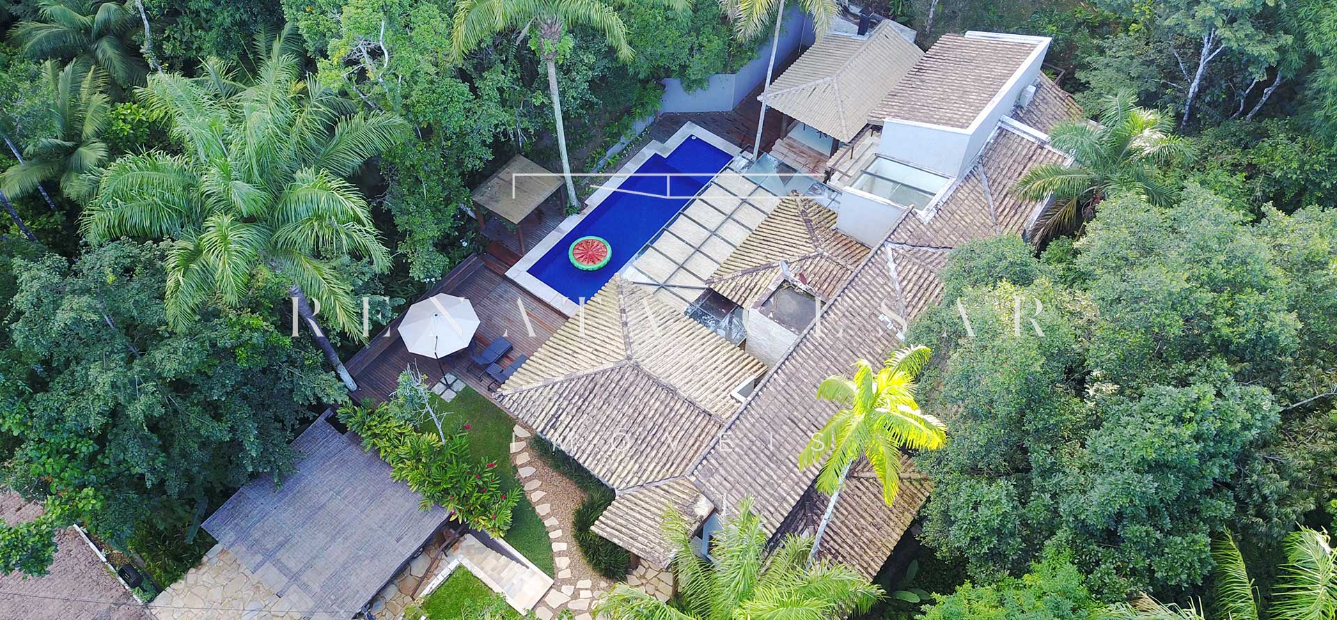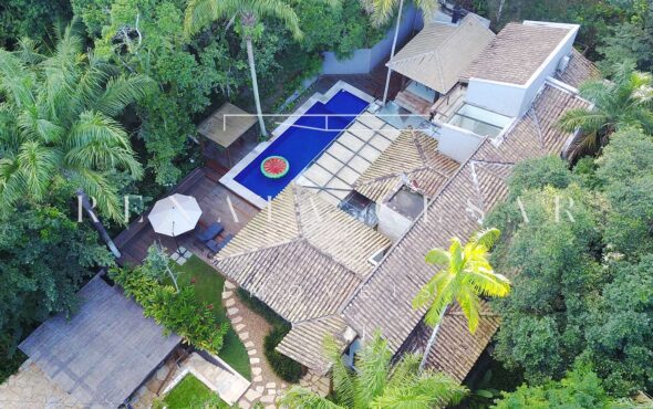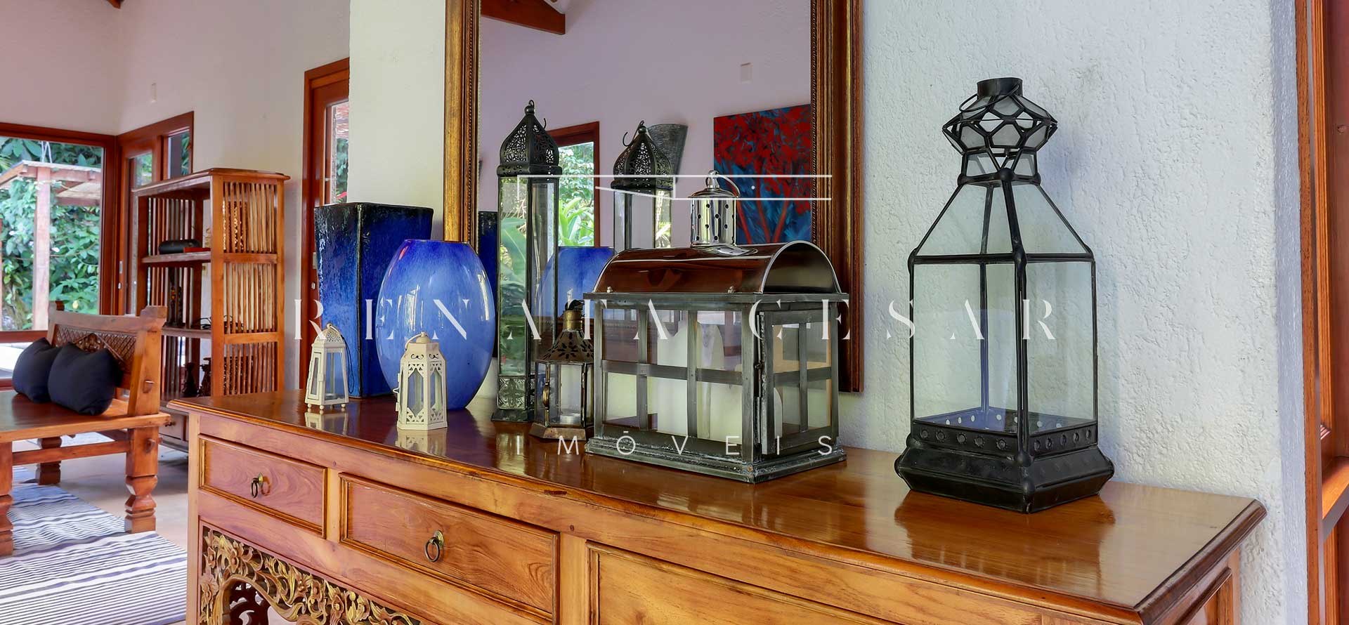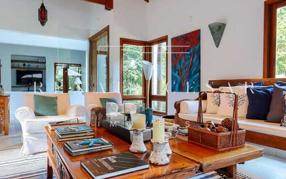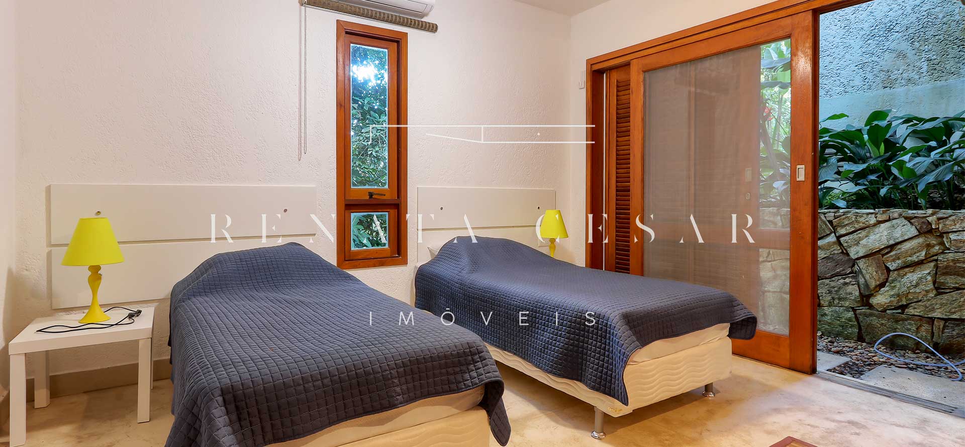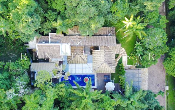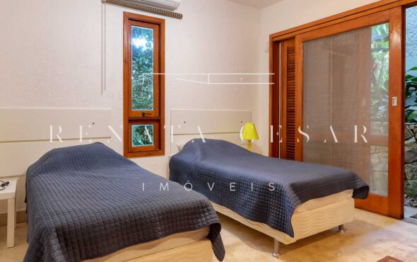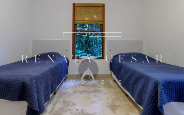 Todos os ambientes estão muito bem servidos com janelões e, por consequência, servidos de Mata Atlântica também. Imagina suas refeições em família como se estivessem flutuando sobre o verde? E acordar com o som do vento nas árvores? E sair na varanda da suíte onde não há nenhum cinza à vista: só o lindo azul da piscina e as belas árvores?
