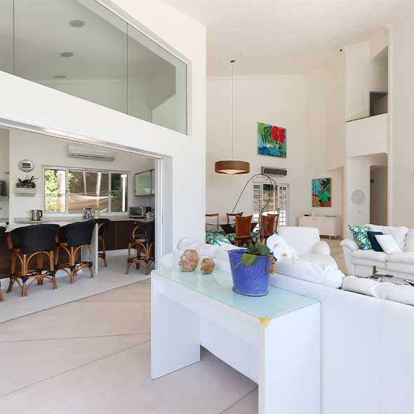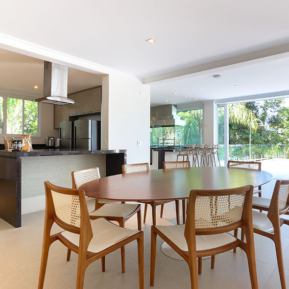 Uma fluidez e amplitude impressionante dominam os ambientes da casa, especialmente na área social, que integra o living com sala de estar e jantar ao terraço gourmet.