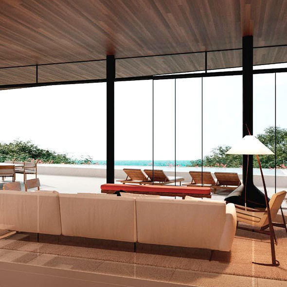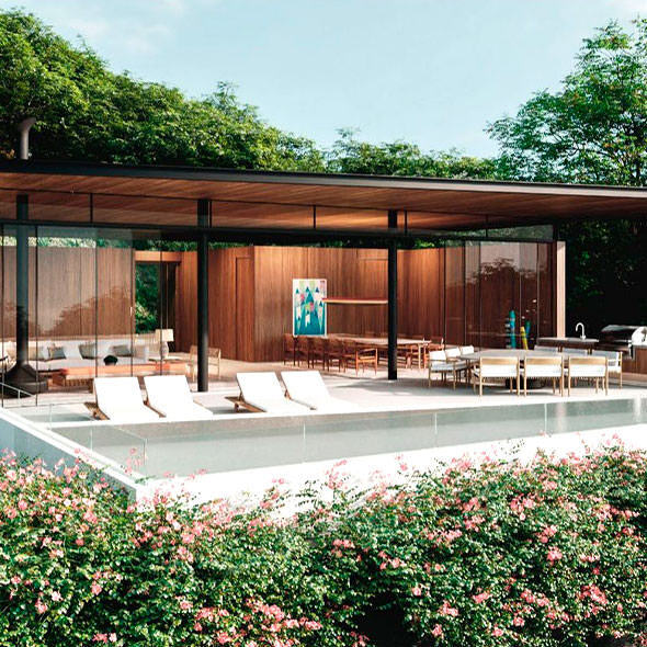 Uma fluidez e amplitude impressionante dominam os ambientes da casa, especialmente na área social, que integra o living com sala de estar e jantar ao terraço gourmet. Nesse mesmo andar térreo fica a cozinha completa com copa e uma área externa completa. Muita luz natural, grandes aberturas com portas e janelas e um design clean criam a atmosfera perfeita para relaxar e se divertir.
