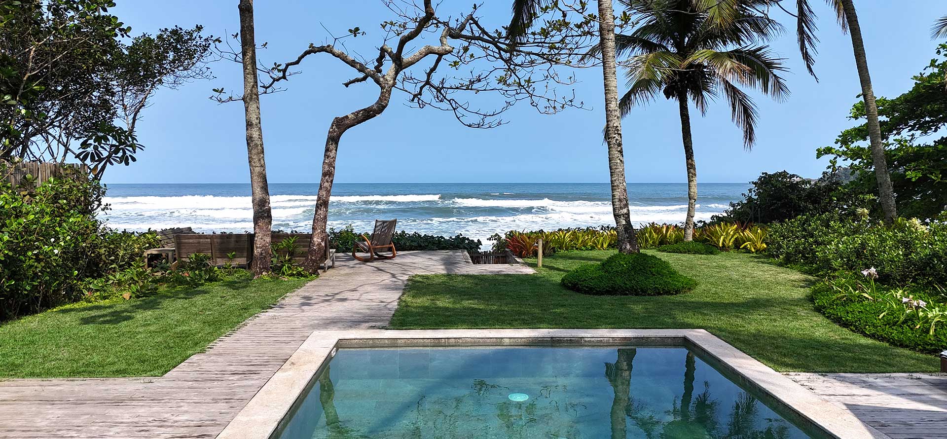 Uma área externa linda te espera, com piscina, jardim, espaços para sentar e apreciar a vista e uma escadinha que te leva direto para o meio da Praia de Taguaíba. A sensação geral é de conforto e relaxamento, com tudo que você precisa para viver dias mais tranquilos na natureza.