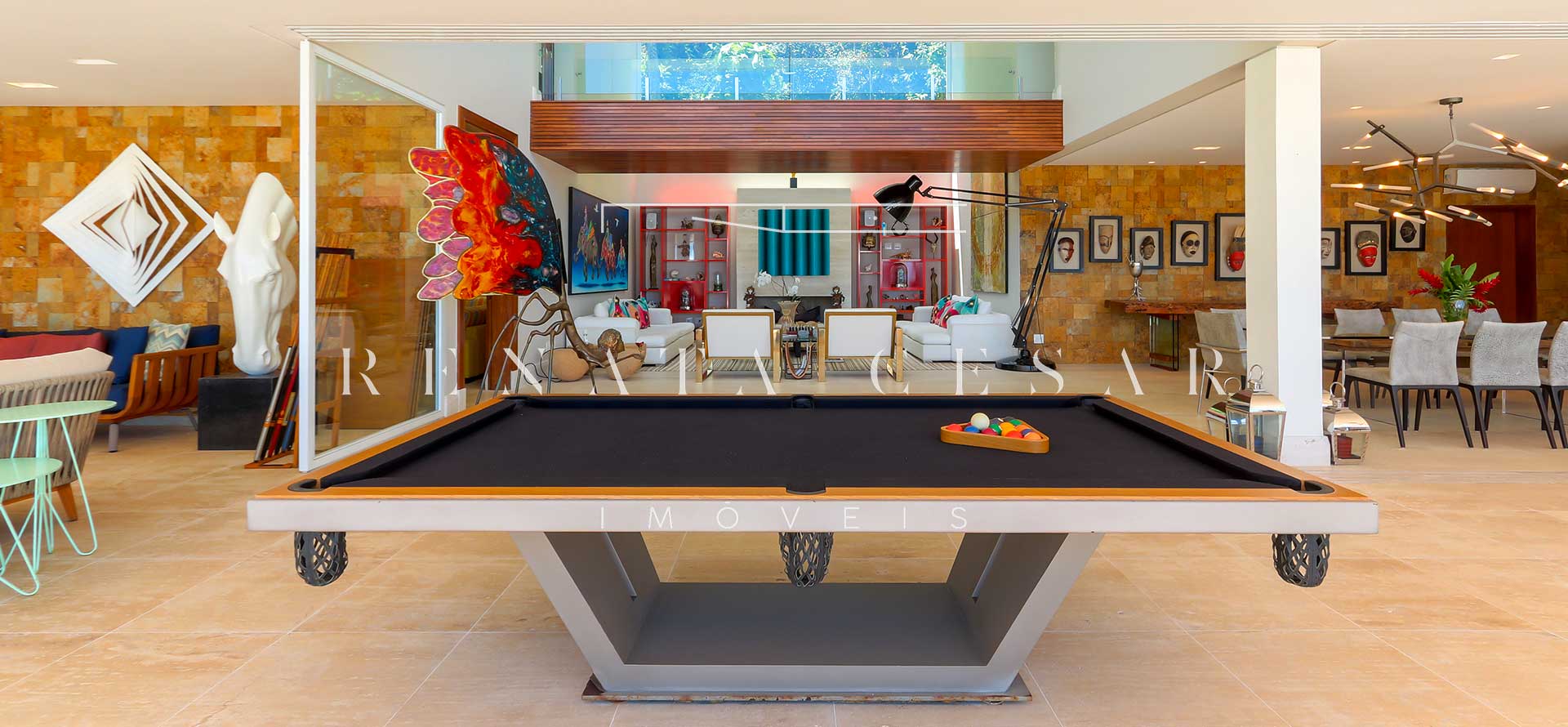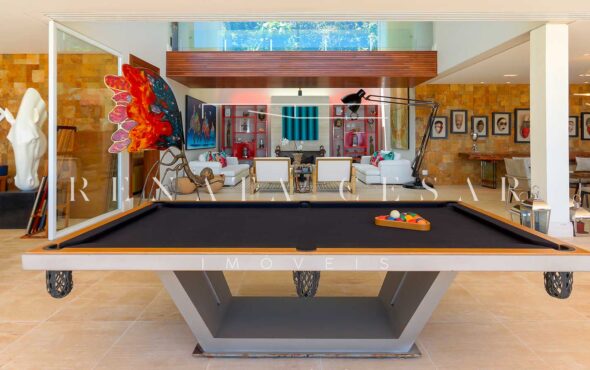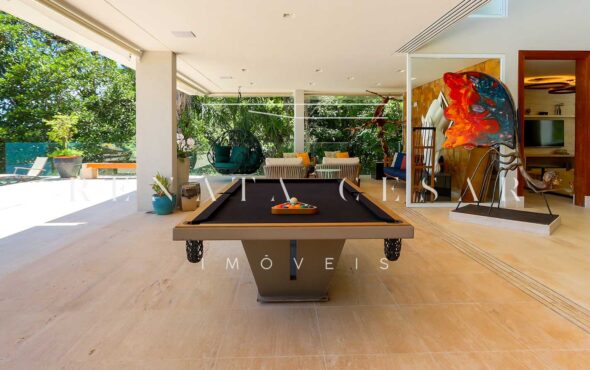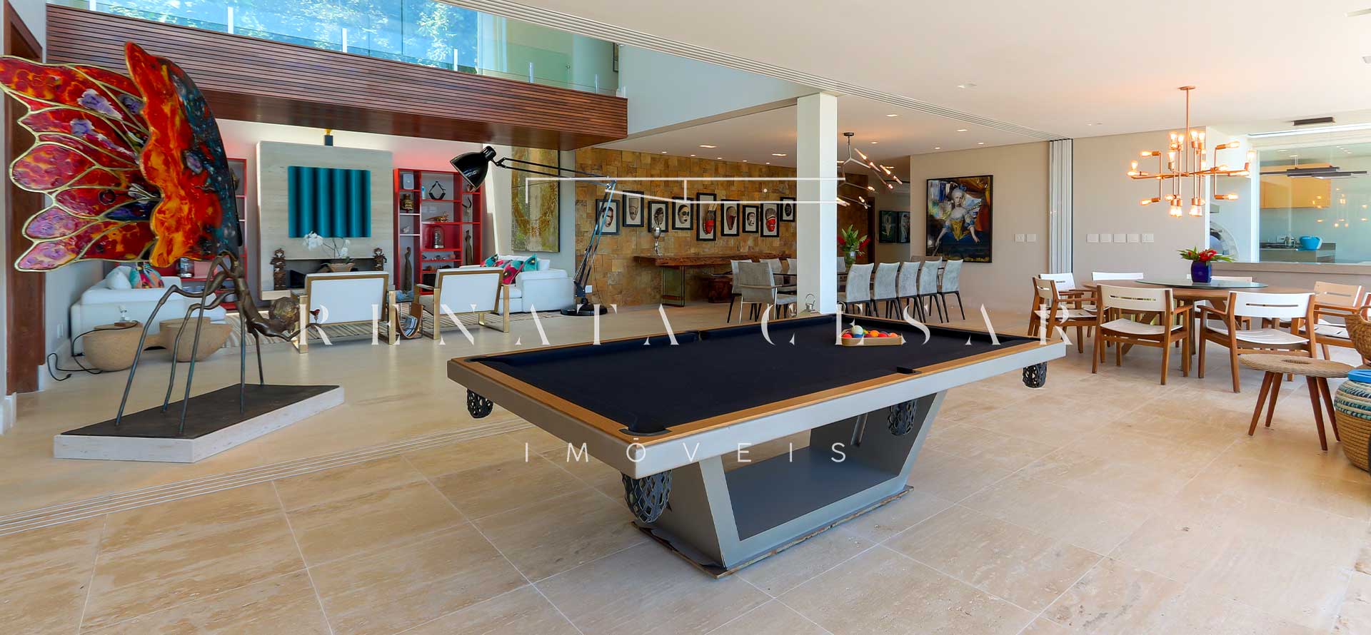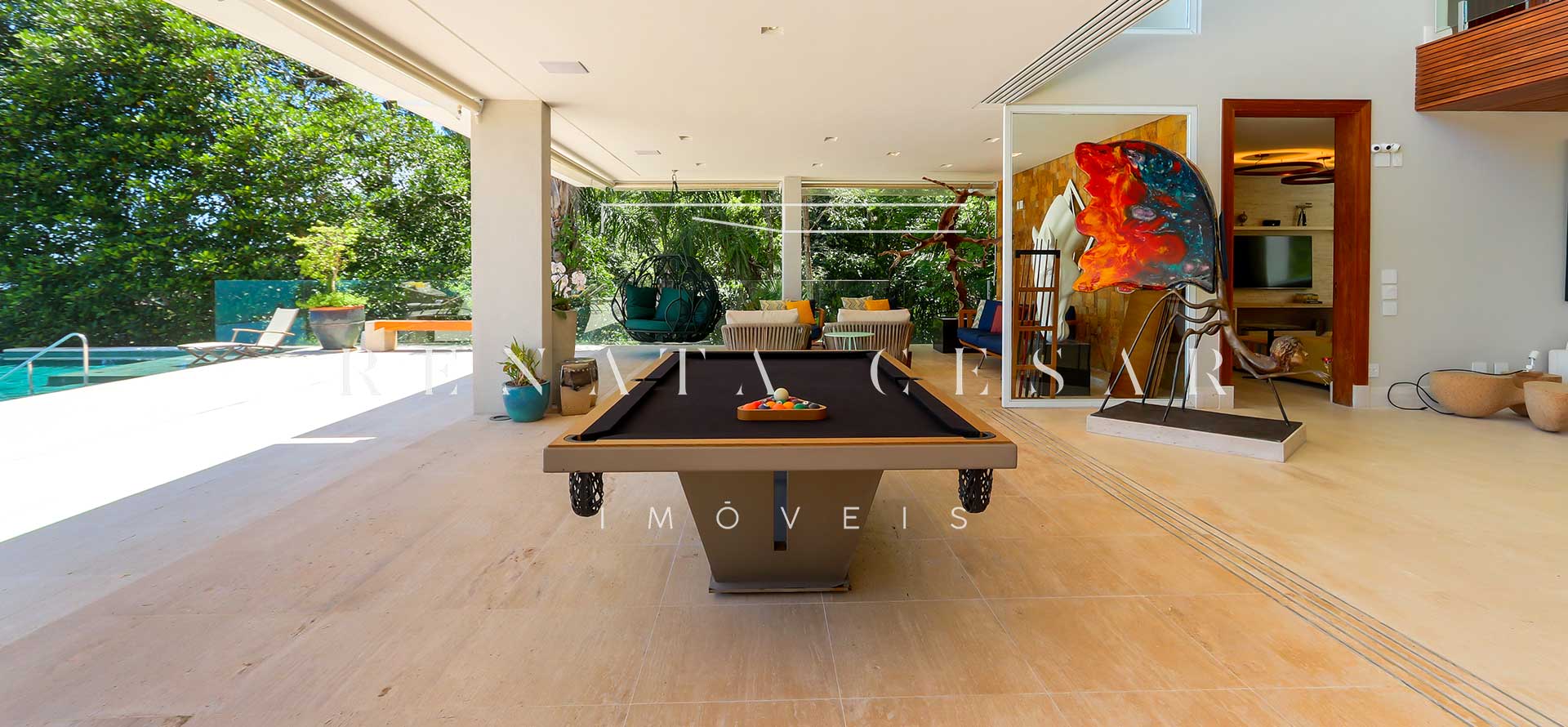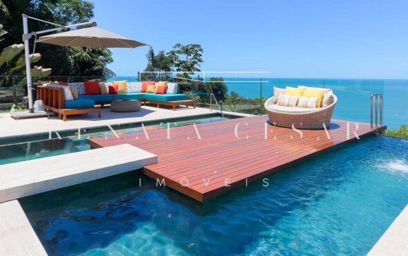 Ver foto na galeriaSeja pela mata, pelo mar, pelo céu, ou pelo design: tudo nesta casa comunica sofisticação e conforto. Há um living integrado com pé-direito duplo, sala de estar e jantar, mesa de bilhar e capricho em todos os detalhes. O home theater é enorme, assim como a cozinha gourmet que tem vista para a área externa.
