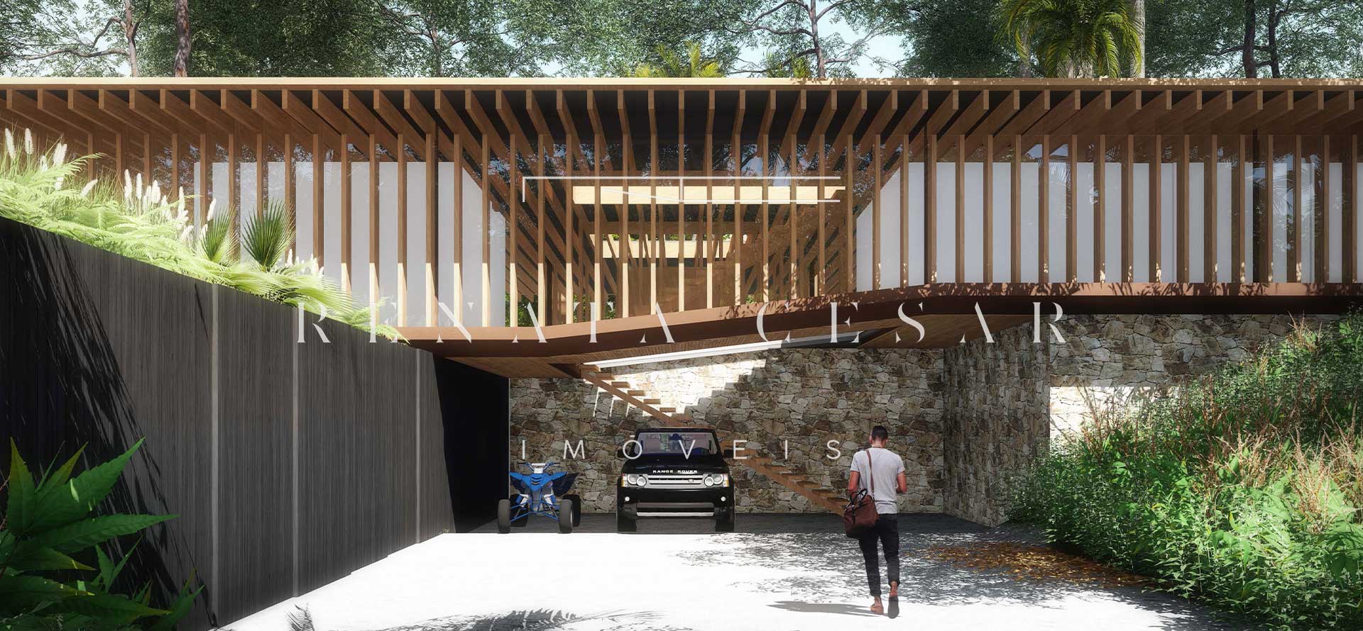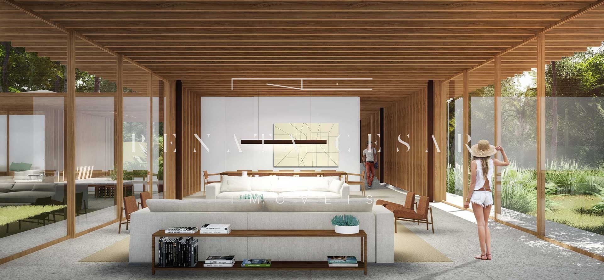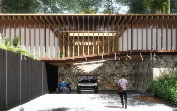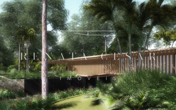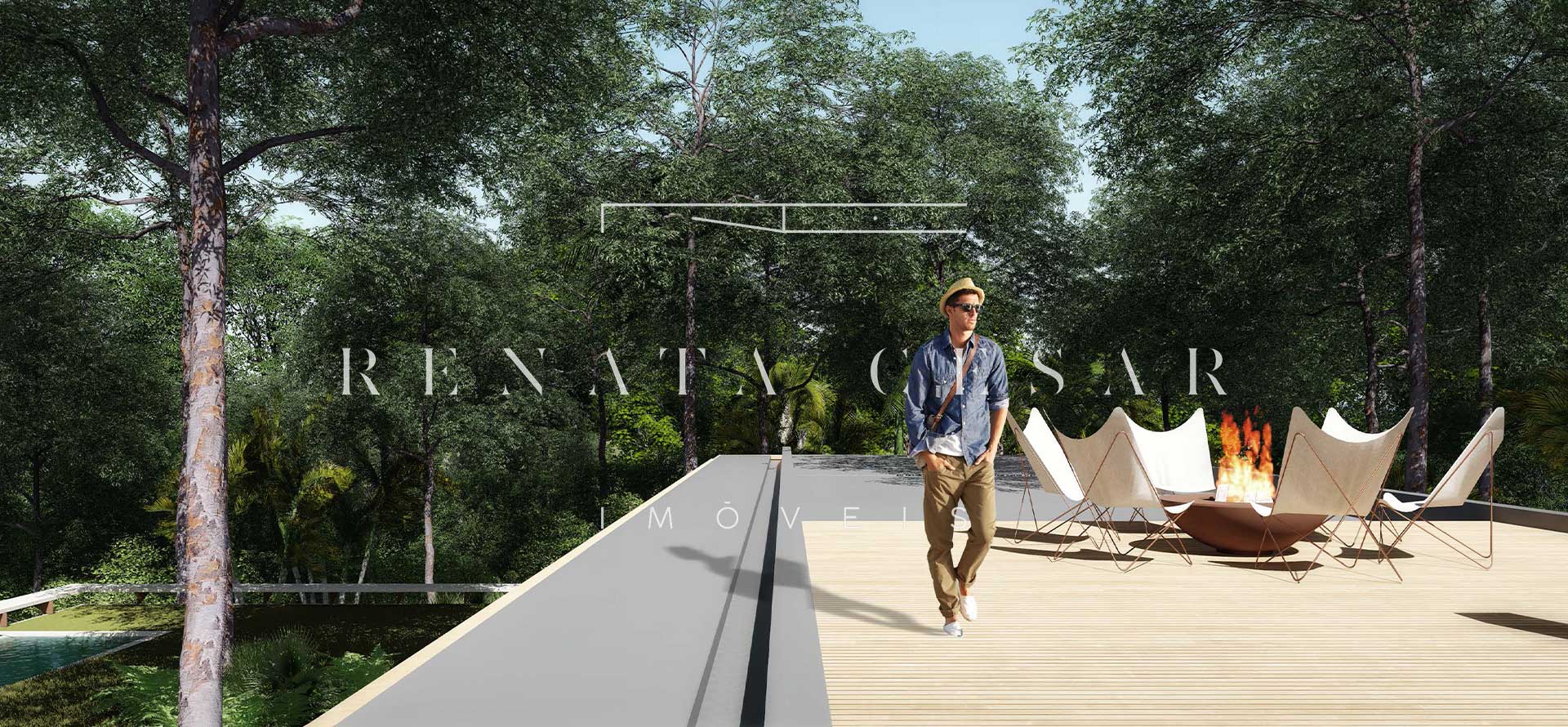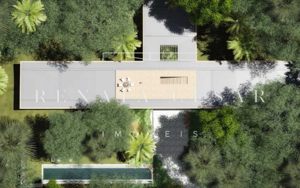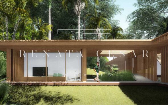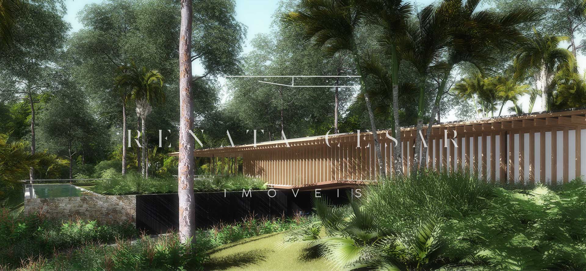 A extensão nada comum de 9 mil m² torna este terreno um produto único no mercado. Localizado numa rua sem saída, ensolarado, ao lado direito de uma reserva, com privacidade e tranquilidade total. O projeto faz questão de distribuir os ambientes de forma a criar diferentes vivências e áreas para a residência: há vários terraços, uma piscina mais afastada com abraço da mata e um verdadeiro mergulho na natureza com o projeto de paisagismo de Isabel Duprat.