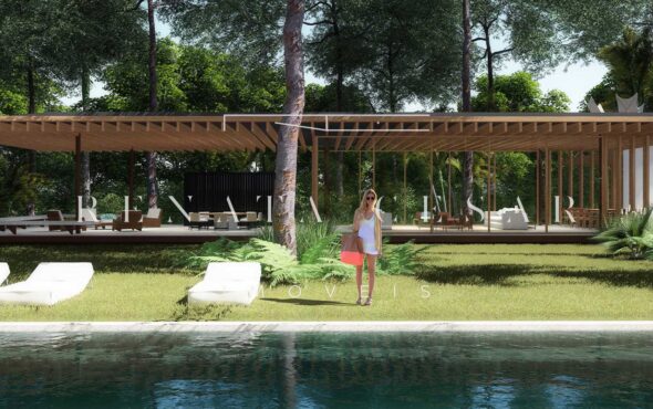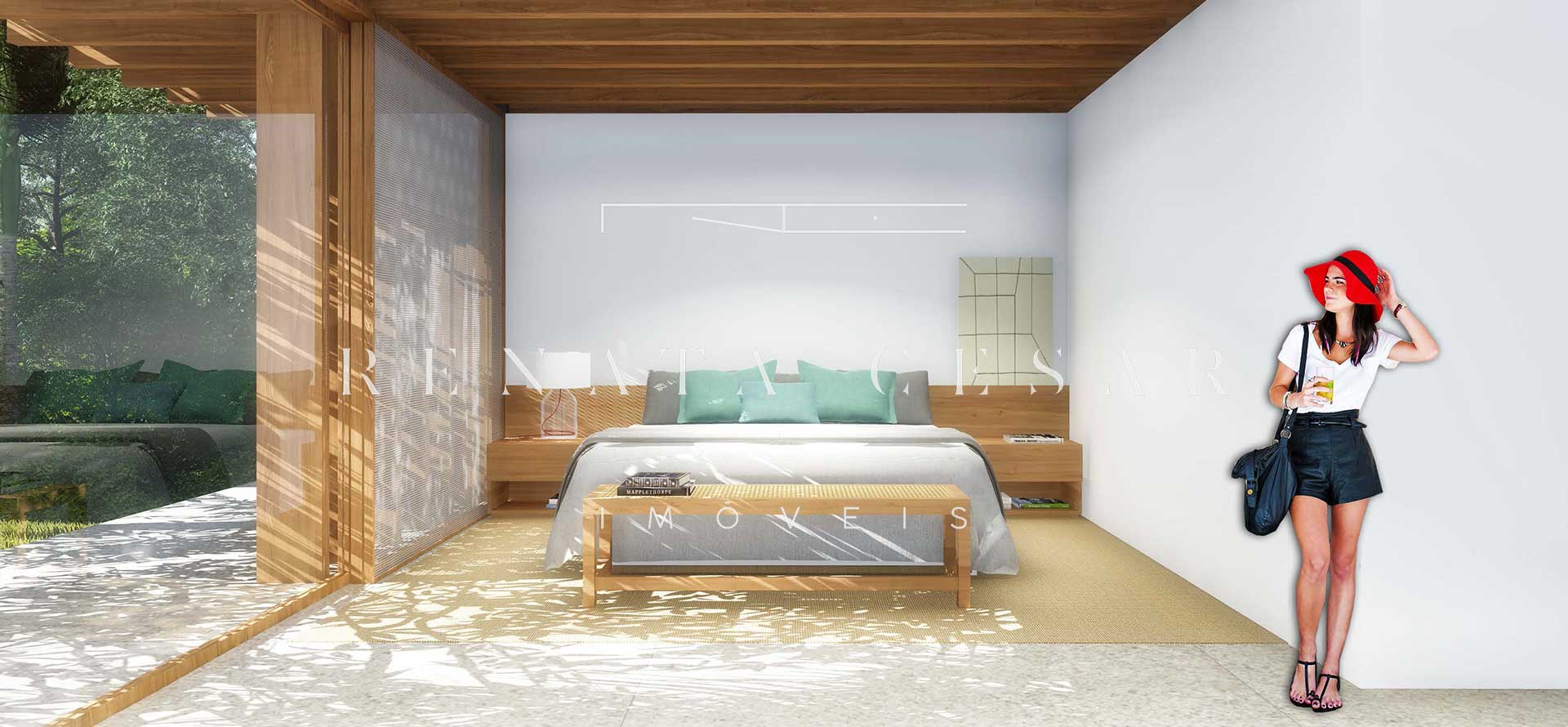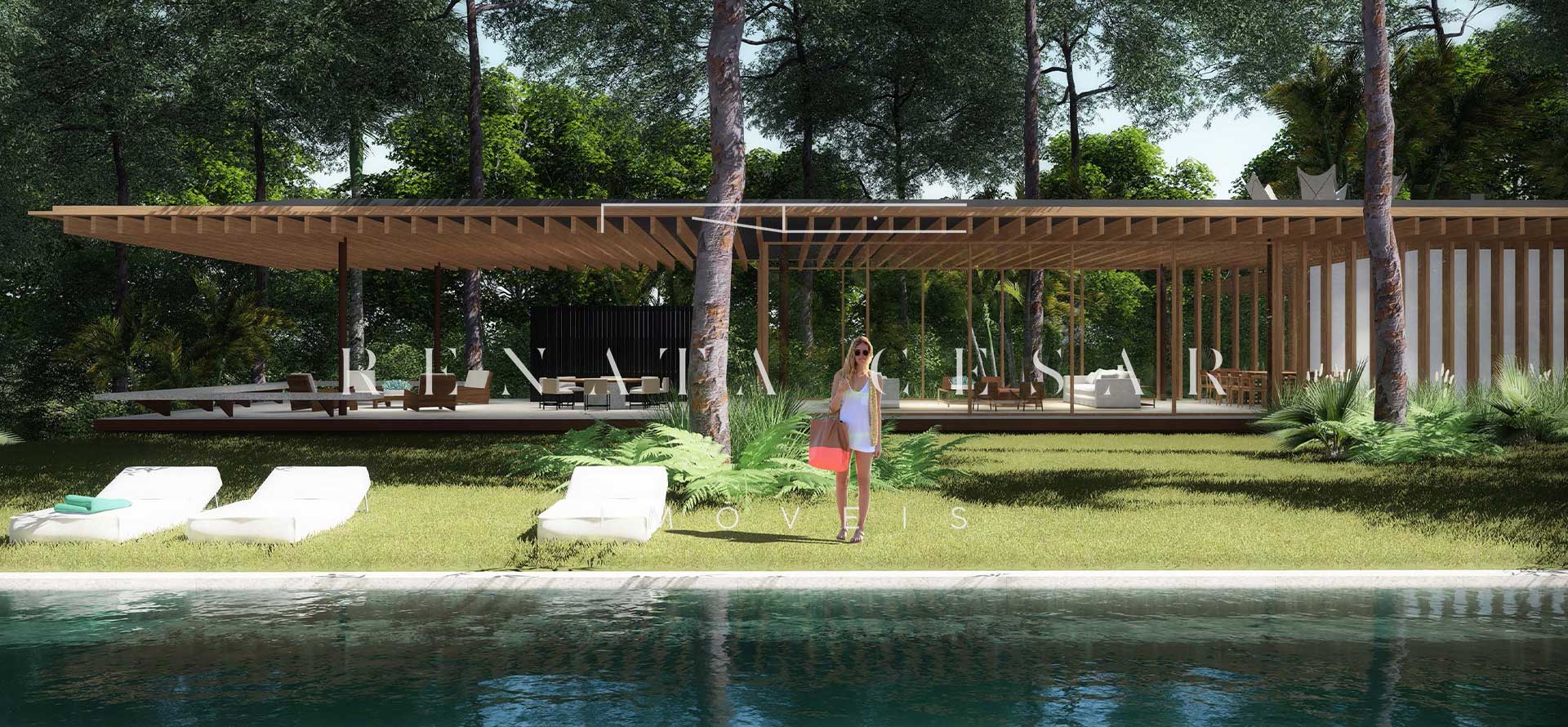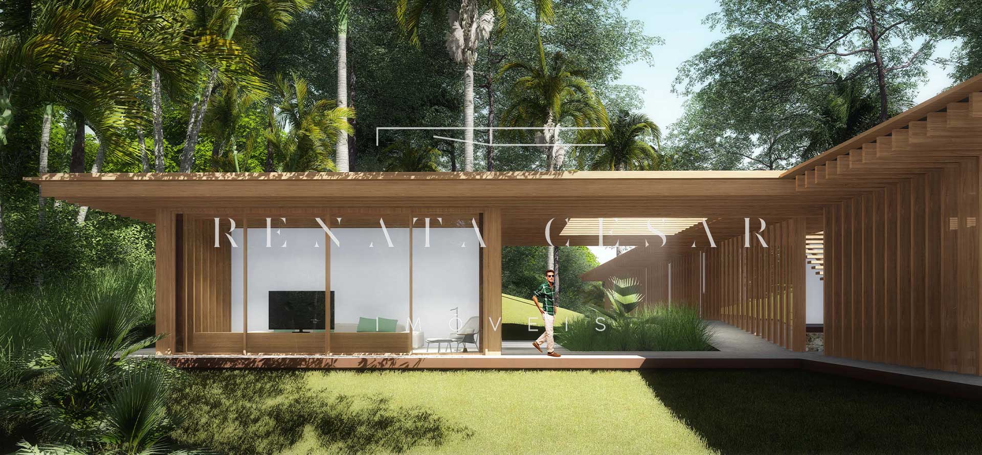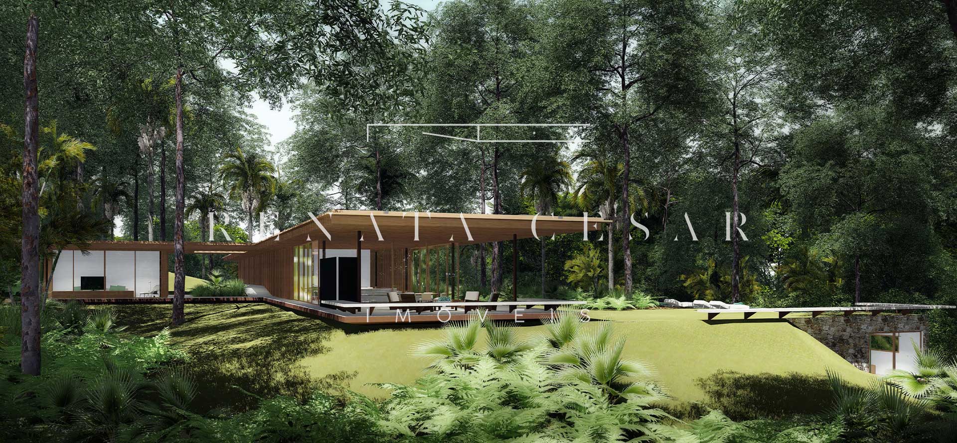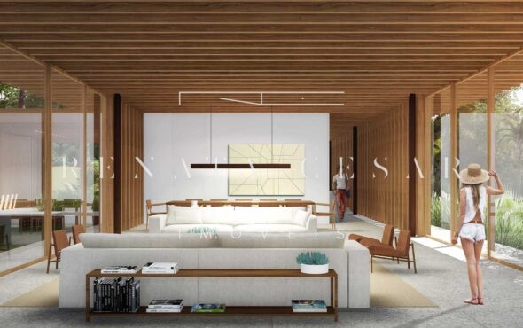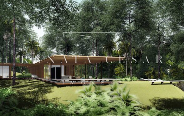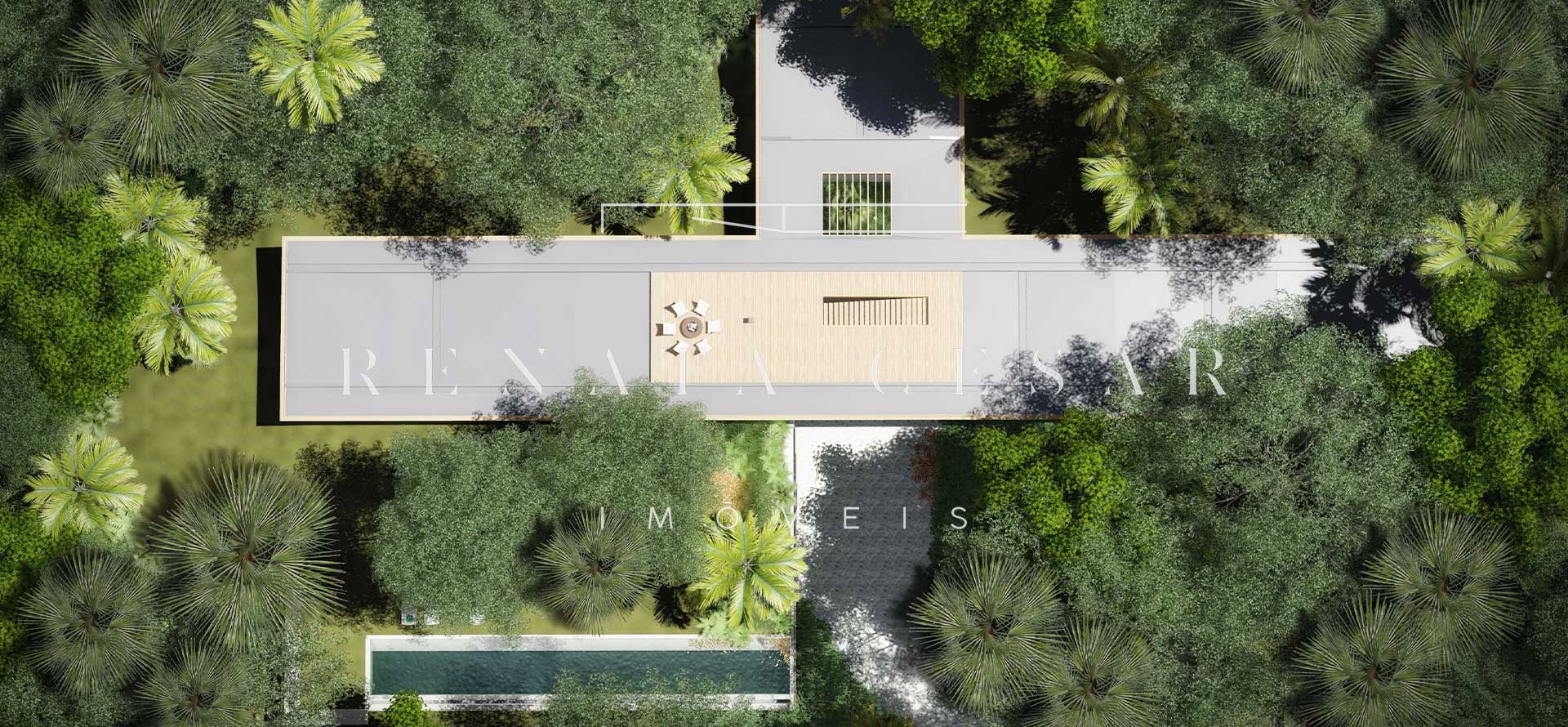 A extensão nada comum de 9 mil m² torna este terreno um produto único no mercado. Localizado numa rua sem saída, ensolarado, ao lado direito de uma reserva, com privacidade e tranquilidade total. O projeto faz questão de distribuir os ambientes de forma a criar diferentes vivências e áreas para a residência: há vários terraços, uma piscina mais afastada com abraço da mata e um verdadeiro mergulho na natureza com o projeto de paisagismo de Isabel Duprat.