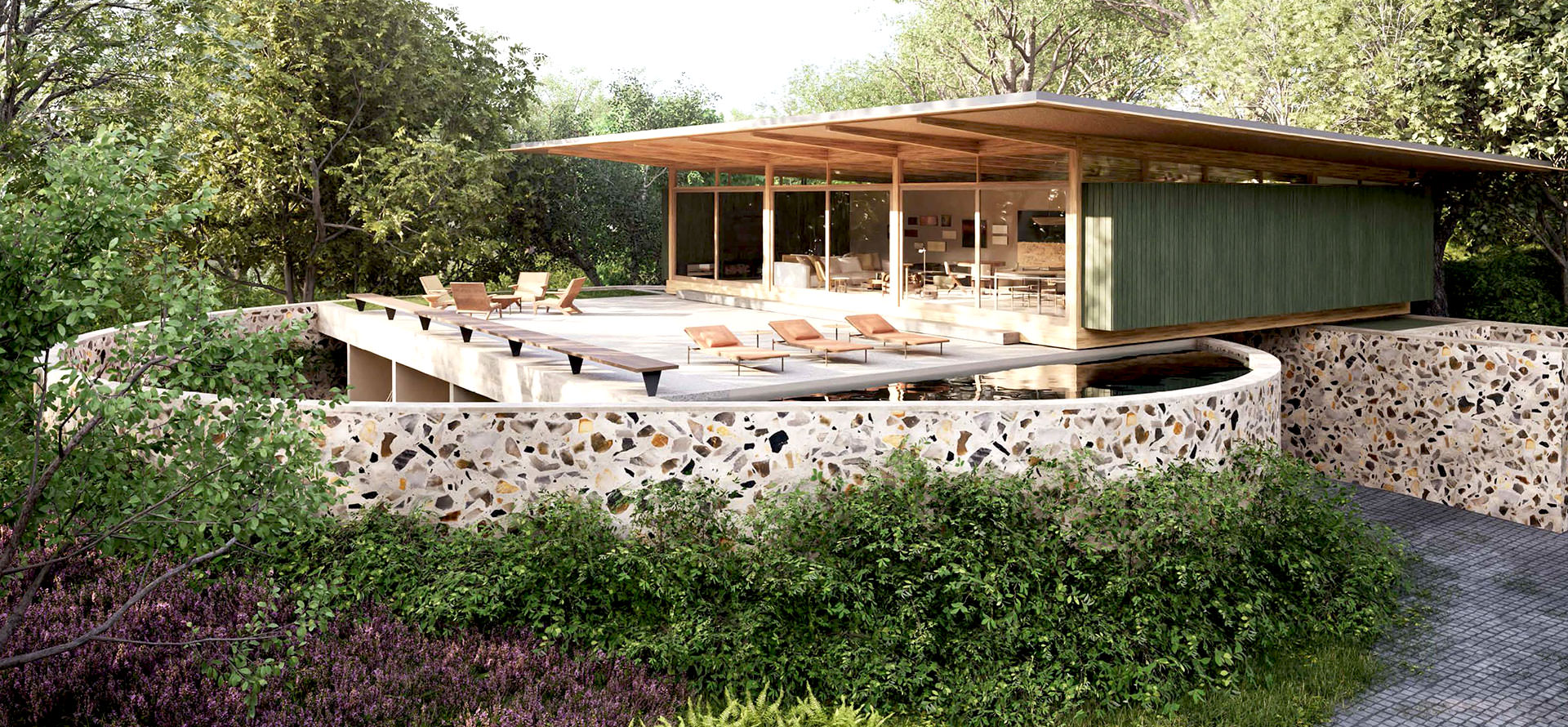 O projeto prevê uma casa ampla, moderna e muito aberta à natureza. O design contemporâneo não deixa de lado materiais naturais como a madeira, tijolos e pedras, misturando texturas diversas. No piso térreo há uma área social com living, sala de jantar e estar, sala de TV e cozinha completa com despensa, além de um lavabo. Esta área abre-se para a área externa ensolarada com deck, jardim e piscina.