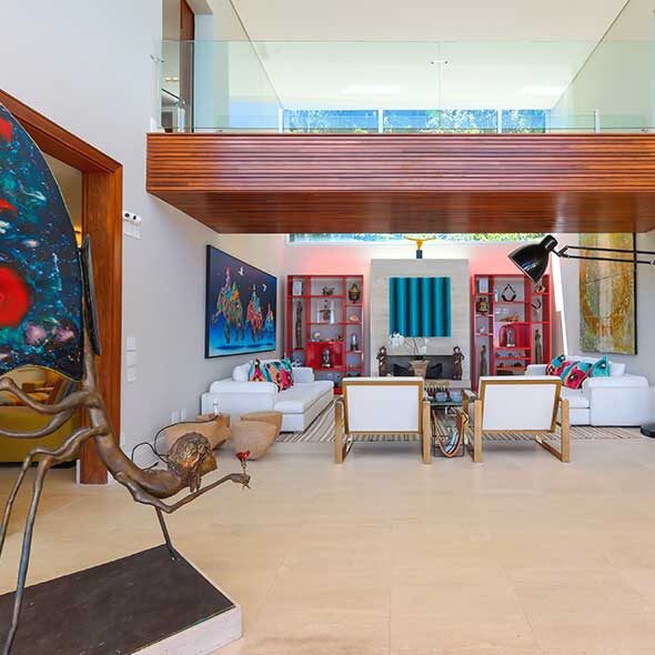 Estão previstas 05 suítes, sendo a principal muito espaçosa, com banheiro Sr. e Sra. Em todos os ambientes, janelões garantem a entrada de luz e a vista verde maravilhosa que circunda o terreno, garantindo também privacidade. Espere por um lazer completo que possui sauna, academia e uma área ótima para reunir em torno do fogo de chão.