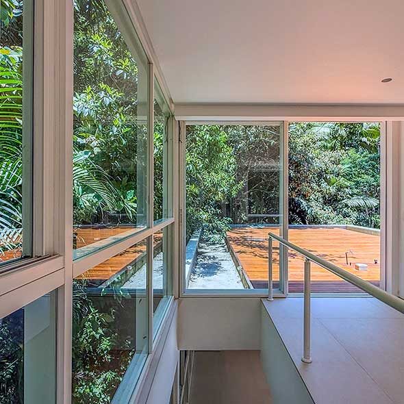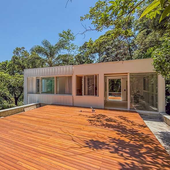 Uma casa que é pura beleza amadeirada abraçada à mata do Condomínio Tijucopava